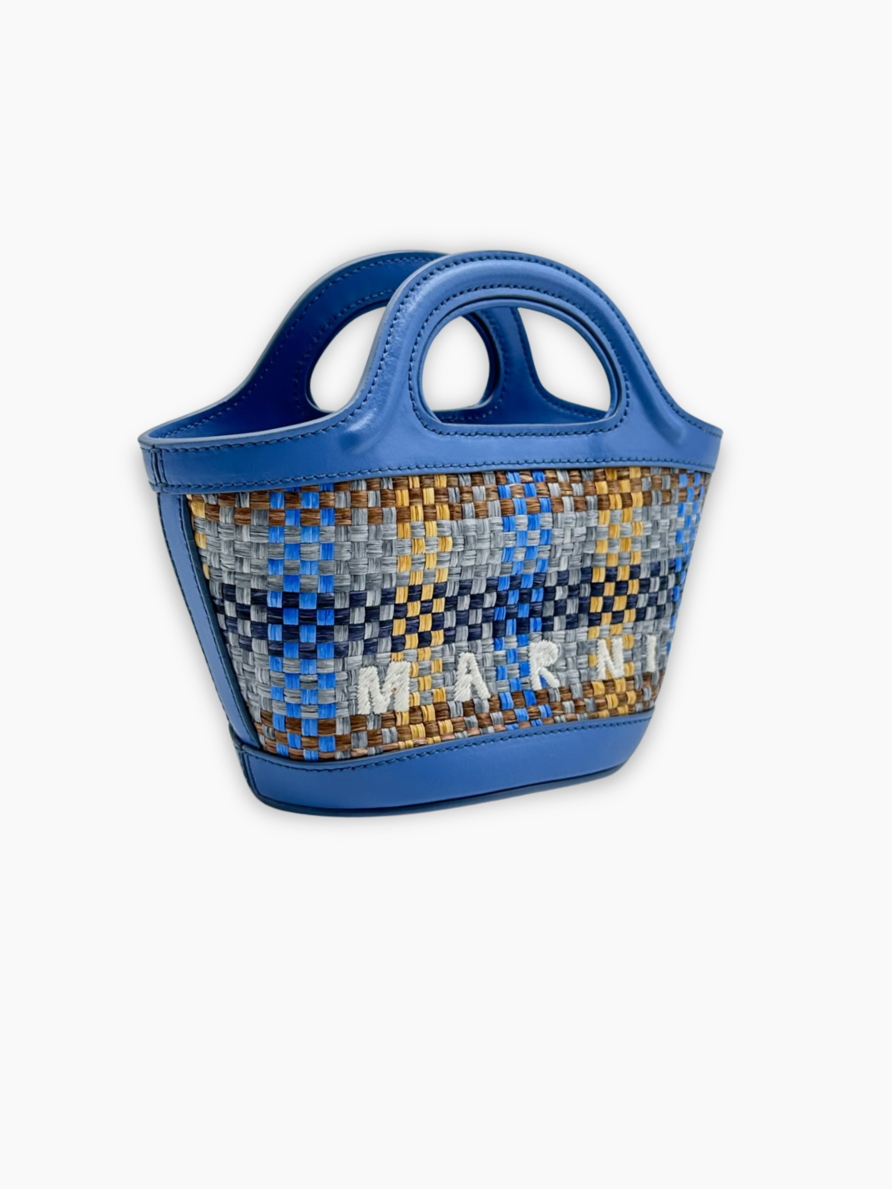This small Marni bag combines fresh design and quality craftsmanship. Crafted from blue, brown, and gray raffia, it features light blue leather handles and trim. The red embroidered logo on the front adds a distinctive touch, while the adjustable leather shoulder strap allows for versatile use. Compact yet functional, it's perfect for carrying essentials in style.