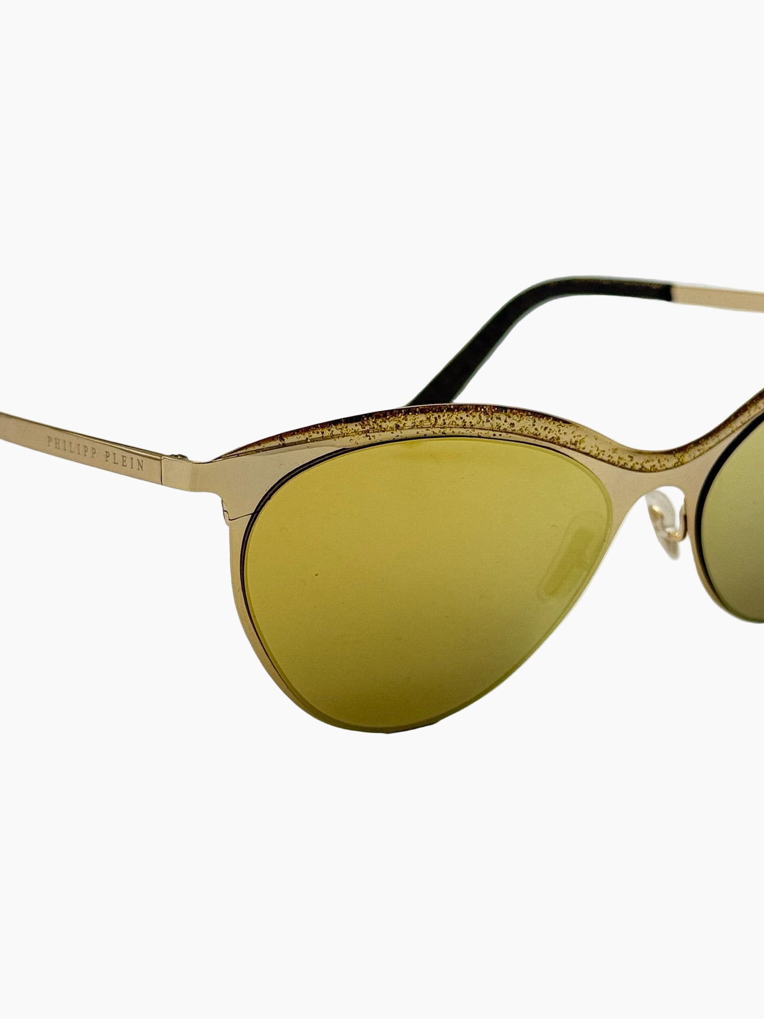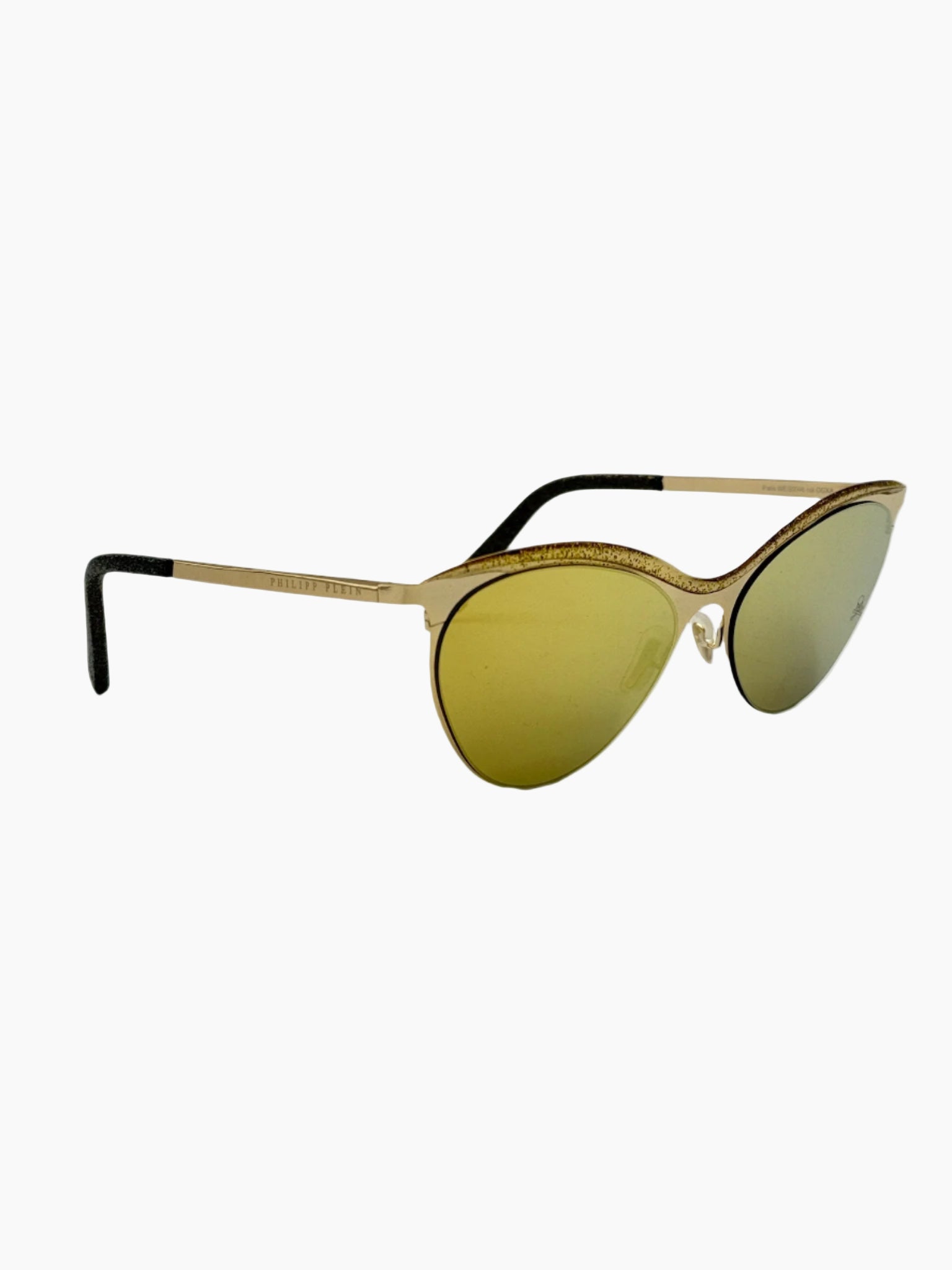 With a sharp and ultra-feminine design, these Philipp Plein sunglasses reinterpret the butterfly silhouette with a contemporary twist. The slim light gold frame is embellished with gold glitter on the top, while the yellow mirrored lenses add a bold and glamorous twist. A perfect accessory for those seeking a mix of luxury, assertiveness, and personality.