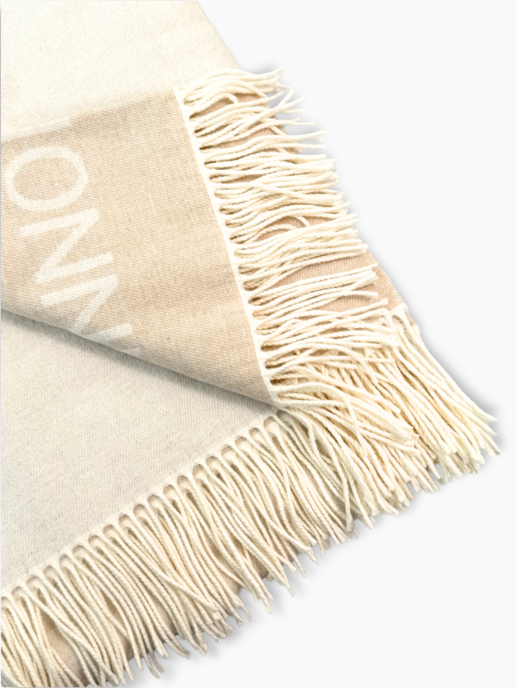 The Hinnominate poncho is the perfect accessory to complete cozy, contemporary looks. Crafted from a soft cotton and acrylic blend, it features a light and dark beige colorblock pattern with a contrasting logo and decorative fringe at the hem. A versatile piece, perfect for layering over coats or blazers in the colder seasons.