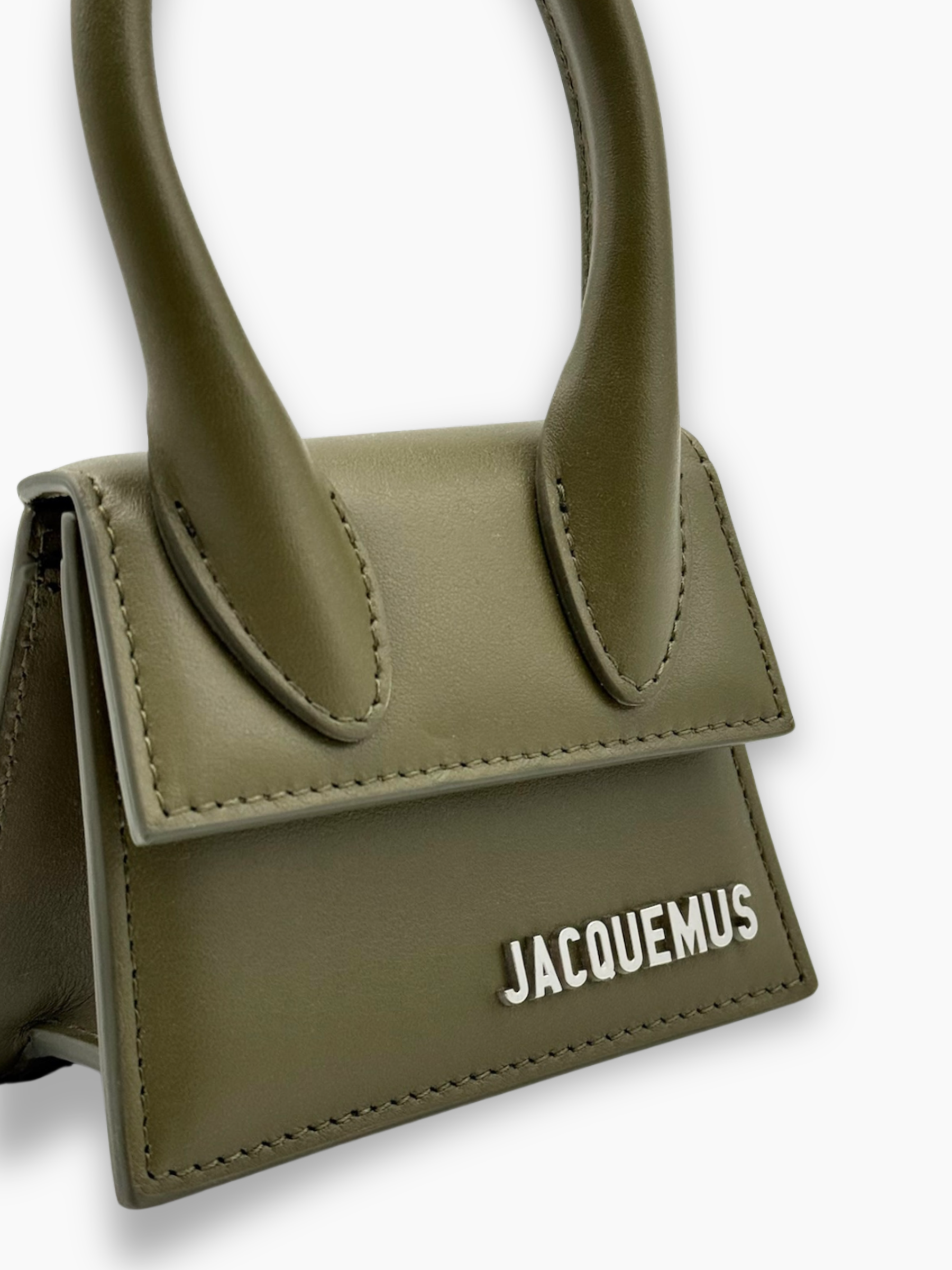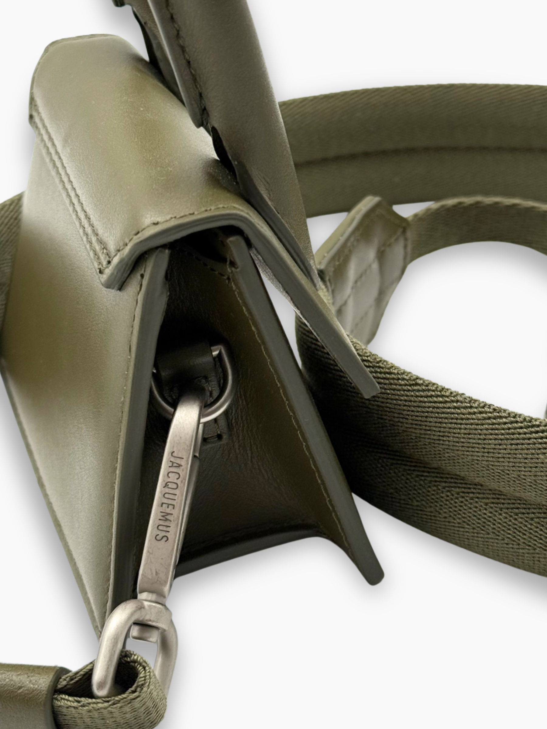 The Le Chiquito Homme bag by Jacquemus, in this khaki green version, is the perfect accessory to add a distinctive and sophisticated touch to your outfit. Compact and sculptural, it is crafted from smooth leather with a rigid handle and a metal logo on the front. Equipped with an adjustable and removable shoulder strap, it can be carried by hand or crossbody for absolute versatility.