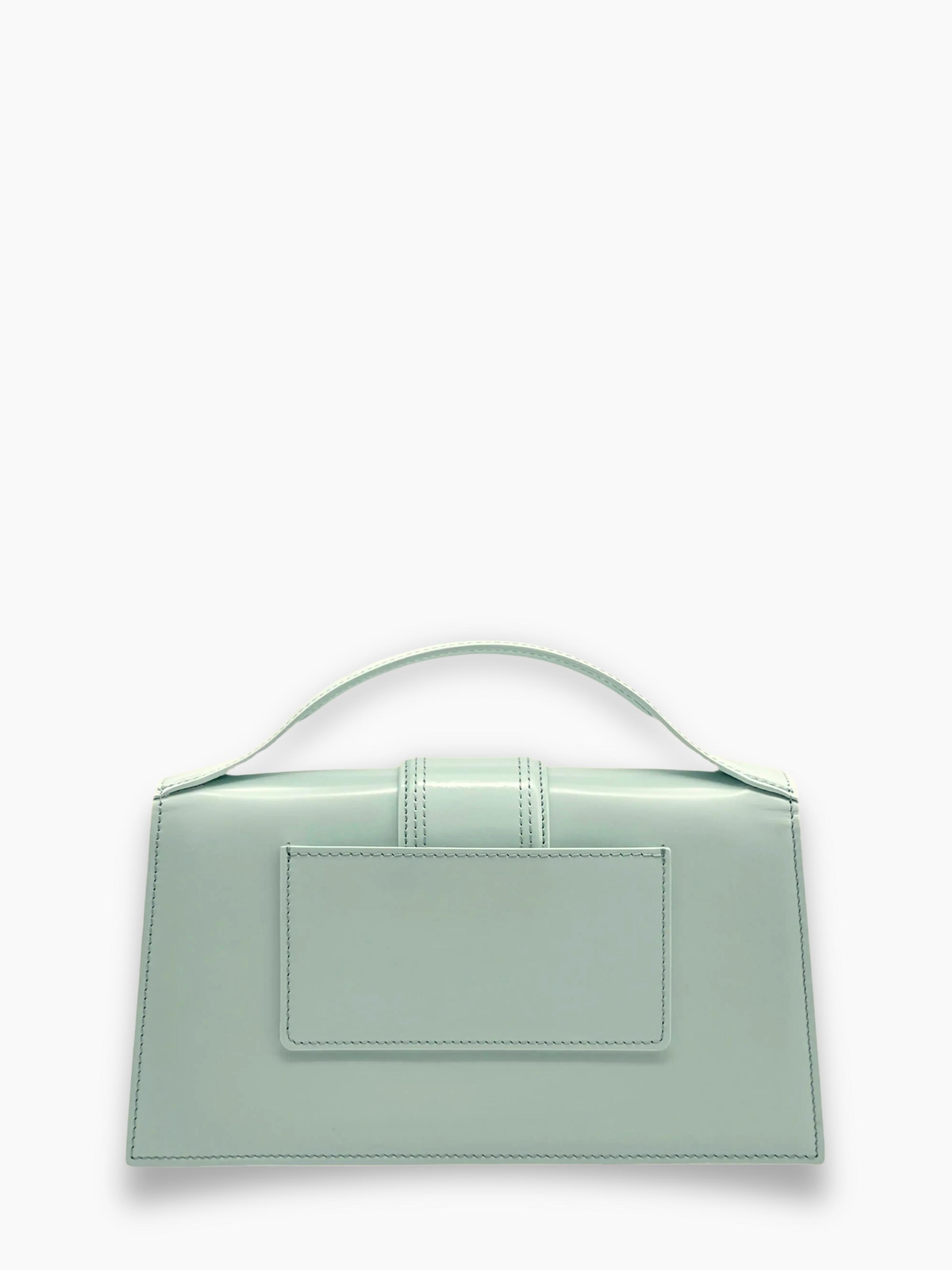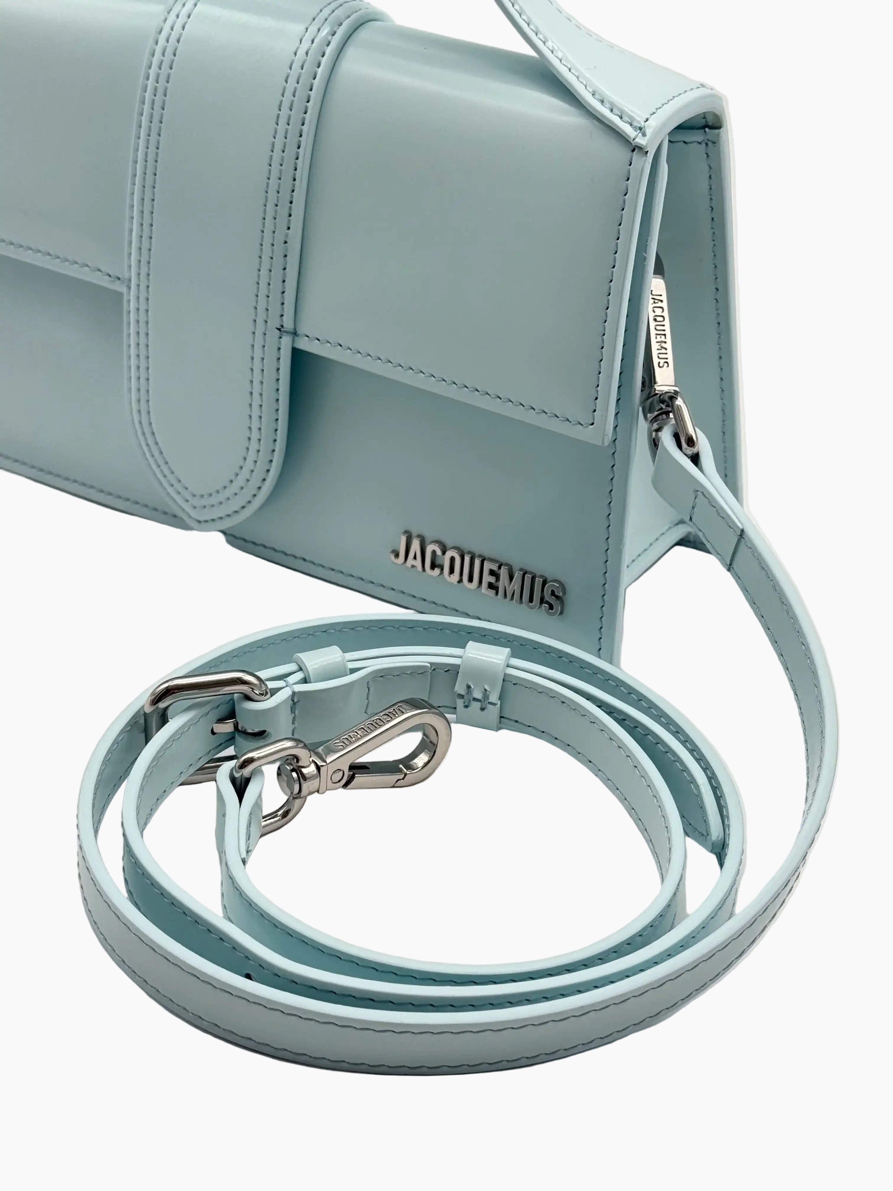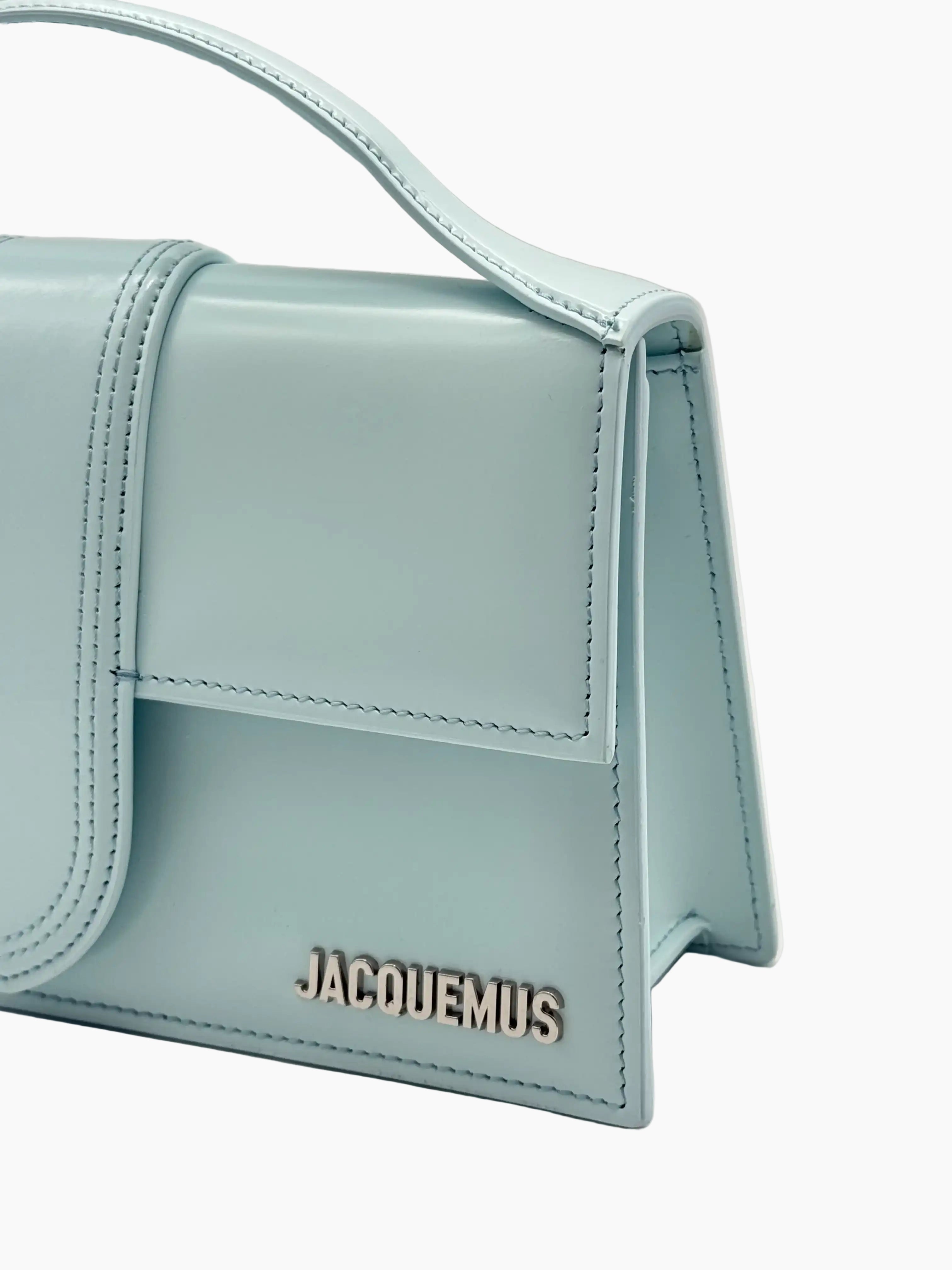 The Le Grand Bambino by Jacquemus is an iconic handbag that combines geometric lines and refined minimalism. Crafted from smooth blue leather, it features a rigid handle and a front flap with a central tab. Equipped with a long, adjustable and removable shoulder strap, it offers maximum versatility. The silver metallic Jacquemus logo on the front adds the finishing touch of elegance.