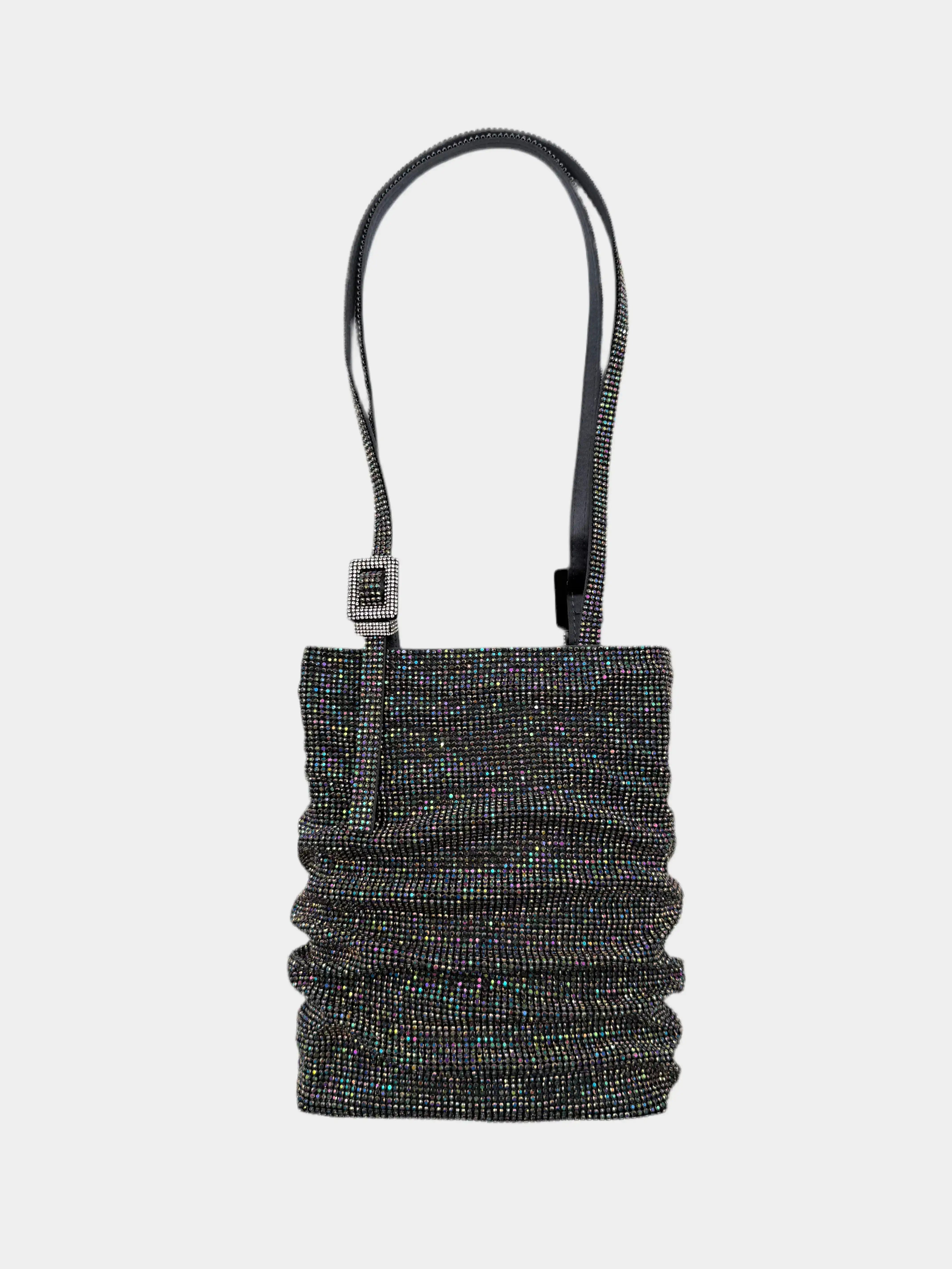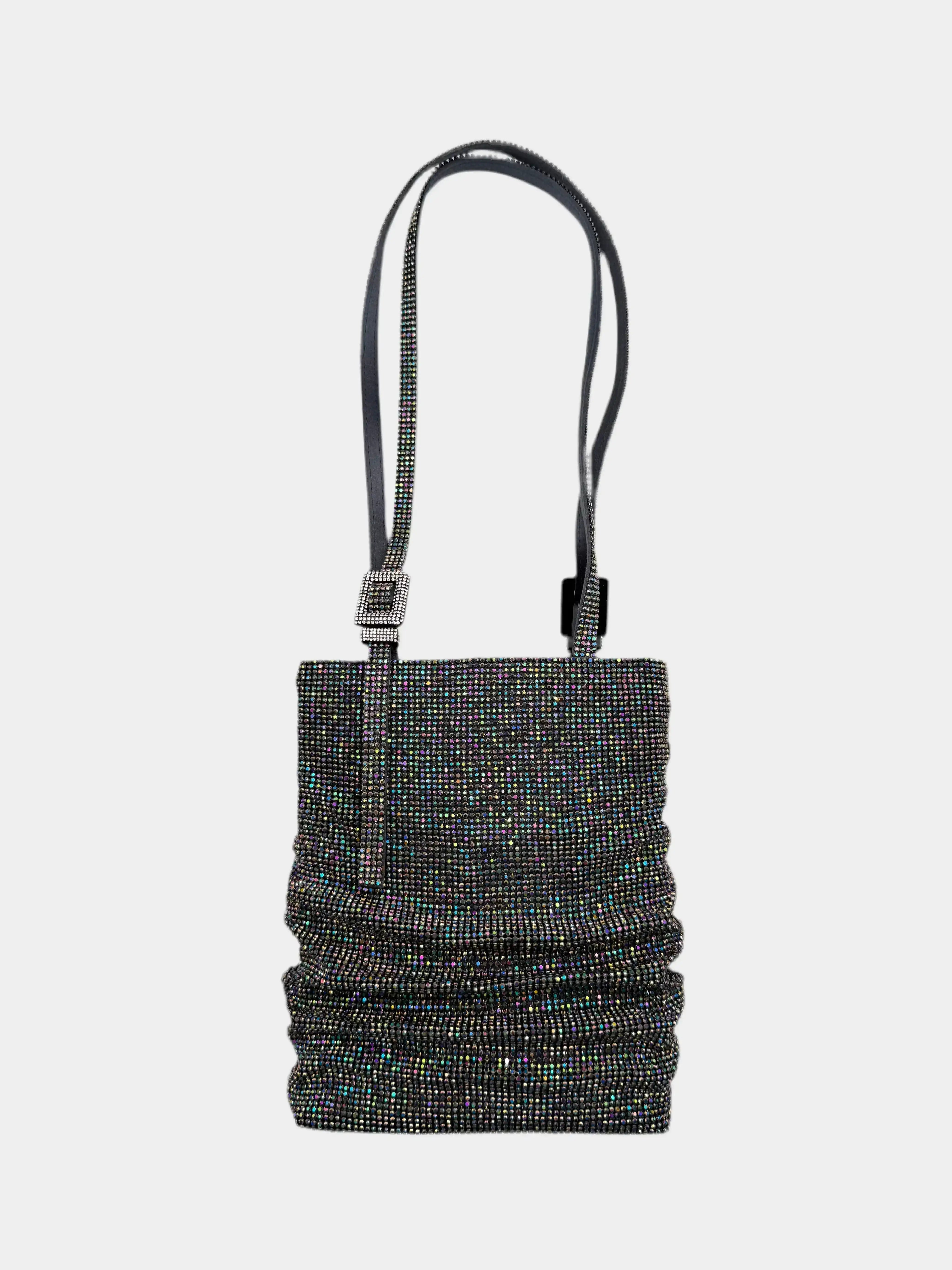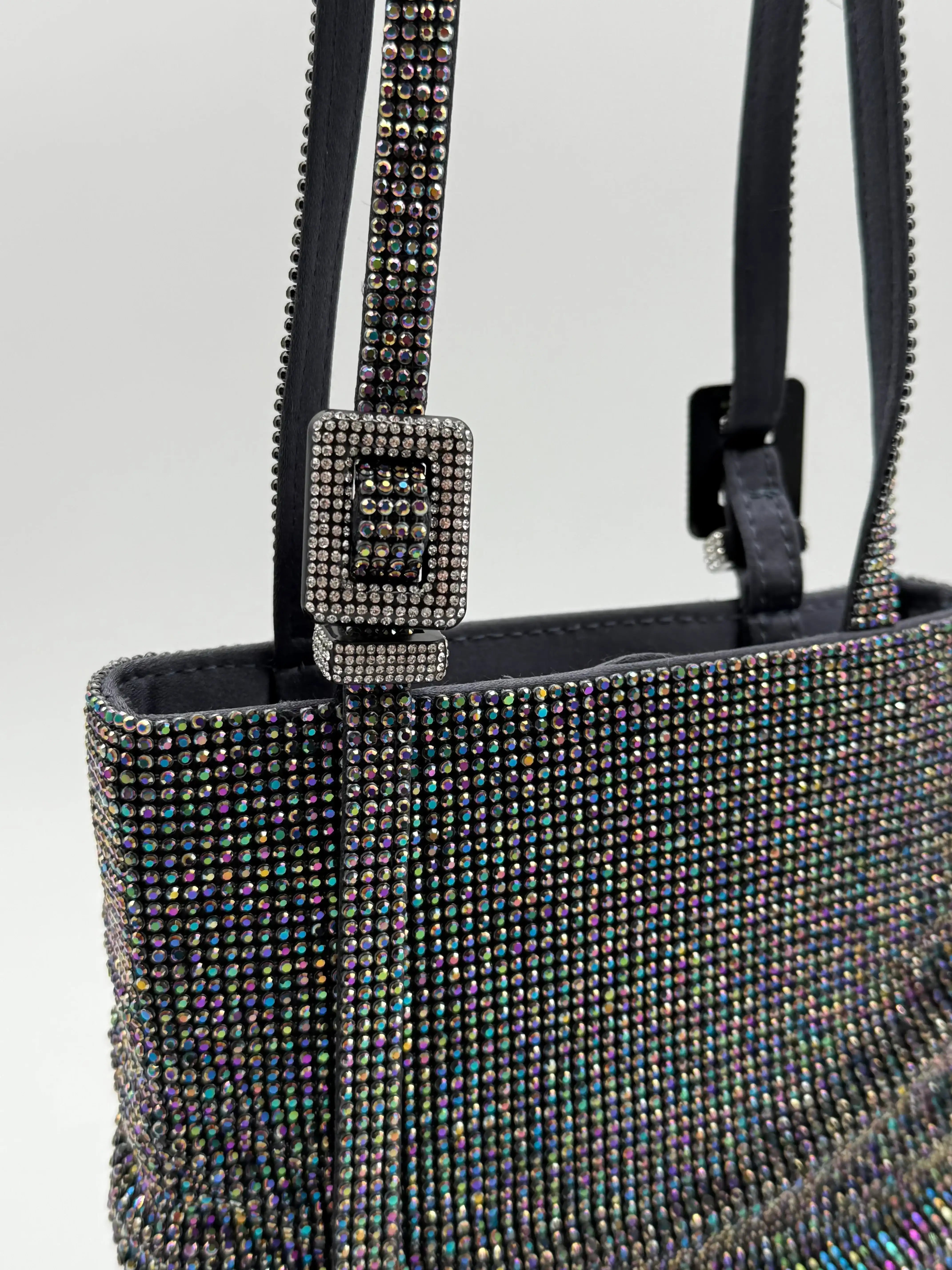 The Lollo La Grande "Moonraker" bag by Benedetta Bruzziches is a statement of luminous elegance. The gathered, vertical design is covered in thousands of iridescent crystals that reflect rainbow hues, creating a dynamic and refined optical effect. The adjustable handle with a jeweled buckle adds a touch of sophistication, making this accessory perfect for evening wear or glamorous events.