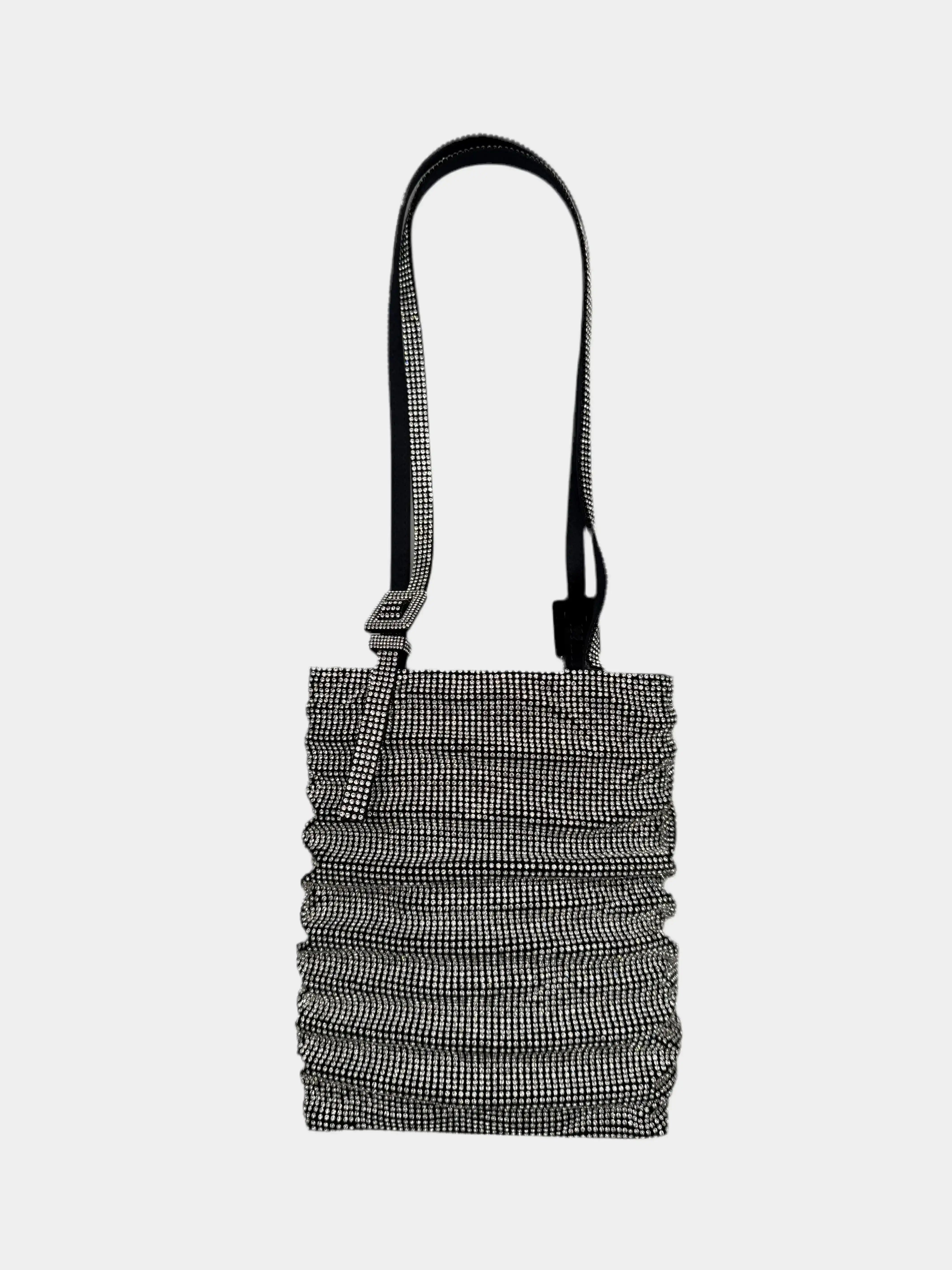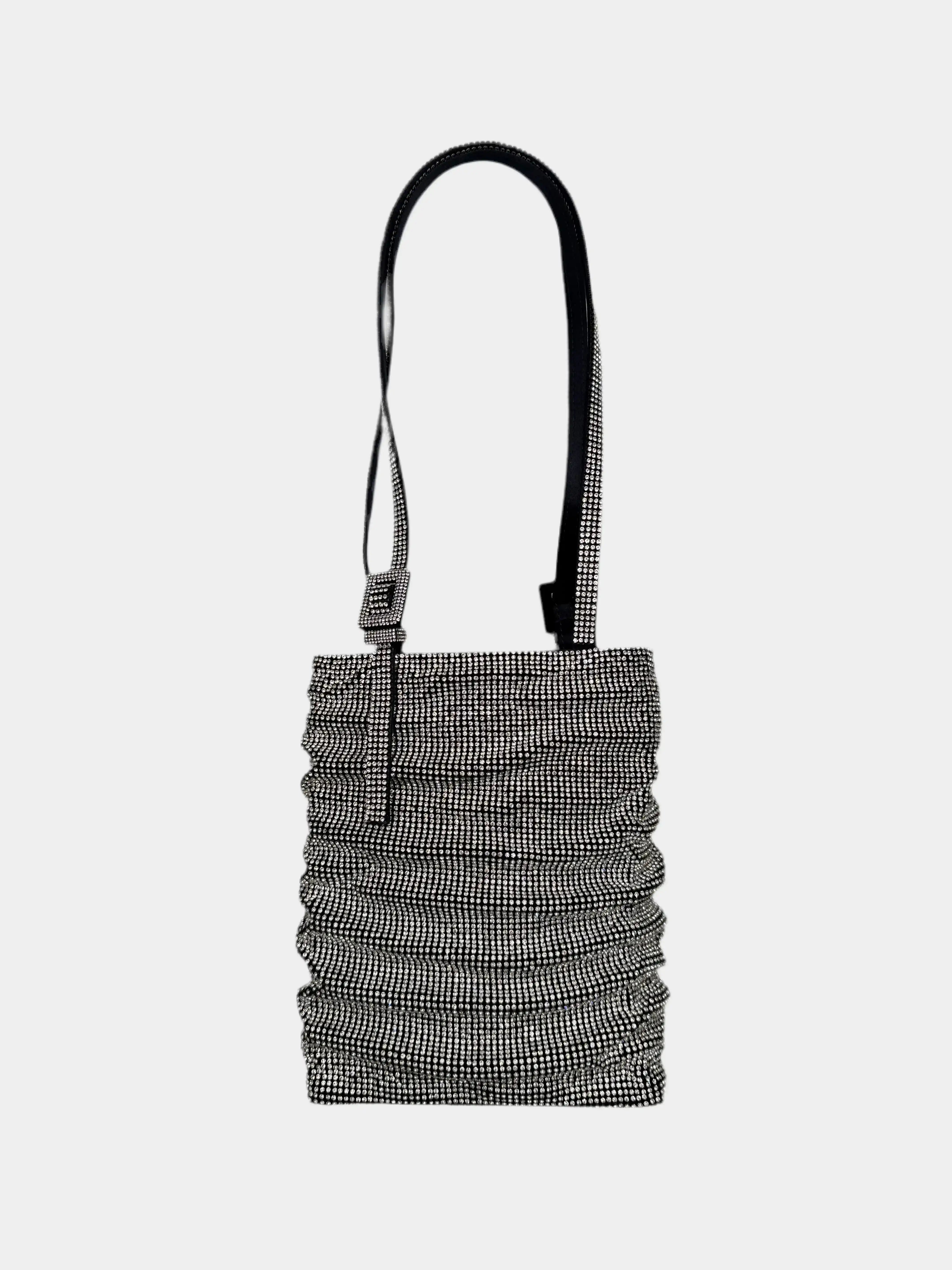 The Lollo La Grande "The World Is Not Enough" bag by Benedetta Bruzziches is an ode to light and timeless luxury. With its vertical silhouette and iconic gathered detail, it is completely covered in silver-tone crystals on a black background for a refined, dramatic effect. The adjustable handle with a jeweled buckle allows it to be carried comfortably over the shoulder. A magnetic and sparkling accessory, perfect for special occasions. Comes with the original box and dust bag.