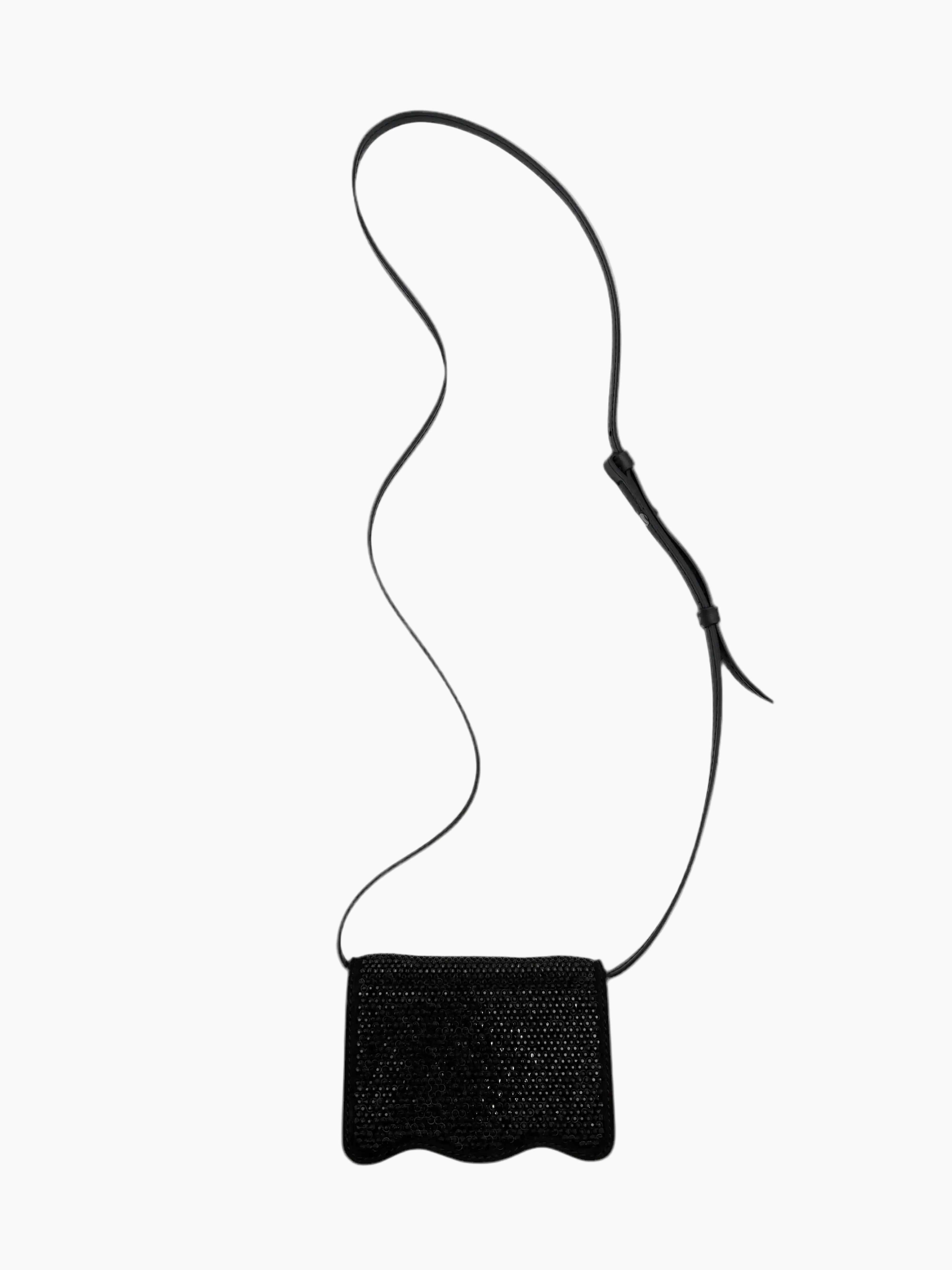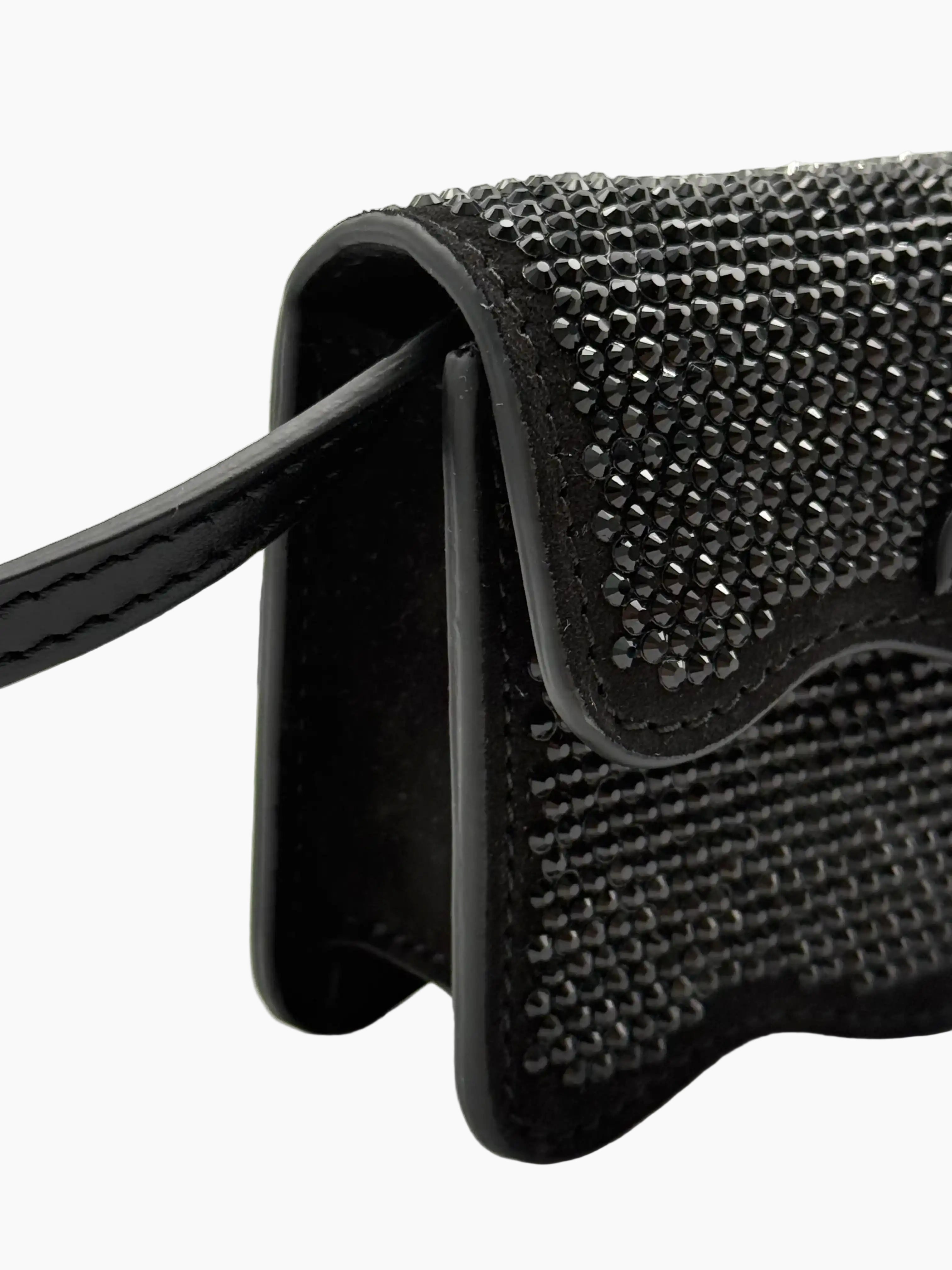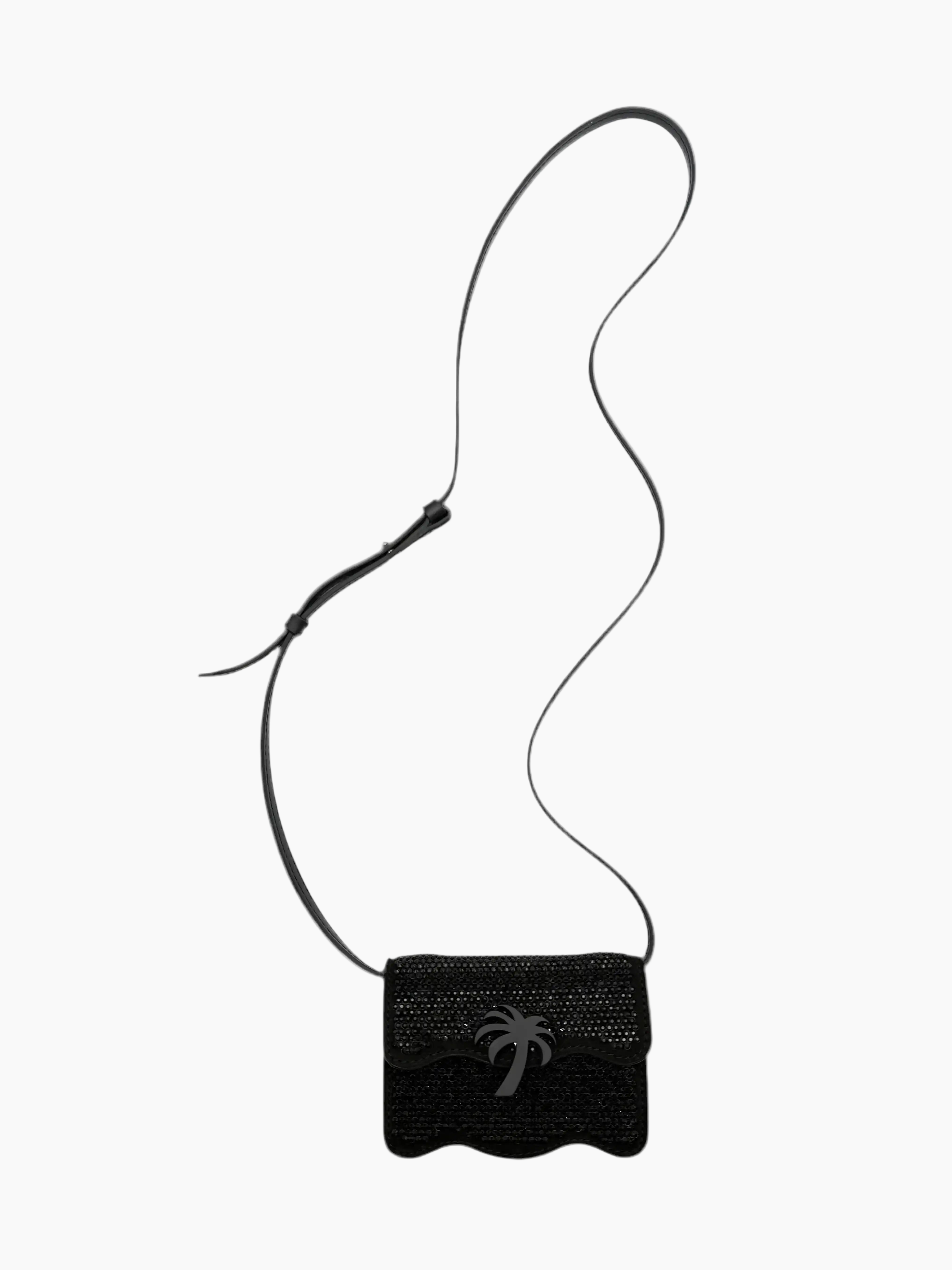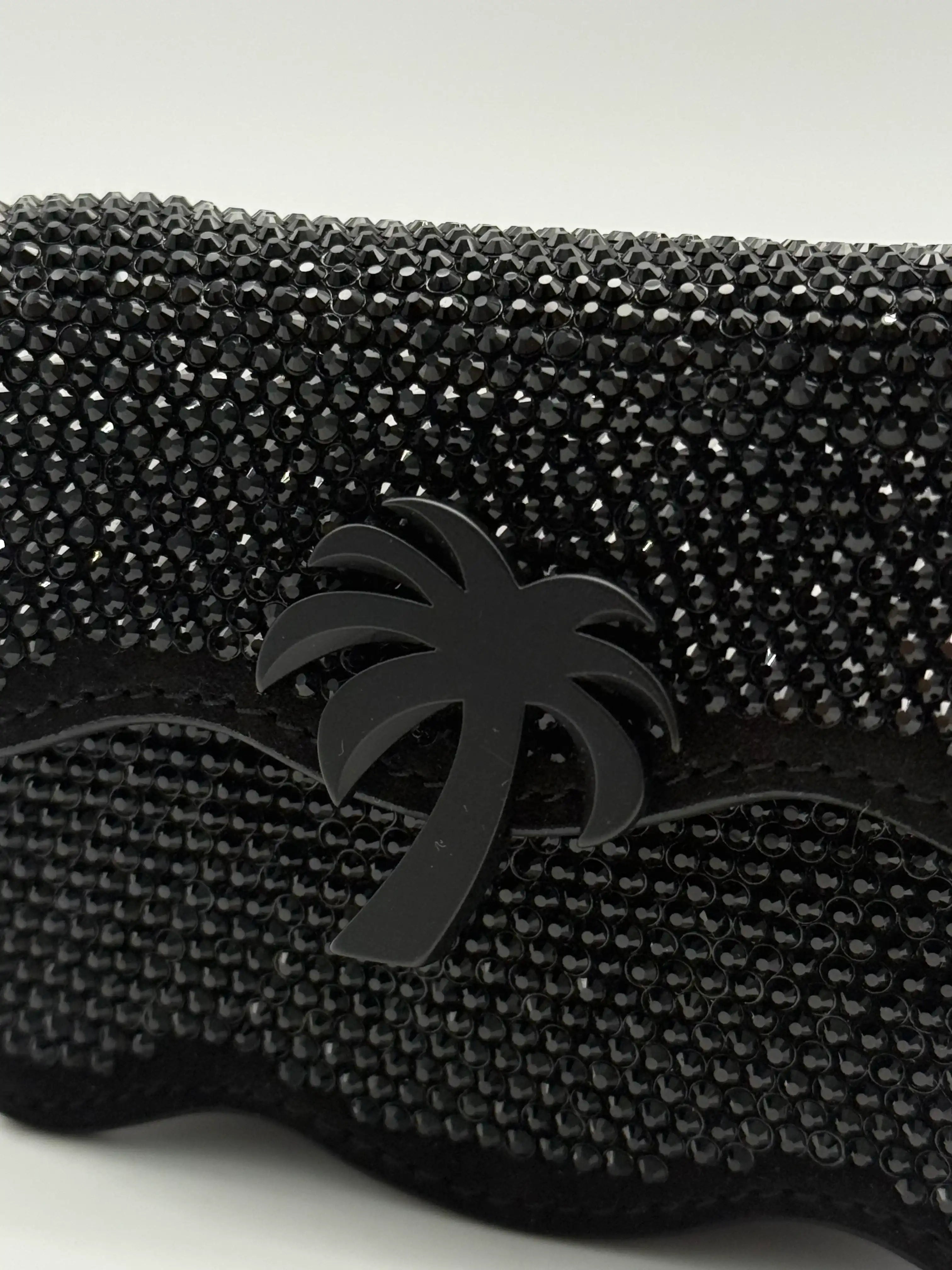The Palm Angels mini bag is a statement accessory that blends streetwear spirit and luxury details. Covered entirely in black rhinestones for a bright and bold effect, it features a contoured flap closure with the iconic tone-on-tone palm motif. The long, adjustable leather shoulder strap allows it to be worn over the shoulder or crossbody in maximum style.