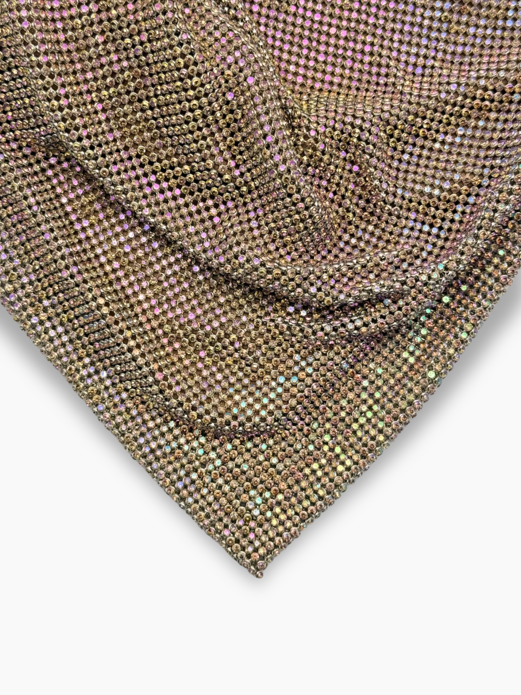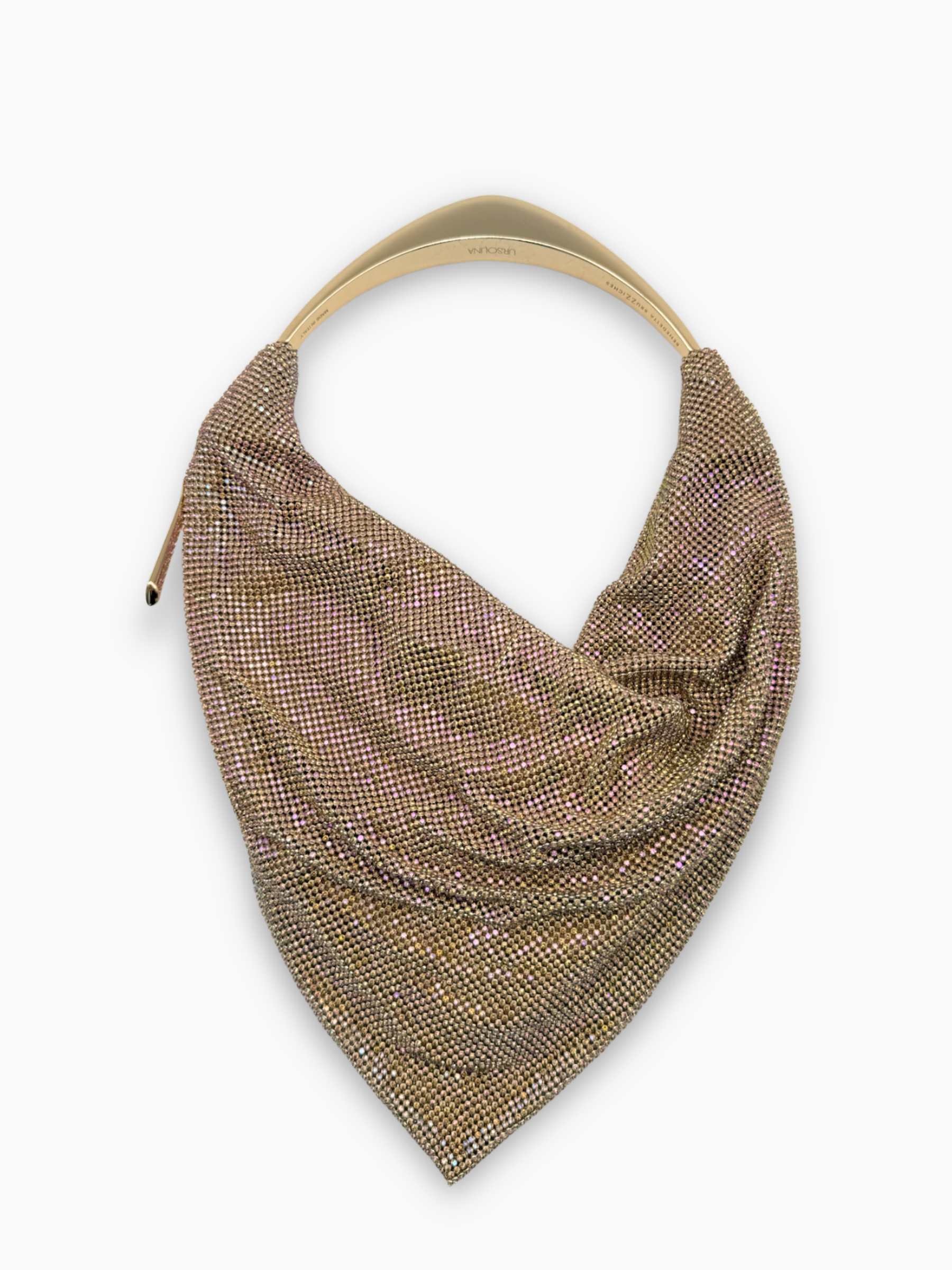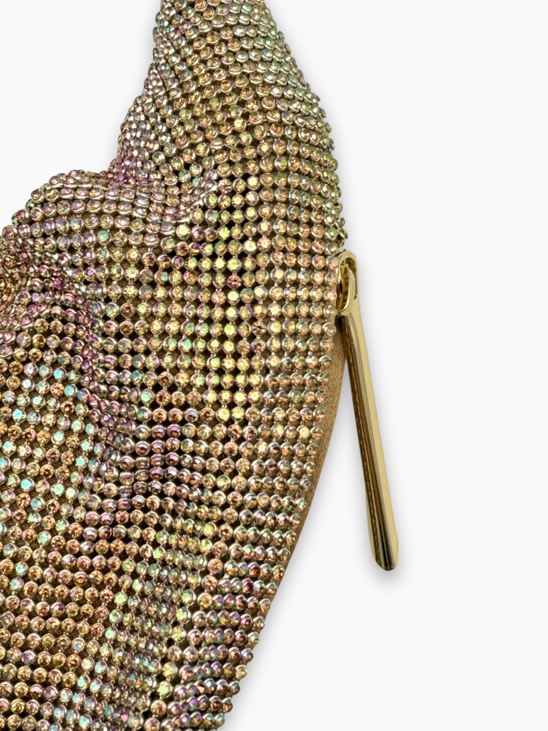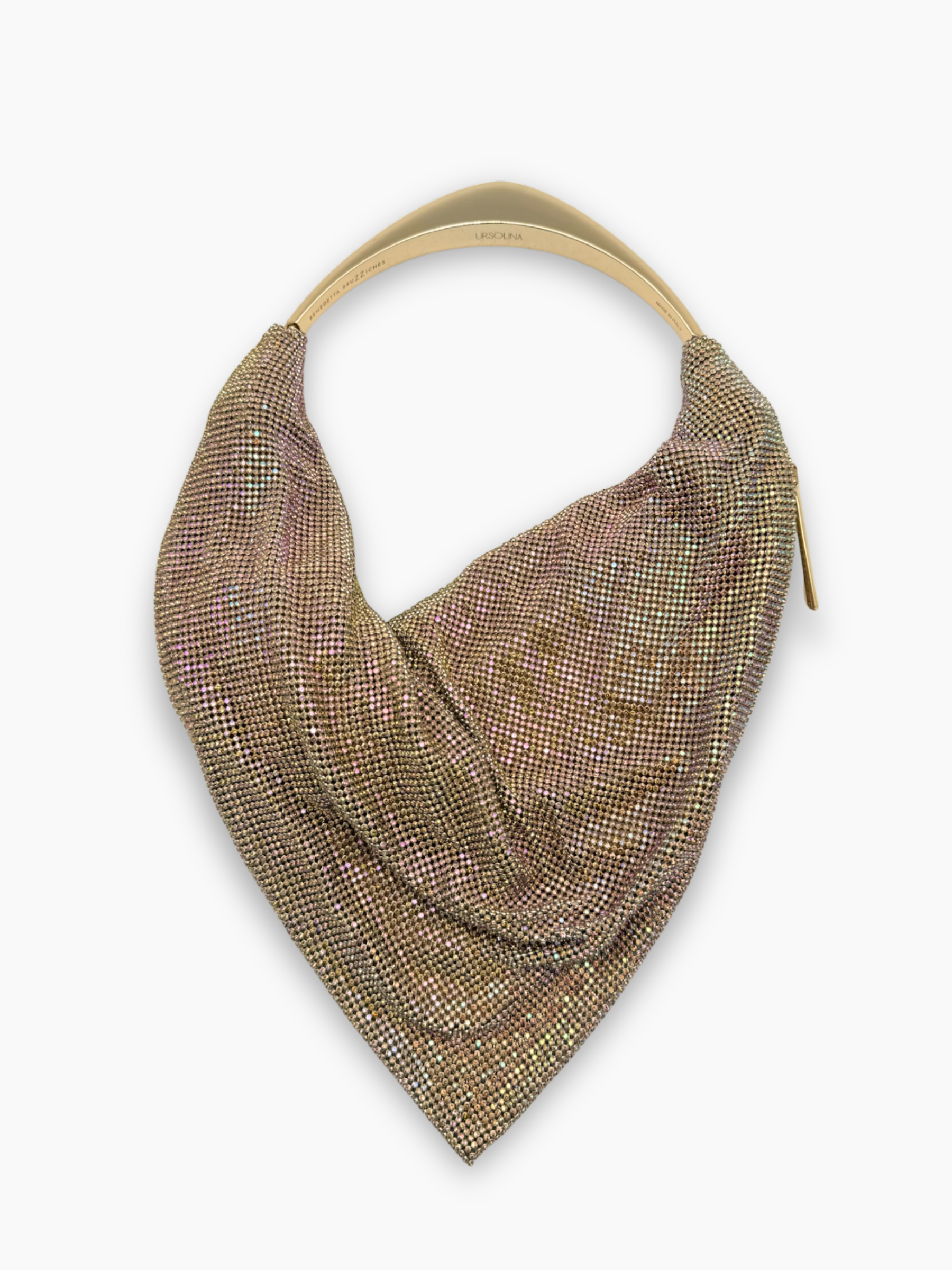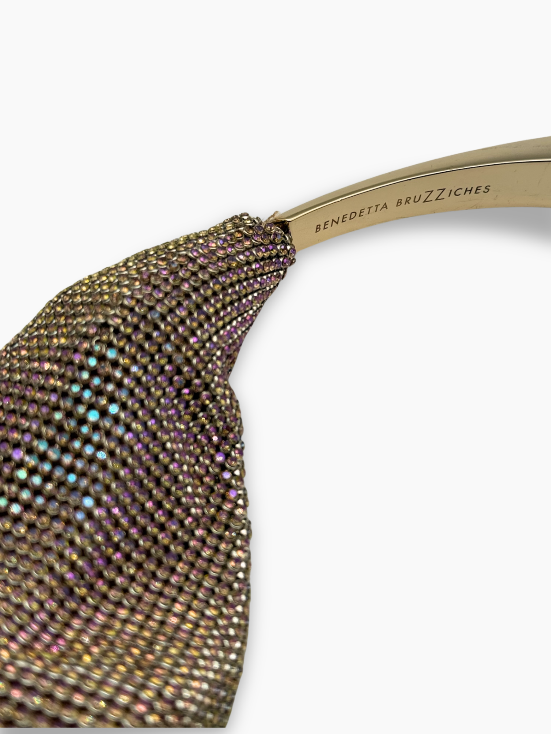 The Ursolina Gold Gun bag by Benedetta Bruzziches is a design object that blends sensuality, light, and artisanal innovation. Crafted from a metal base and covered in a cascade of iridescent gold micro crystals, it features a fluid, draped silhouette, embellished with a polished gold sculptural handle. The gold side zipper with engraved pull completes an accessory designed to shine at exclusive events, galas, and red carpets.