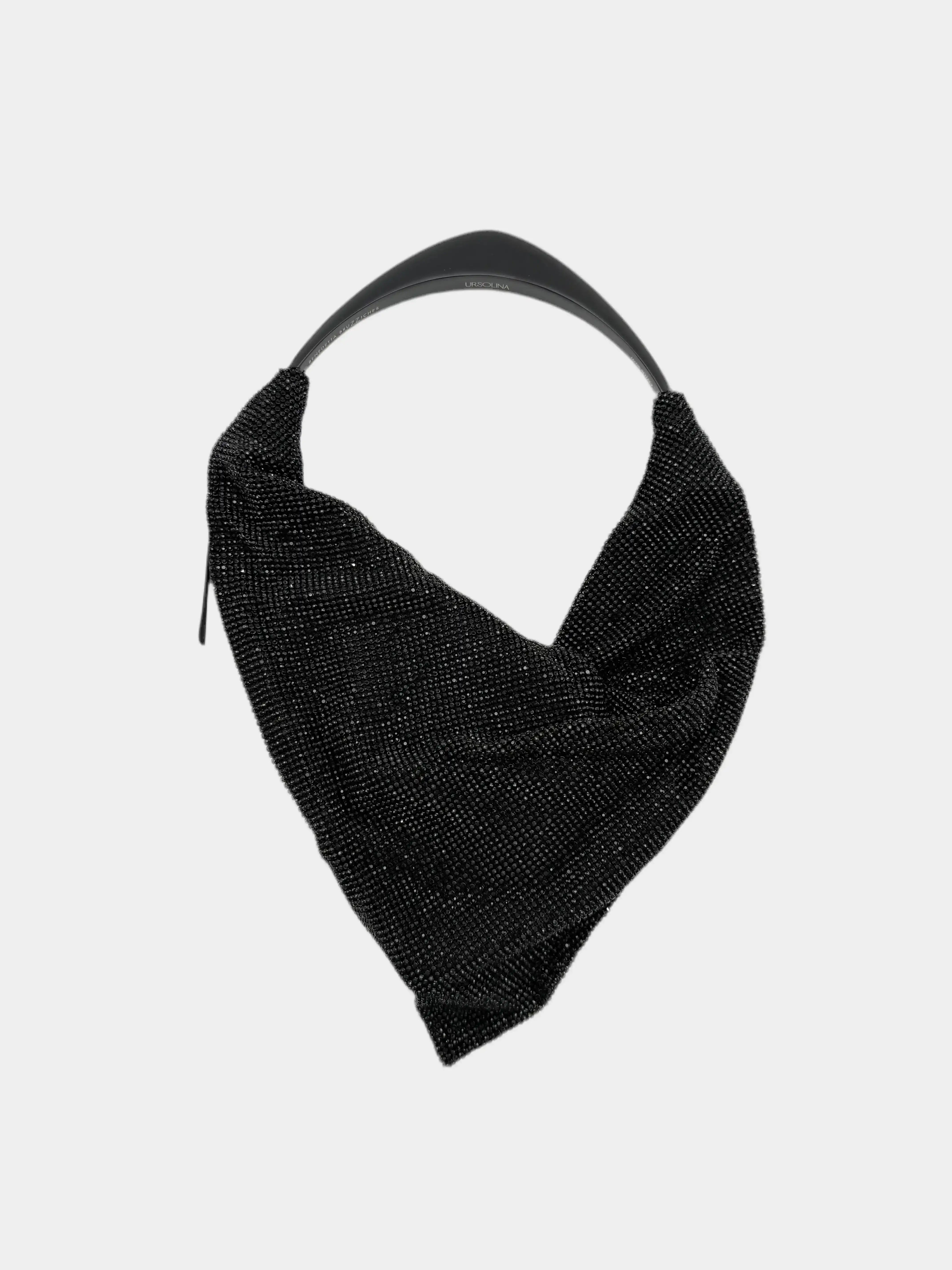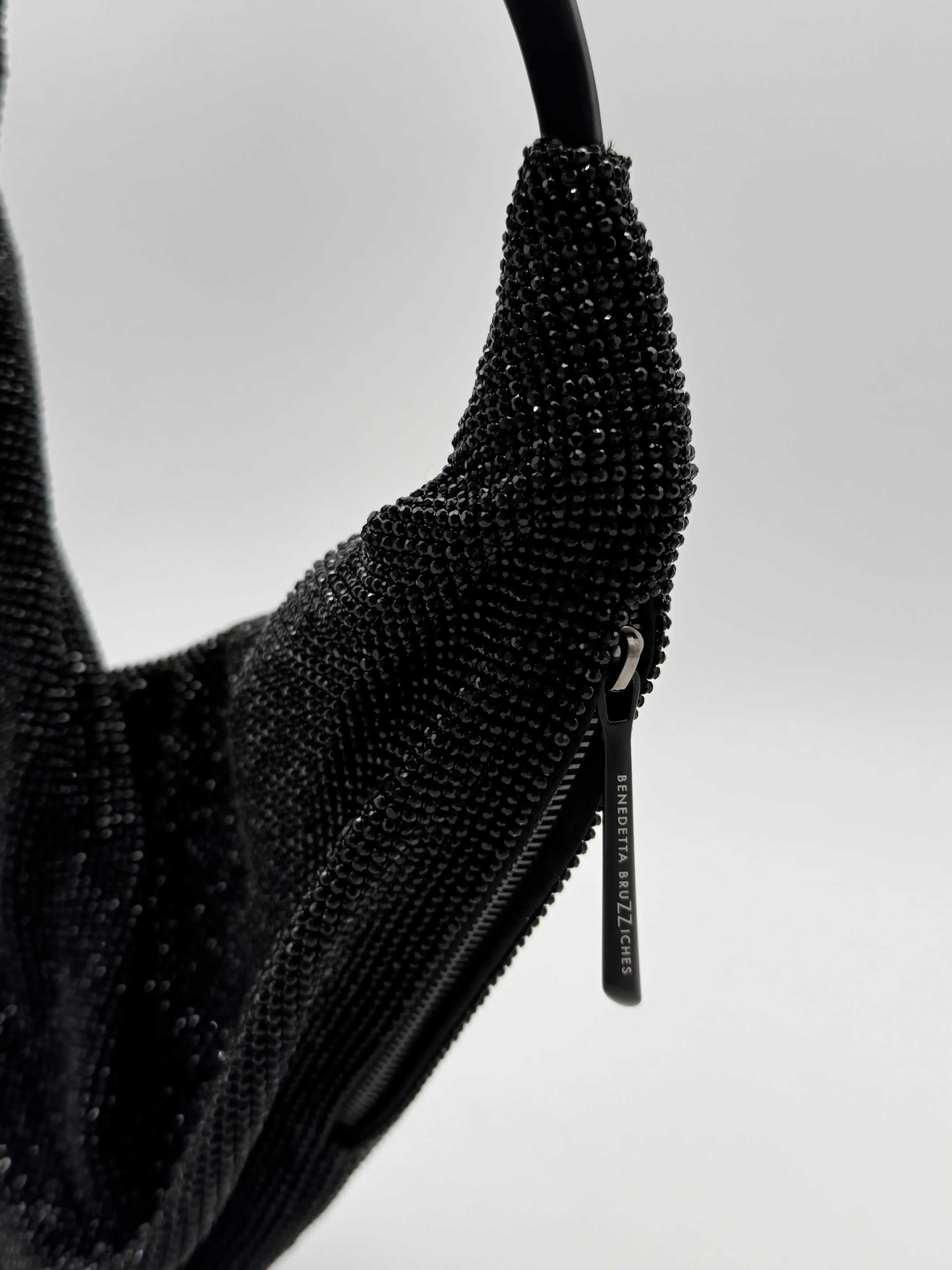 The Jet Black Ursolina "James Bond" bag by Benedetta Bruzziches is a statement of power, elegance, and mystery. Its draped silhouette of black crystals on a metal base reflects light with subtle magnetism. The rigid, sculptural silver metal handle lends the design an architectural structure, while the side zip with a signature pull ensures functionality. A wearable masterpiece, perfect for sophisticated evenings, events, and moments that require a statement.