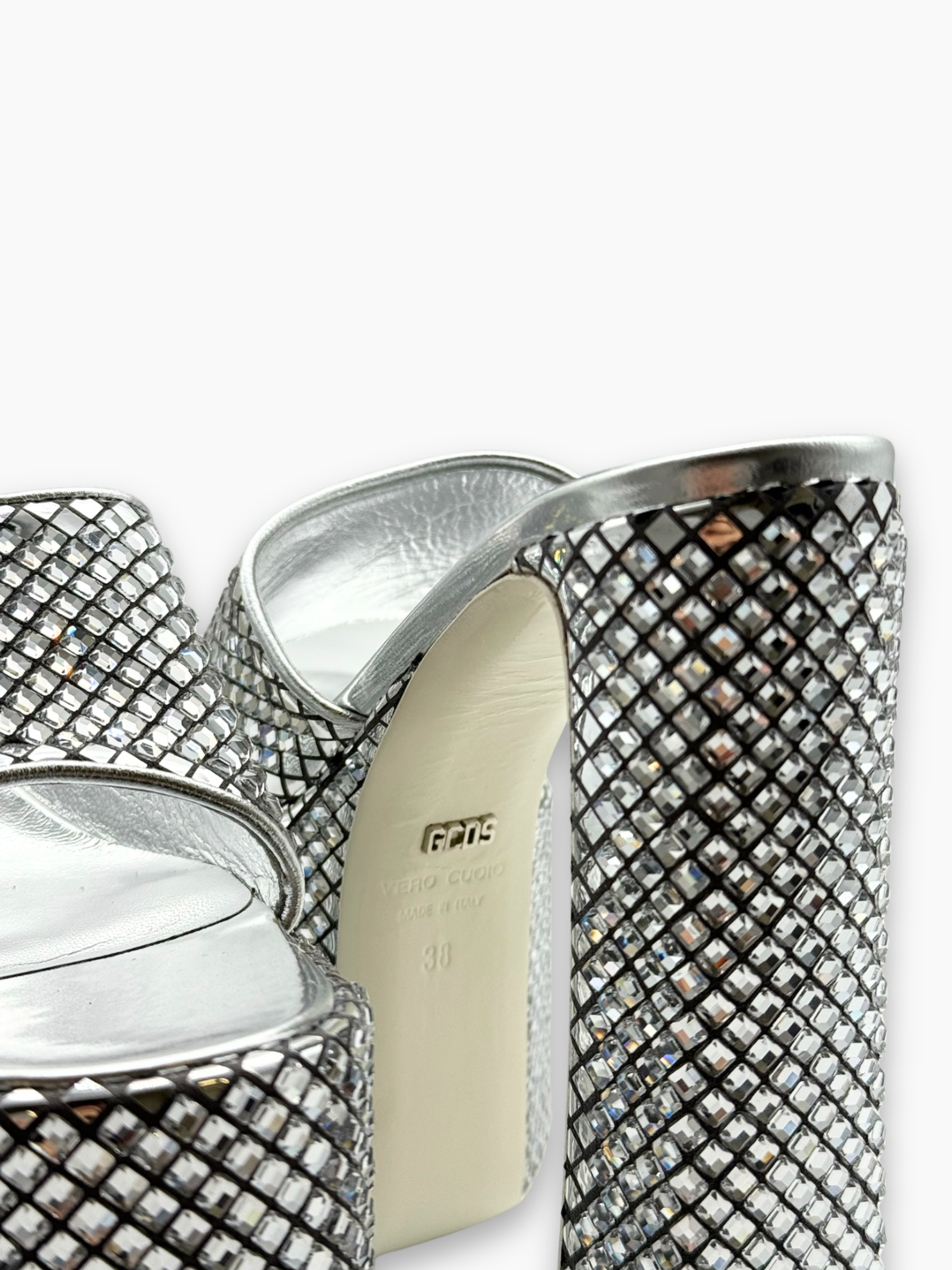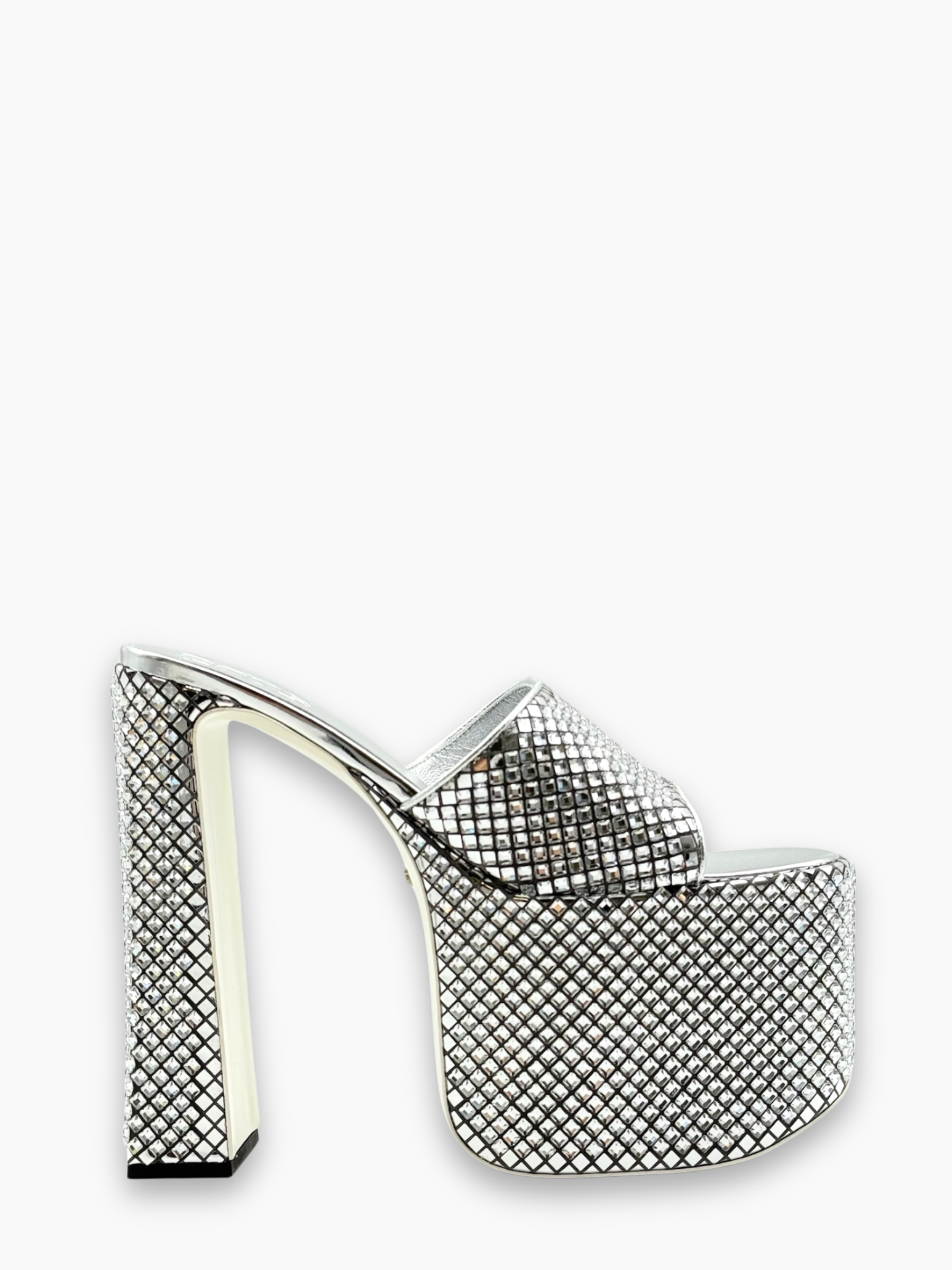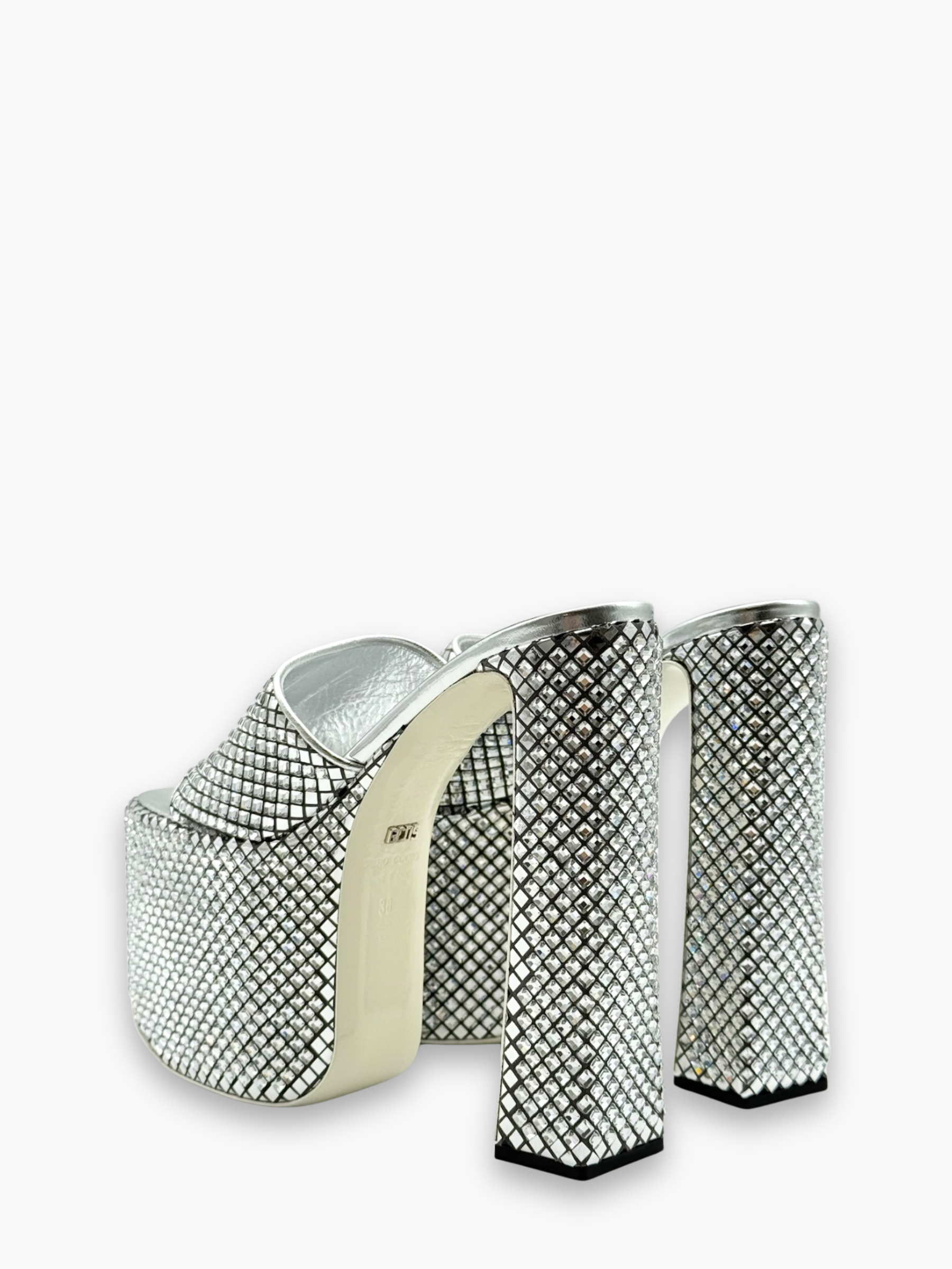 Queste mules argento con maxi plateau reinterpretano l’estetica glamour con un twist audace. Il design è interamente ricoperto da micro-cristalli incastonati a griglia, che catturano la luce a ogni passo, mentre il tacco largo e scolpito garantisce stabilità e un look estremamente scenico. Una calzatura pensata per chi vuole brillare senza compromessi.