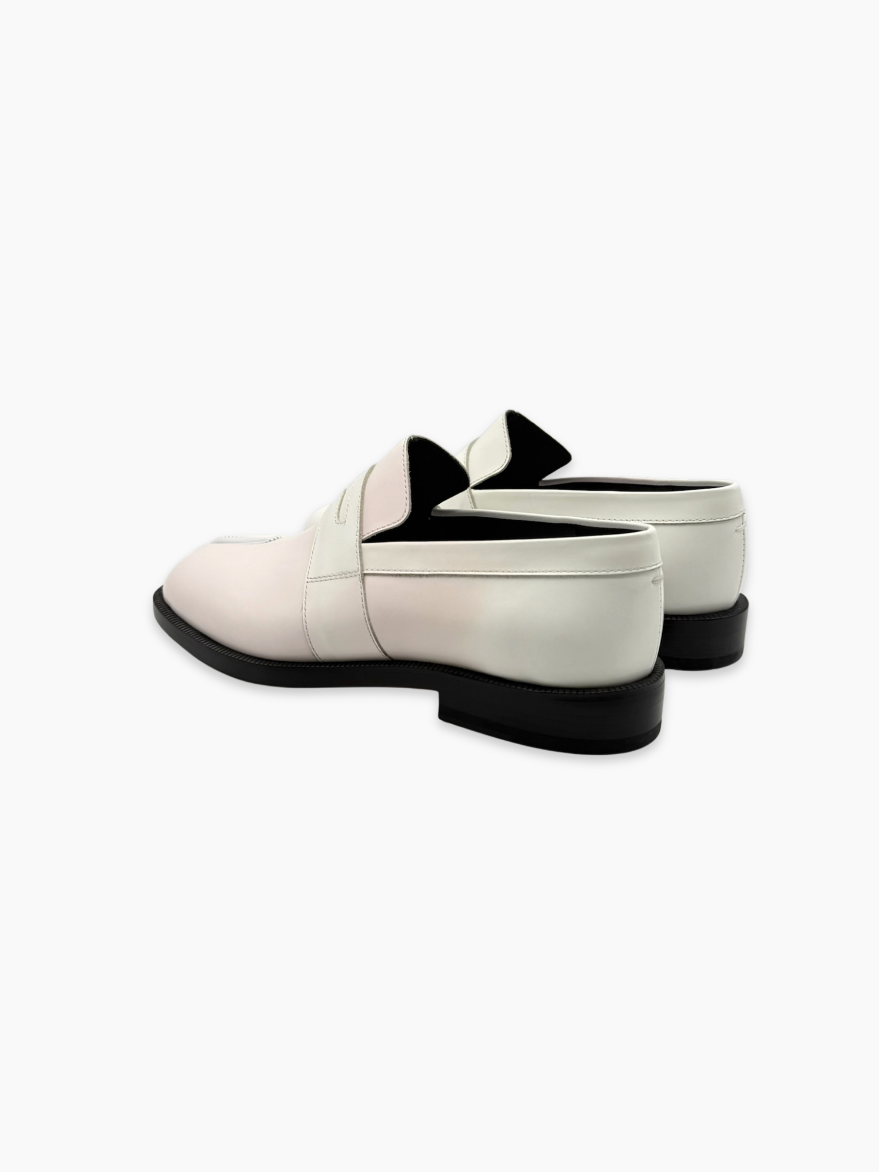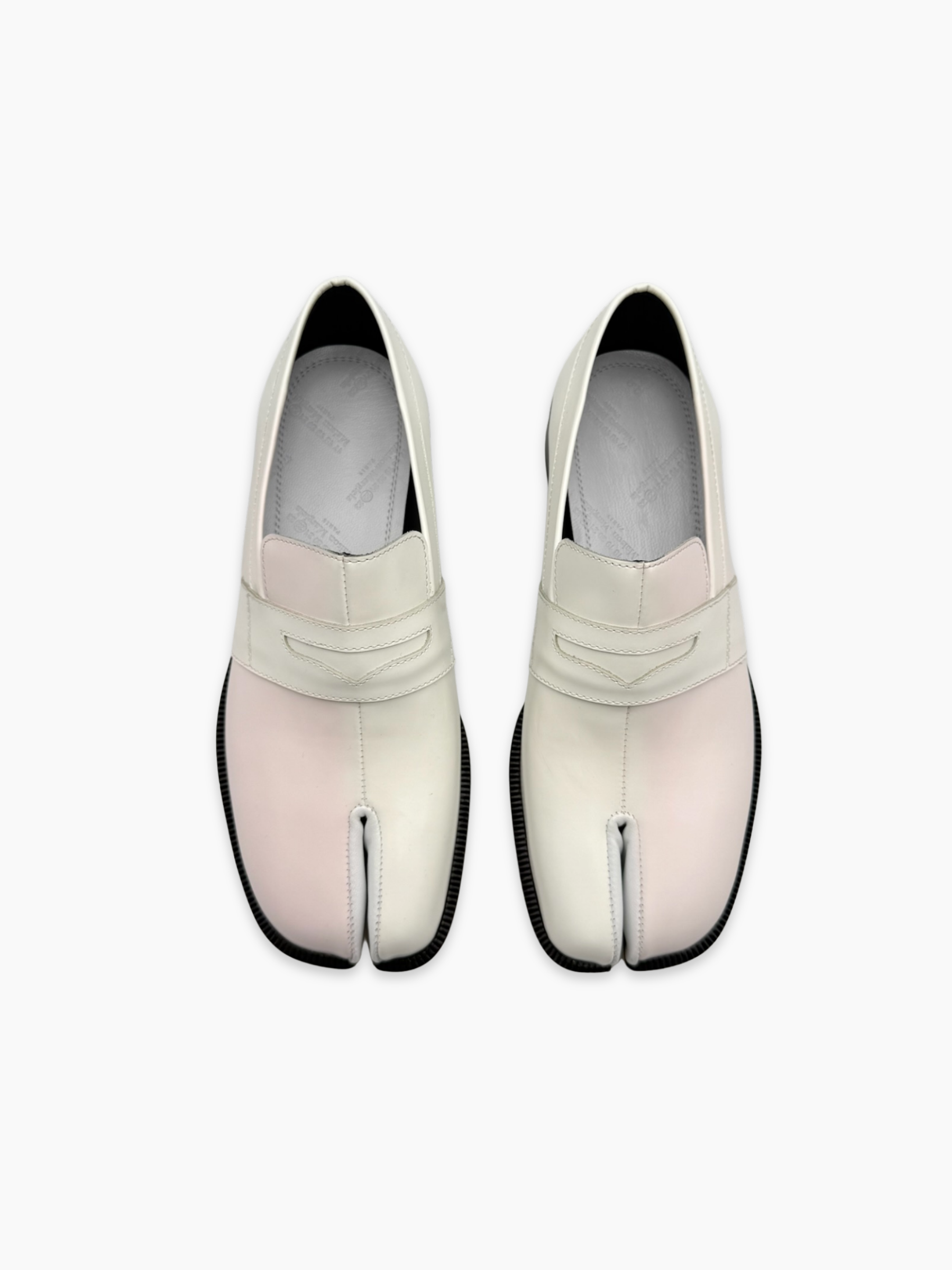 Classic lines and a conceptual twist: these Maison Margiela loafers revisit tradition with an unexpected aesthetic. The two-tone design alternates milky white and pale pink, while the unmistakable Tabi toe elegantly breaks the symmetry. Crafted from patent leather, they're the perfect accessory for bold and sophisticated outfits.
