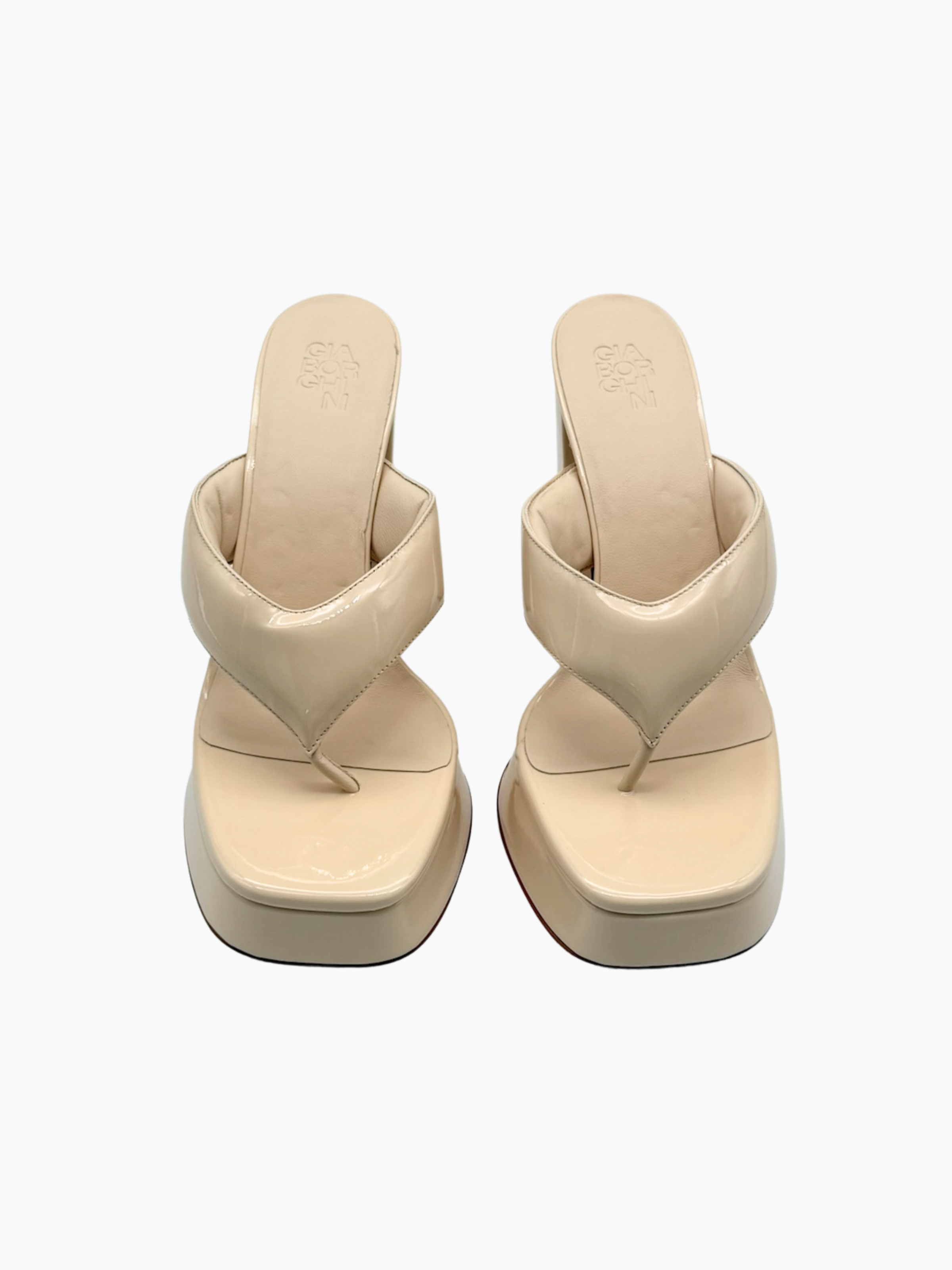 Sandali platform firmati Gia Borghini, realizzati in pelle verniciata beige. Il design con tacco largo e fascia infradito imbottita combina comfort e raffinatezza, perfetto per completare look minimal o più audaci con un tocco di eleganza contemporanea.