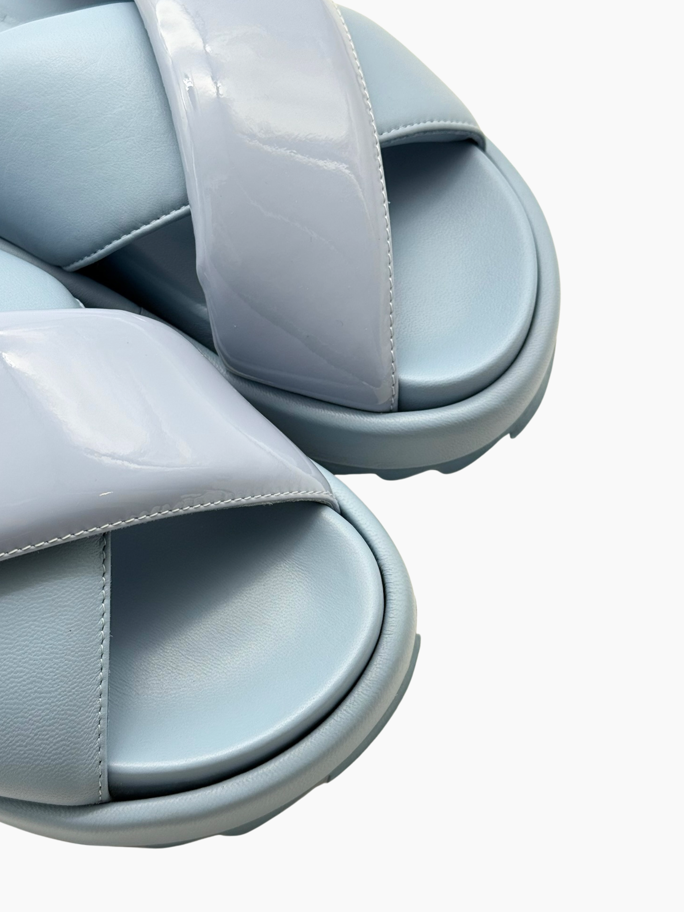 Sandali flat firmati Gia Borghini, caratterizzati da un design minimal con fasce incrociate e finitura lucida che aggiunge un tocco sofisticato. Realizzati in morbida pelle con suola platform leggera, garantiscono comfort e stile in ogni occasione, ideali per completare outfit casual o look estivi più raffinati.