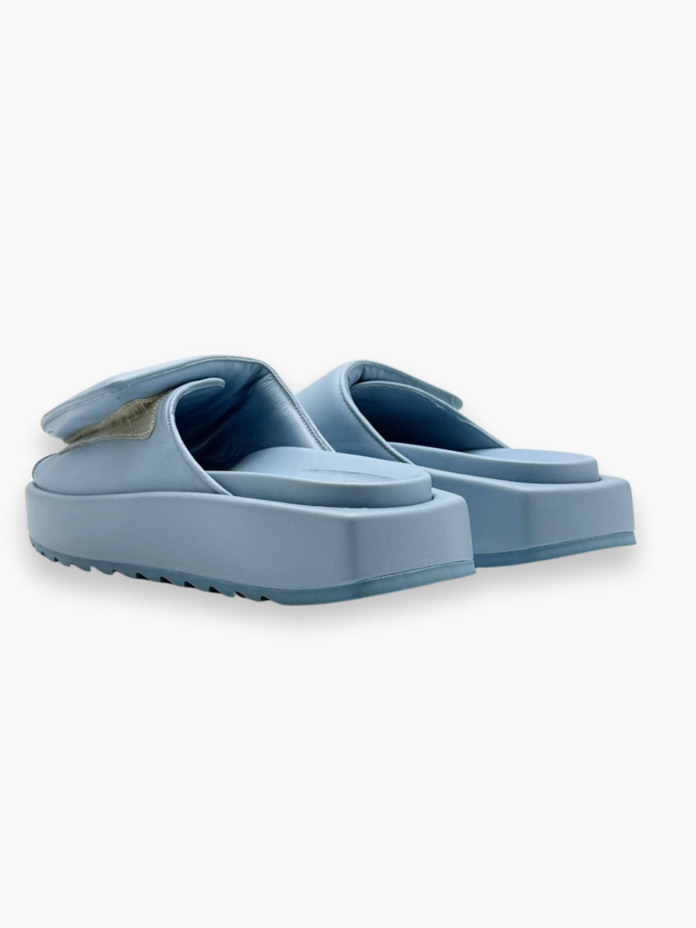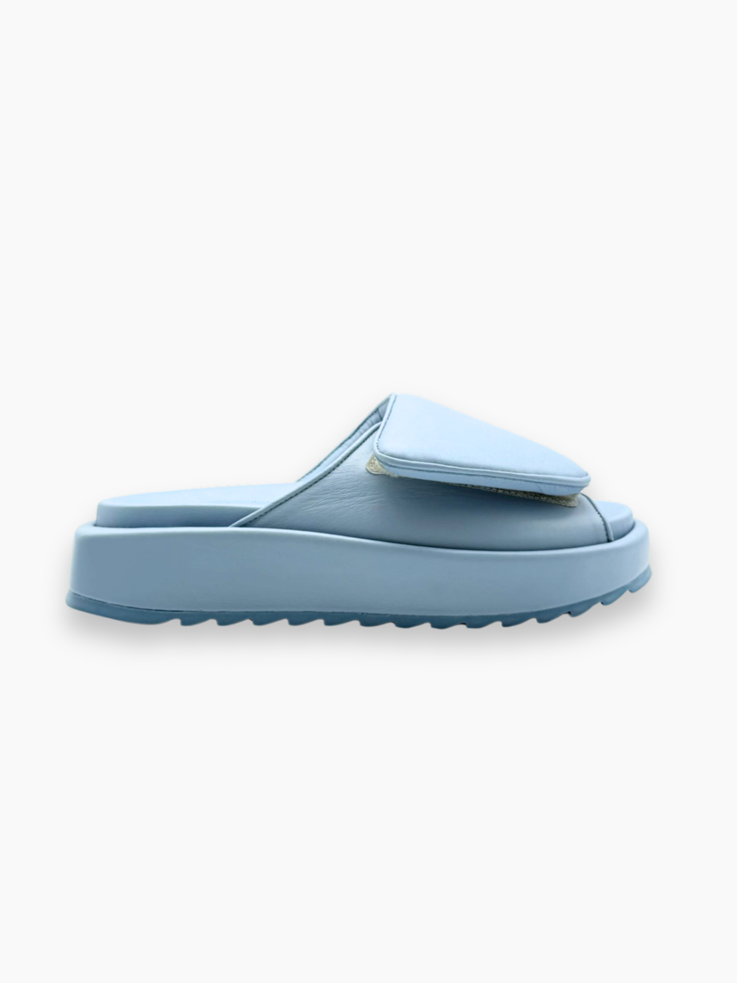 Gia Borghini sandals crafted from soft light blue leather, featuring a wide padded strap and a rubber platform sole. The minimal, modern design ensures comfort and style, perfect for casual, contemporary summer looks.