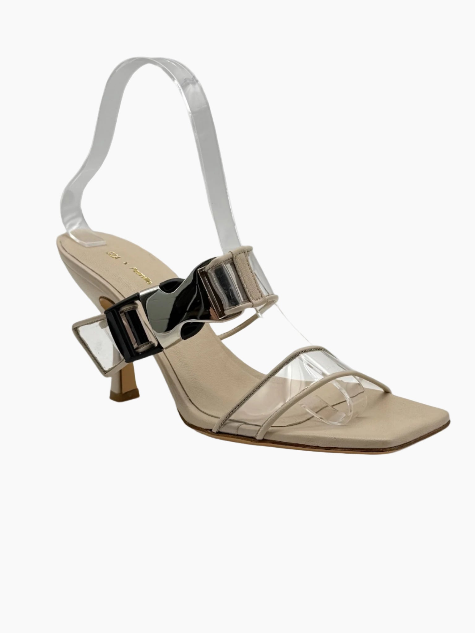 Gia Borghini's open-toe sandals are crafted from beige leather with a double transparent PVC strap and a distinctive oversized black and silver buckle. The flared heel and modern silhouette add a touch of contemporary personality to any look.