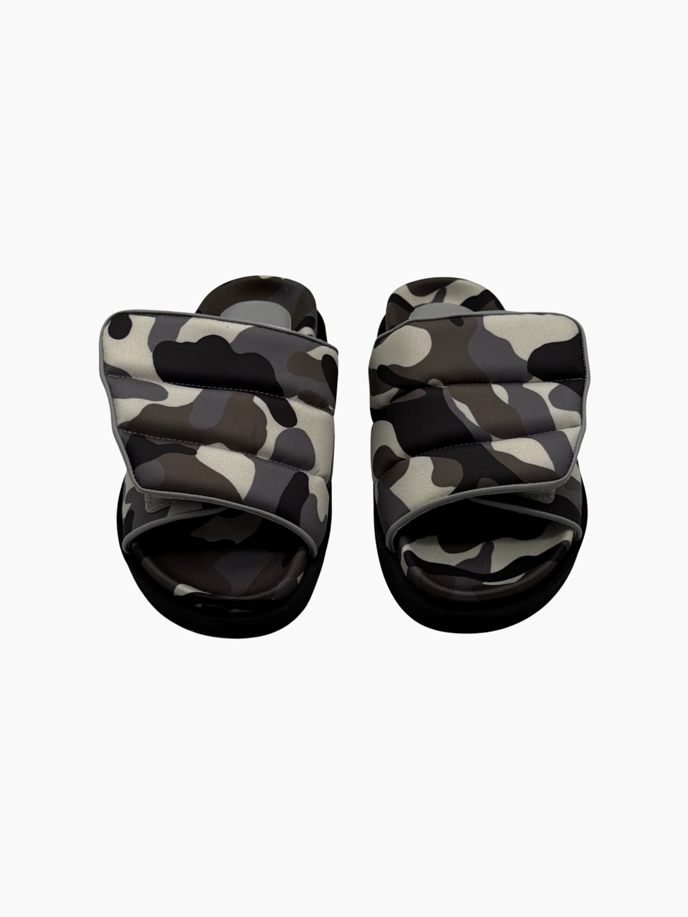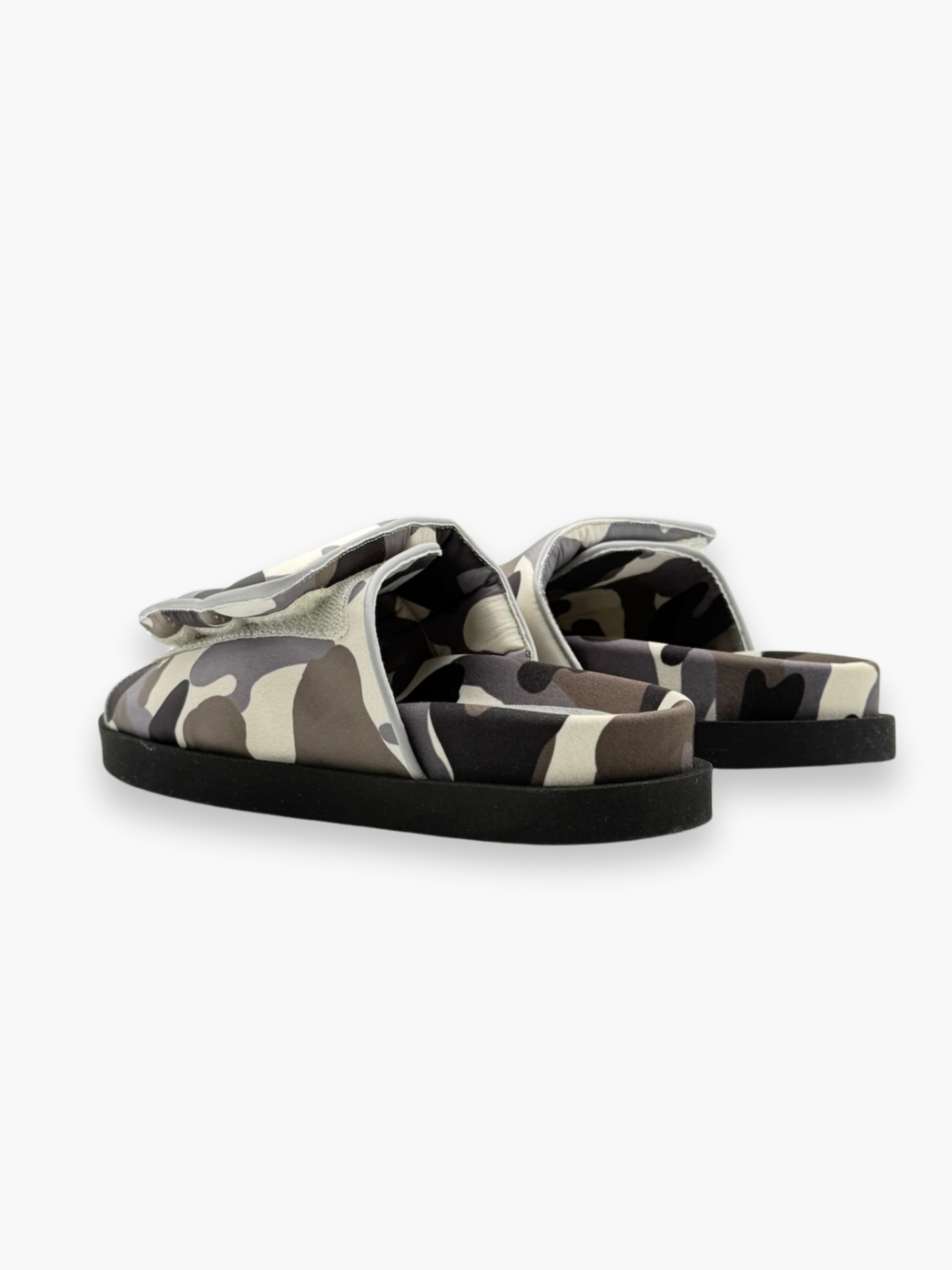 Sandali casual e contemporanei firmati Gia Borghini, caratterizzati da una stampa camouflage nei toni neutri e una fascia imbottita regolabile con velcro. La suola piatta assicura comfort e praticità, rendendoli ideali per look estivi disinvolti ma sempre curati.