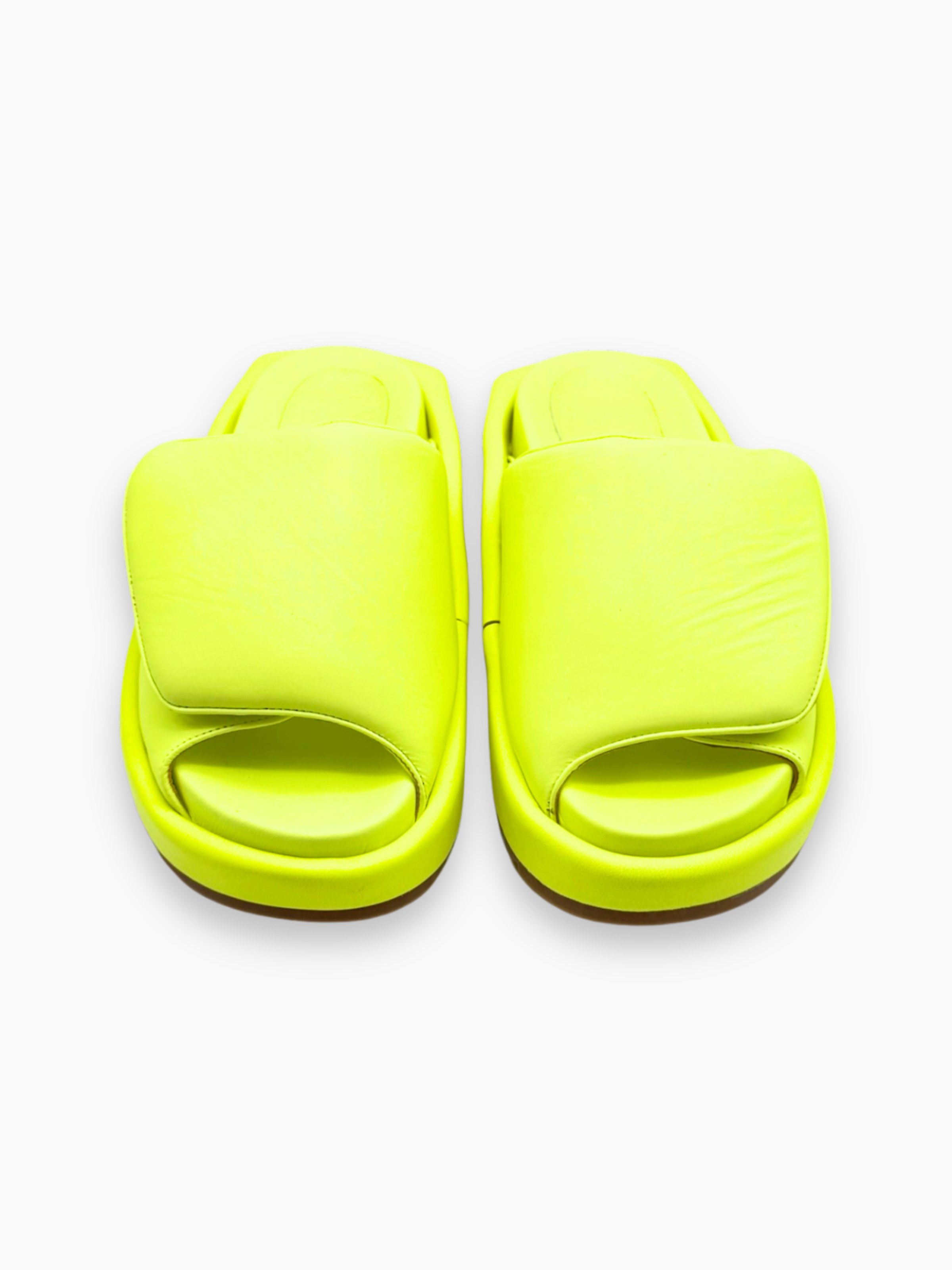 Gia Borghini sandals with a contemporary, minimalist style. Crafted from soft, neon yellow leather, they feature a padded strap and a rubber platform sole for comfort and a modern, bold look. Ideal for casual looks with a fashionable edge.