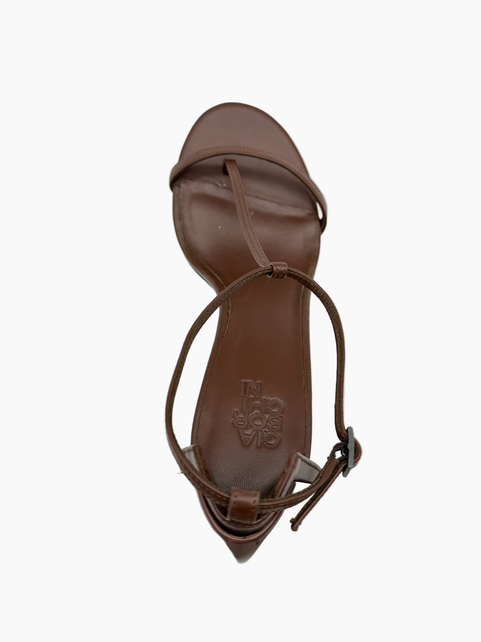 Clean lines and bold character: these brown Gia Borghini sandals captivate with their refined simplicity. The glossy patent leather enhances the sleek silhouette, embellished with a thin T-strap and stiletto heel. An elegant and sophisticated model, perfect for elevating any evening look with discretion and style.