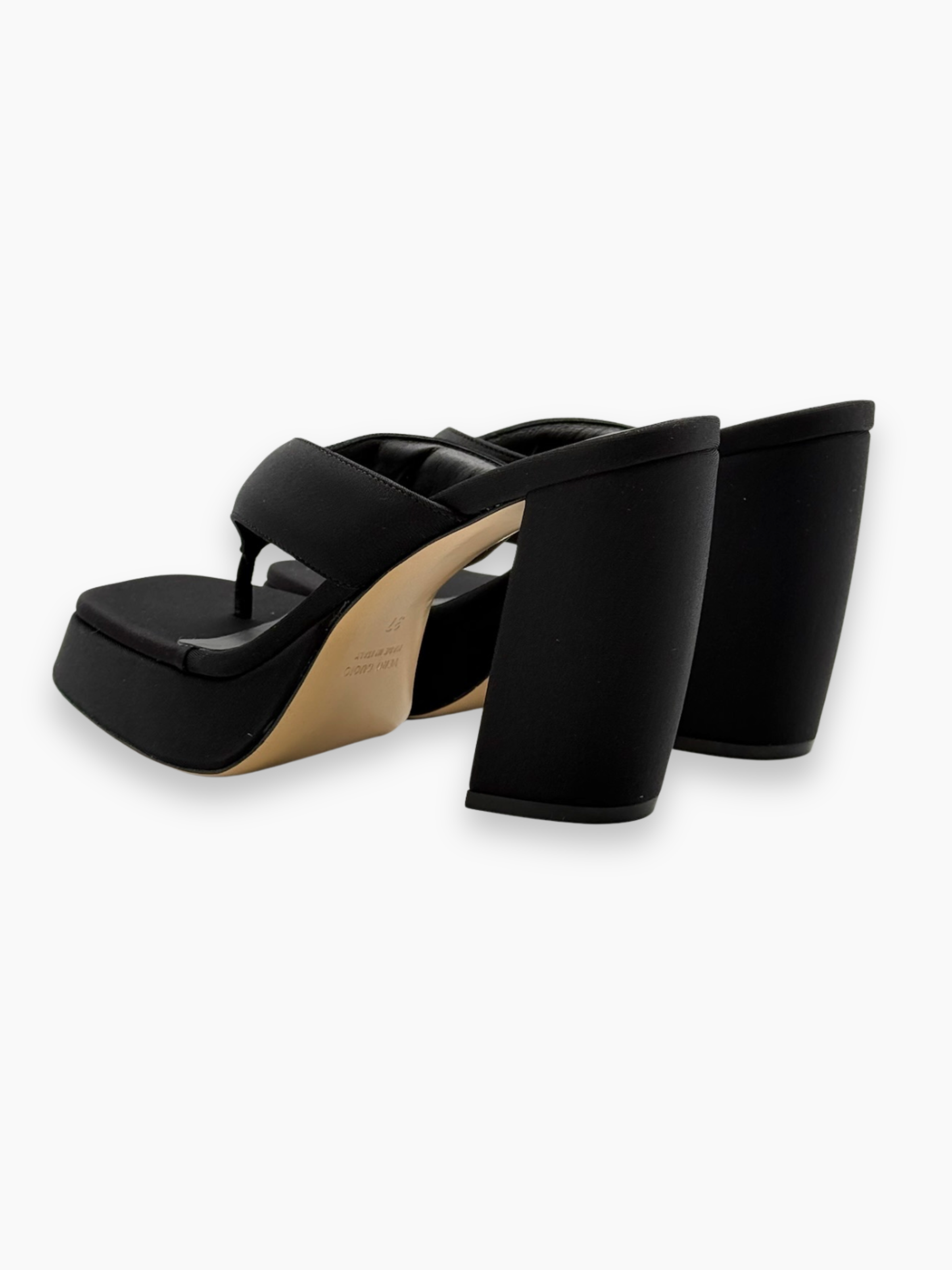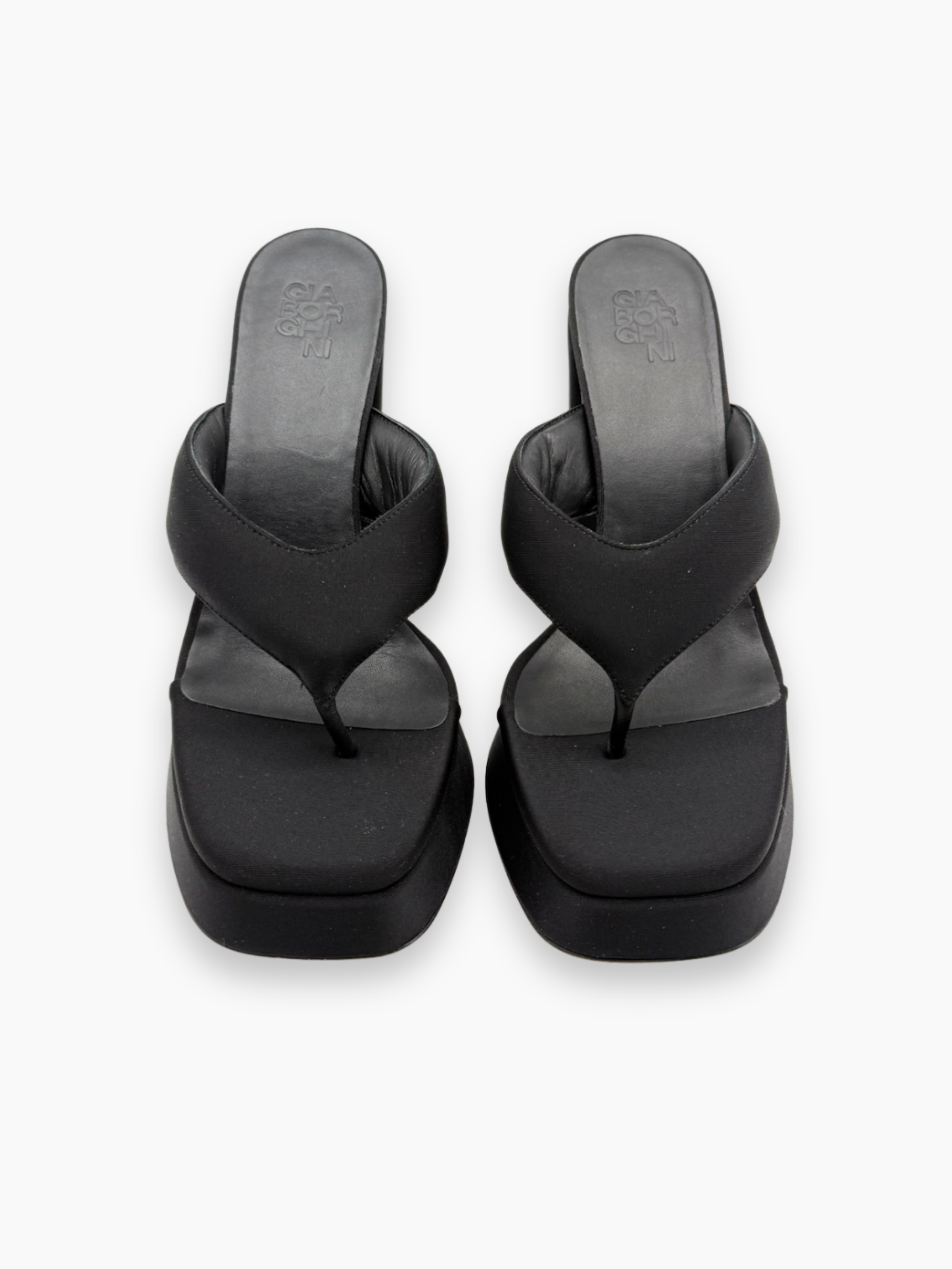 Gia Borghini sandals with a bold, contemporary design, featuring a flip-flop silhouette with a platform and a sculpted block heel. Crafted from black leather, they combine comfort and style, perfect for completing minimalist looks or statement evening outfits.