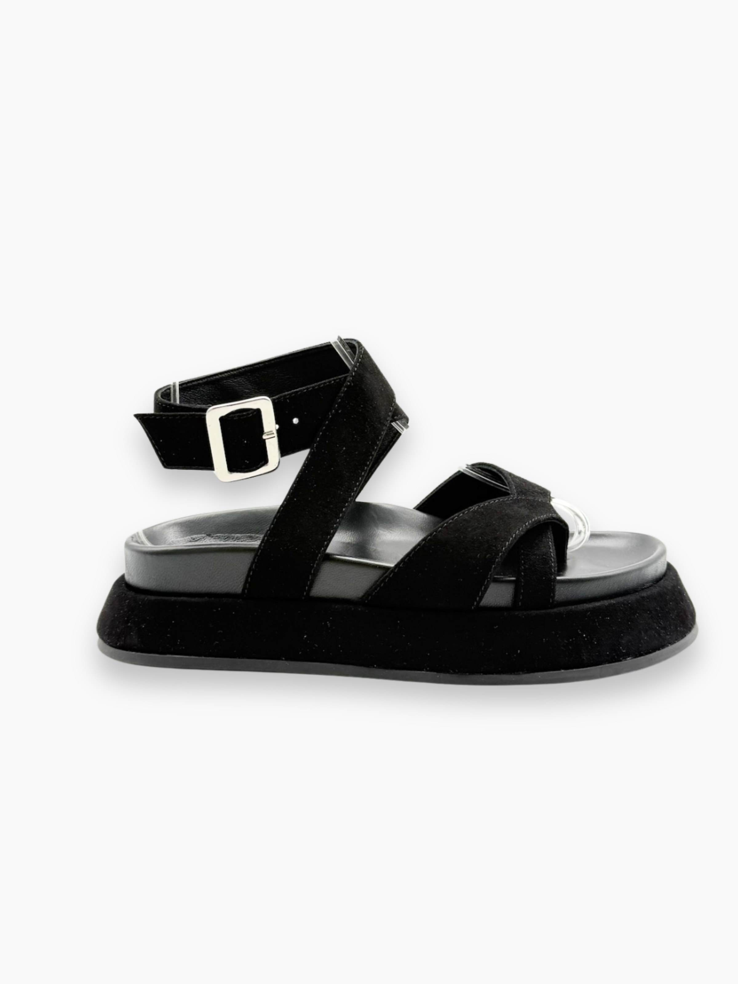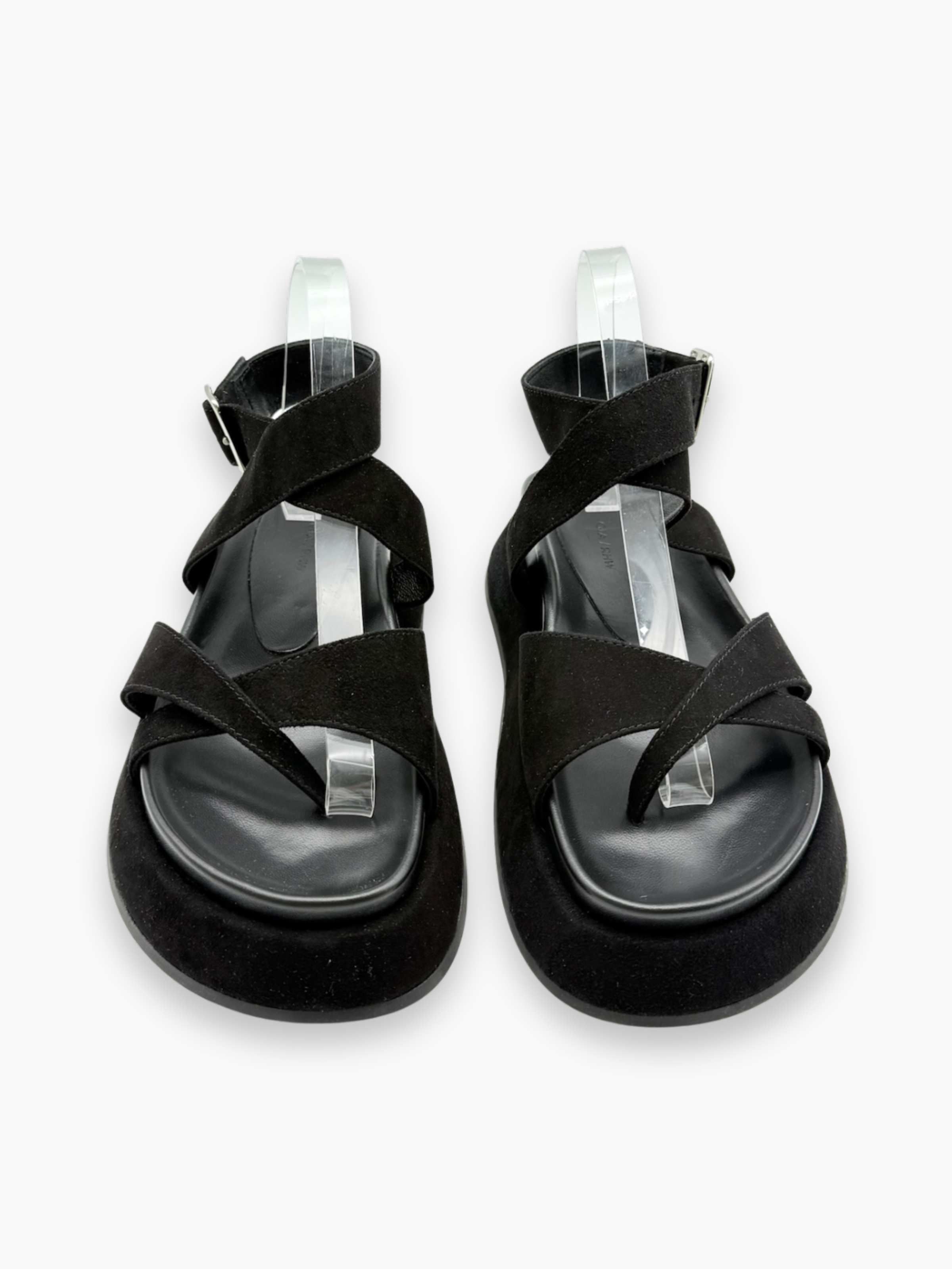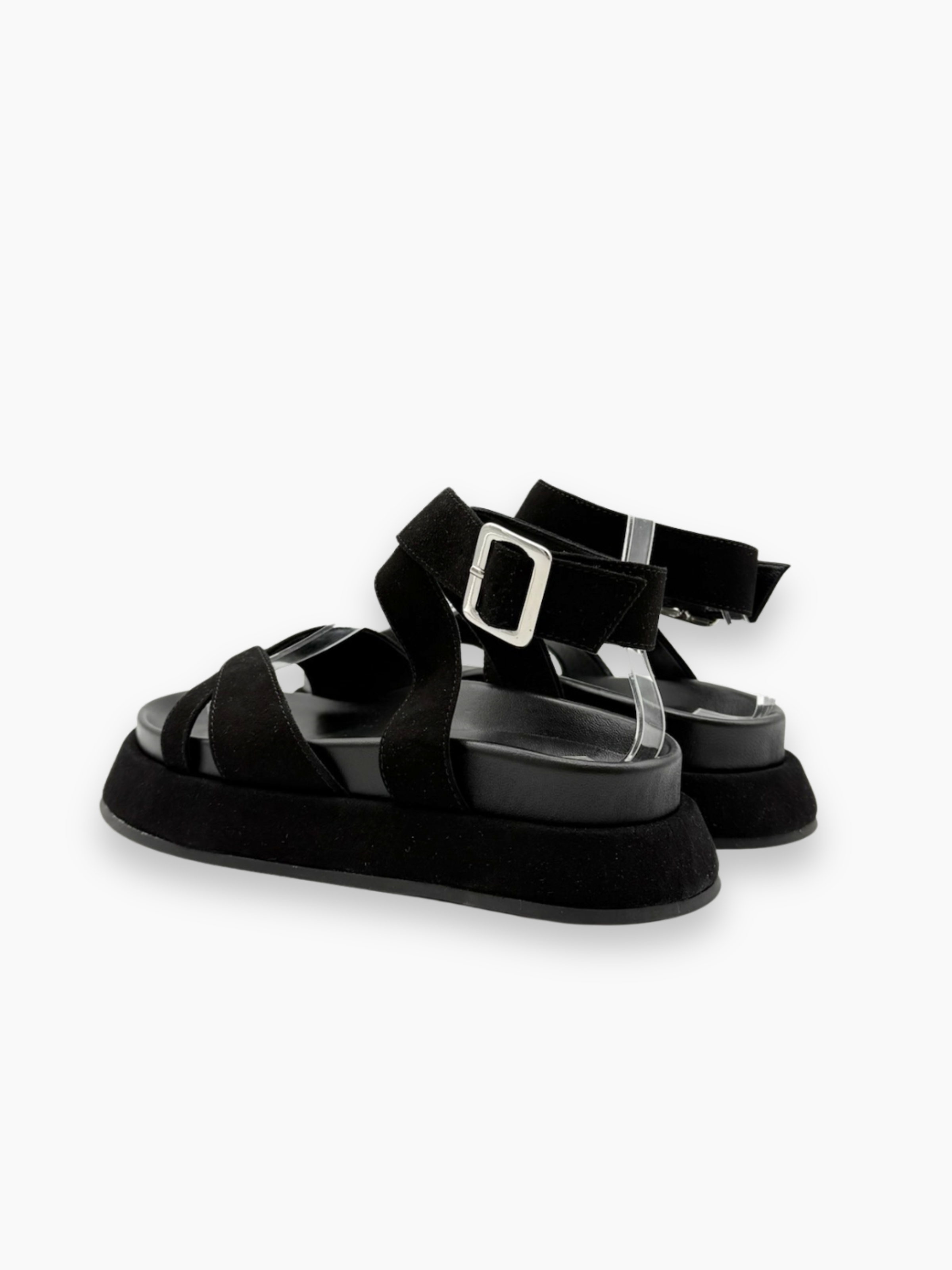 Gia Borghini x Rosie Huntington-Whiteley sandals with a sophisticated and contemporary design. Crafted from soft black leather, they feature crisscross straps, a side buckle closure, and a suede-covered platform sole. Combining comfort and modern minimalism, this style is perfect for completing chic summer looks.