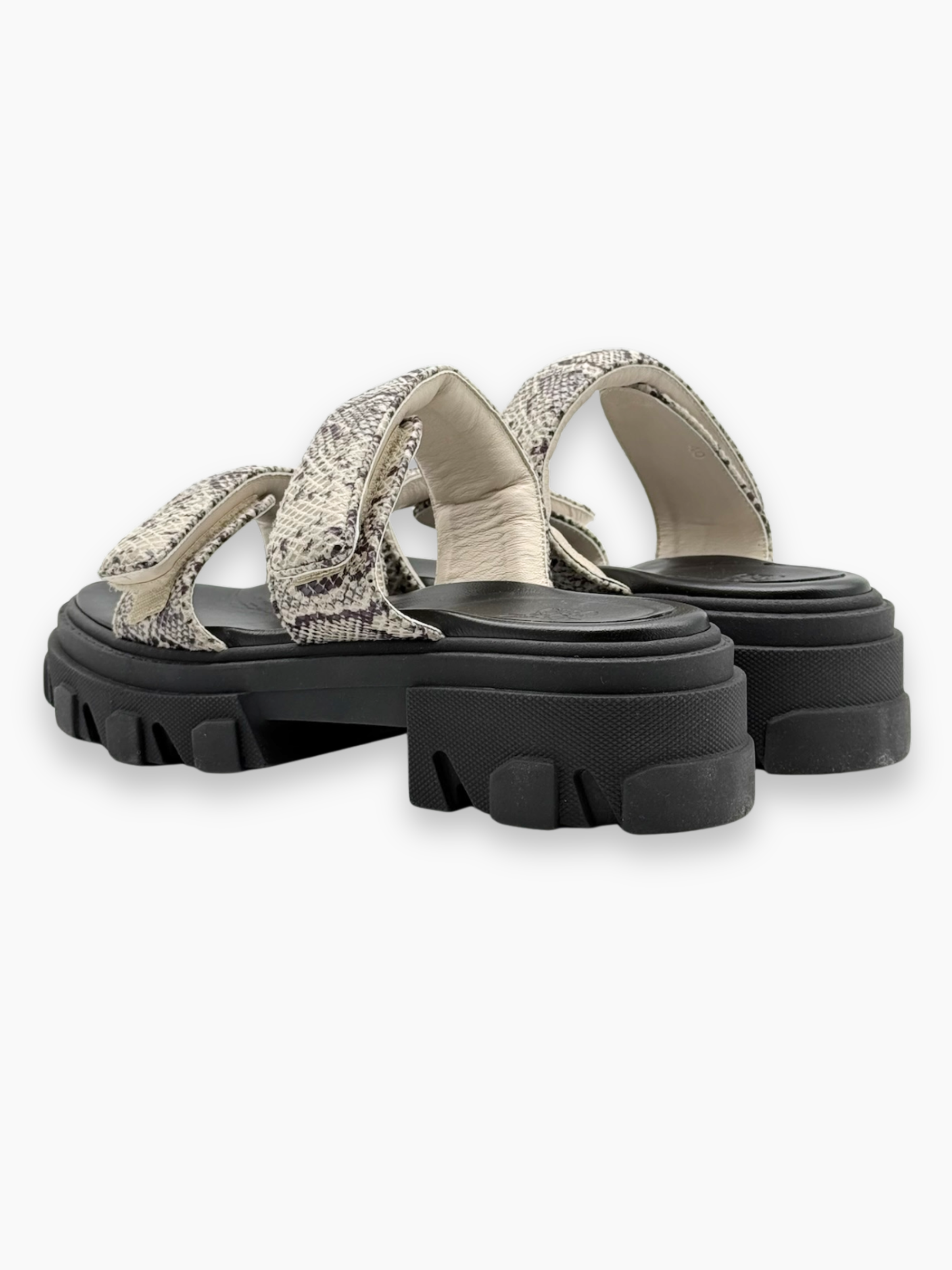 Sandali firmati Gia Borghini, dal carattere deciso e contemporaneo. Realizzati in pelle con stampa effetto pitonato, presentano una suola platform chunky nera che garantisce comfort e stabilità. I doppi listini imbottiti donano un look audace ma versatile, ideale per aggiungere personalità ai tuoi outfit estivi casual o street.