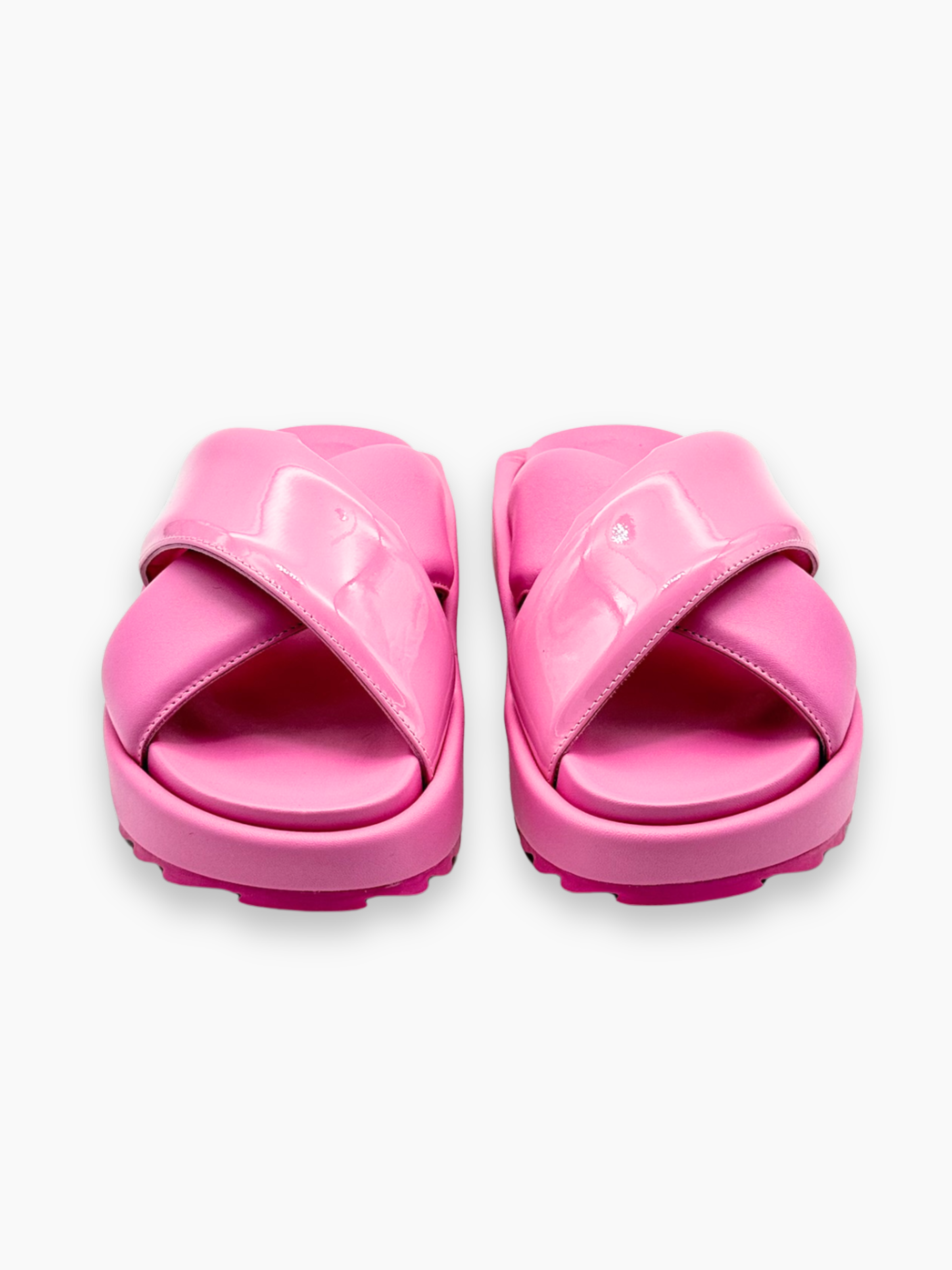 Gia Borghini sandals with crisscrossing pink patent leather straps and a matching platform sole. Contemporary and comfortable, they're the perfect choice for a casual yet sophisticated summer look.