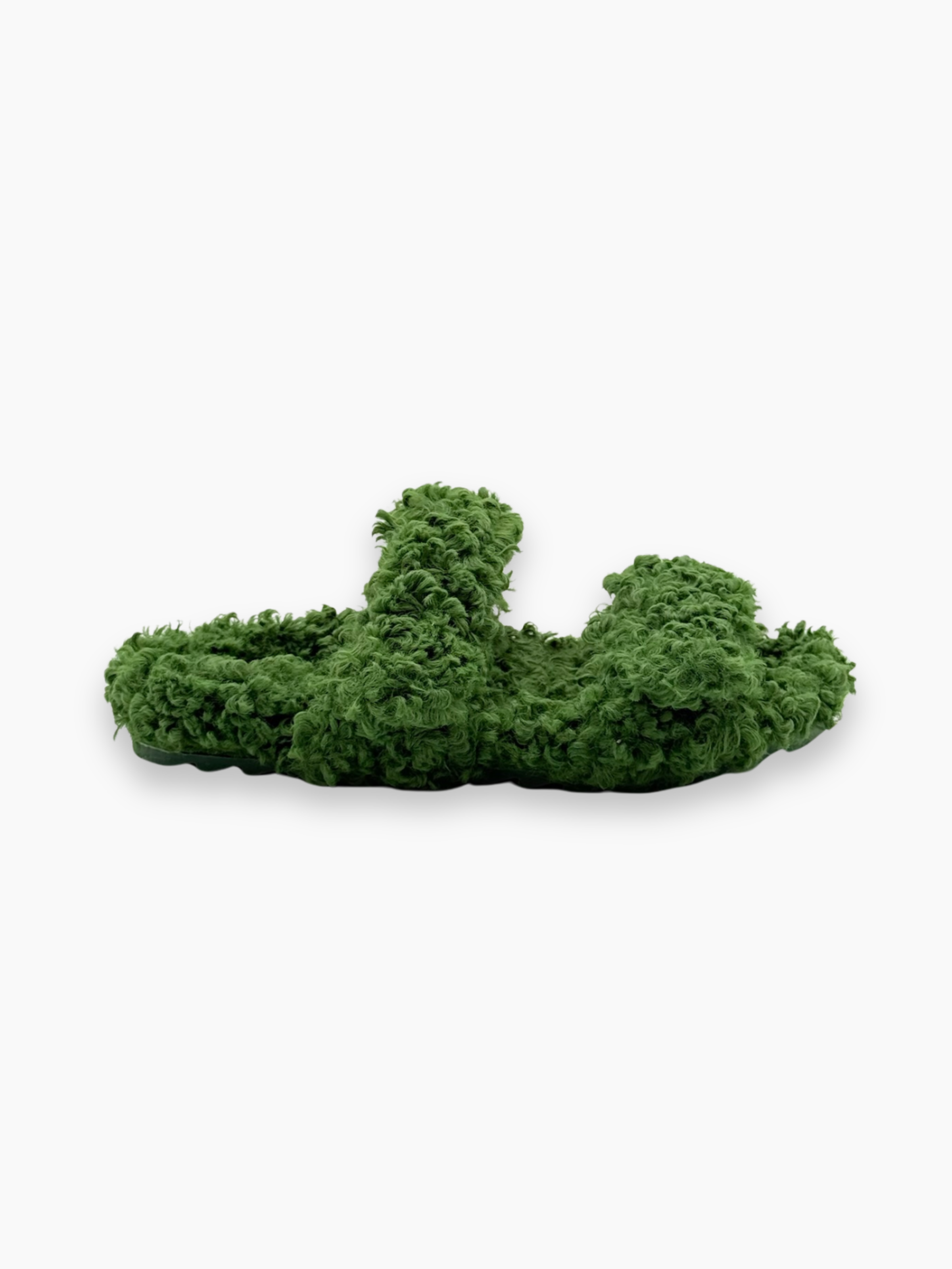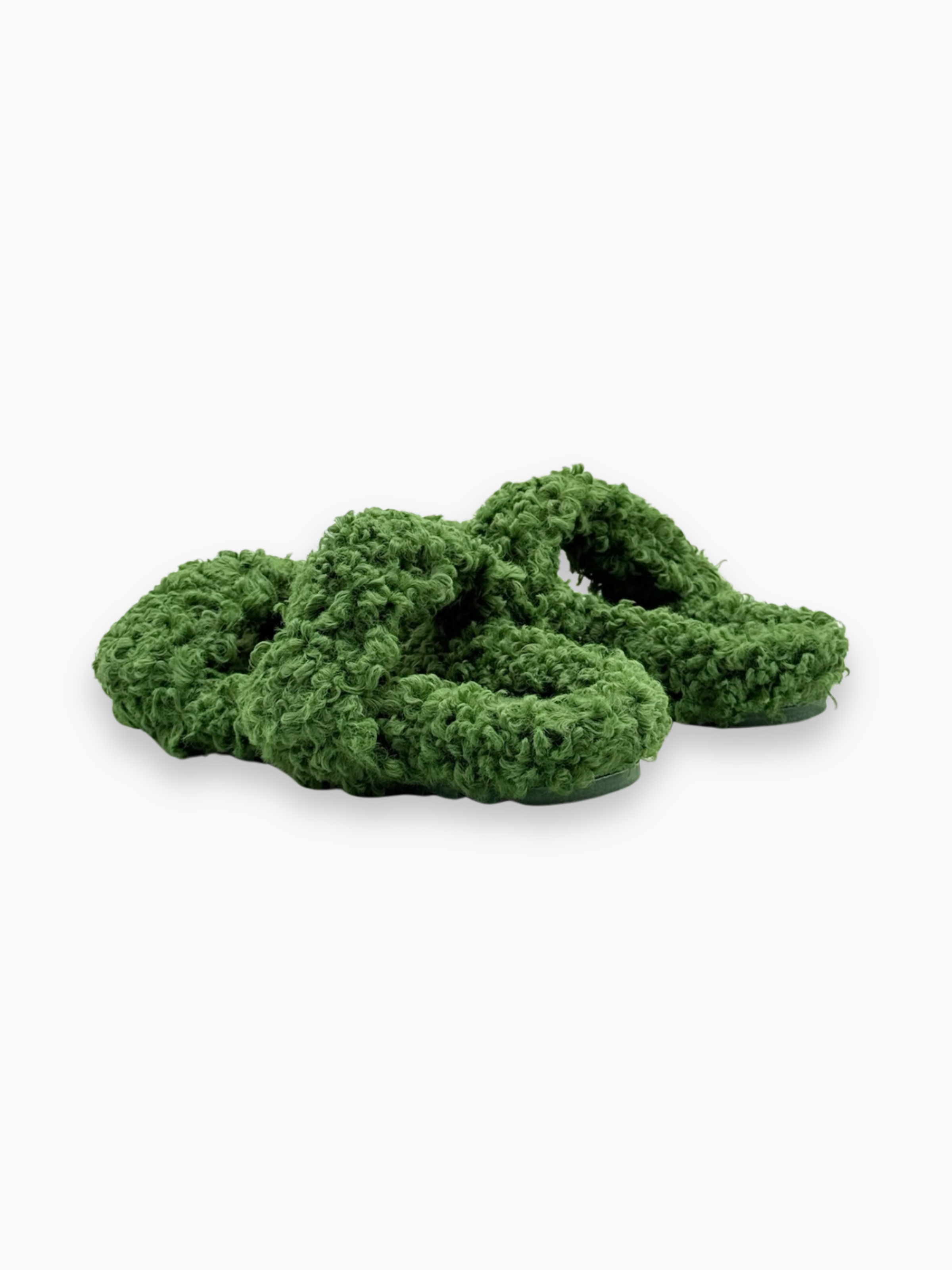 Gia Borghini sandals crafted from soft green shearling, featuring a contemporary, enveloping design. The double padded straps and lightweight rubber sole make them ideal for a cozy yet sophisticated look, perfect both indoors and out.