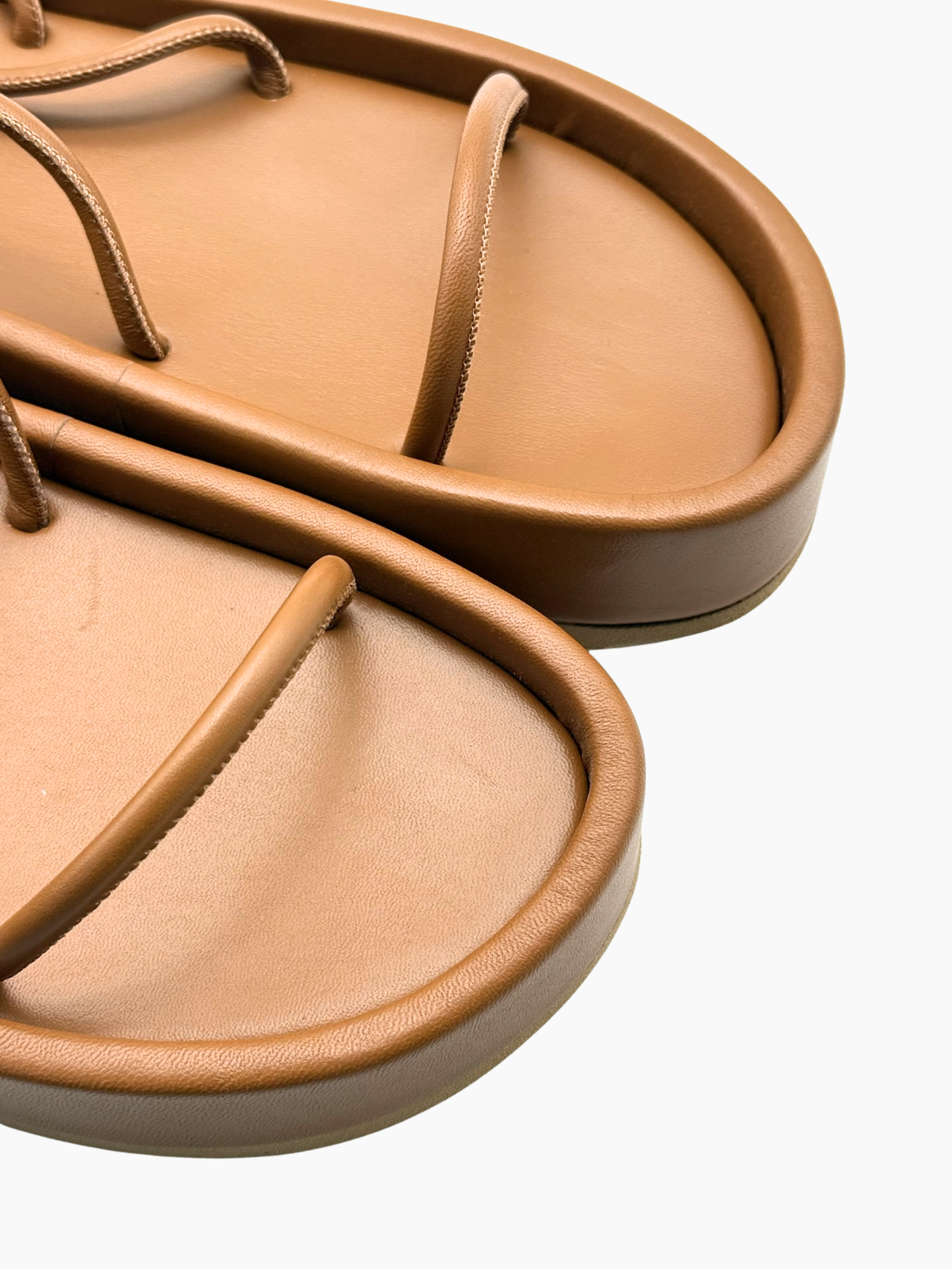 Sandalo basso firmato Ilio Smeraldo realizzato in morbida pelle marrone con suola piatta e lacci sottili da avvolgere alla caviglia. Il design minimal e contemporaneo è esaltato dalla silhouette lineare e dalla tonalità calda e versatile. Un modello perfetto per look estivi sofisticati e senza tempo.