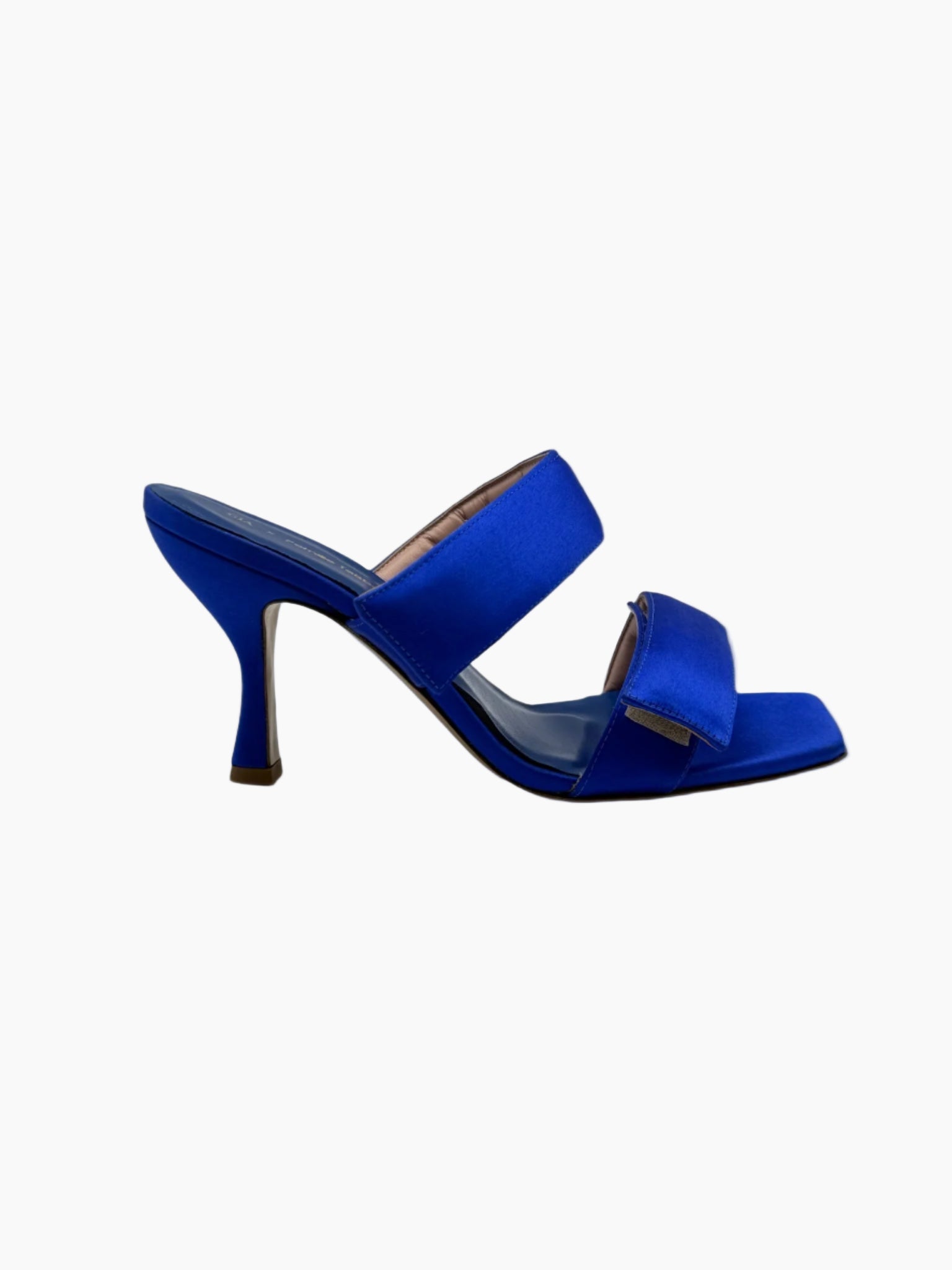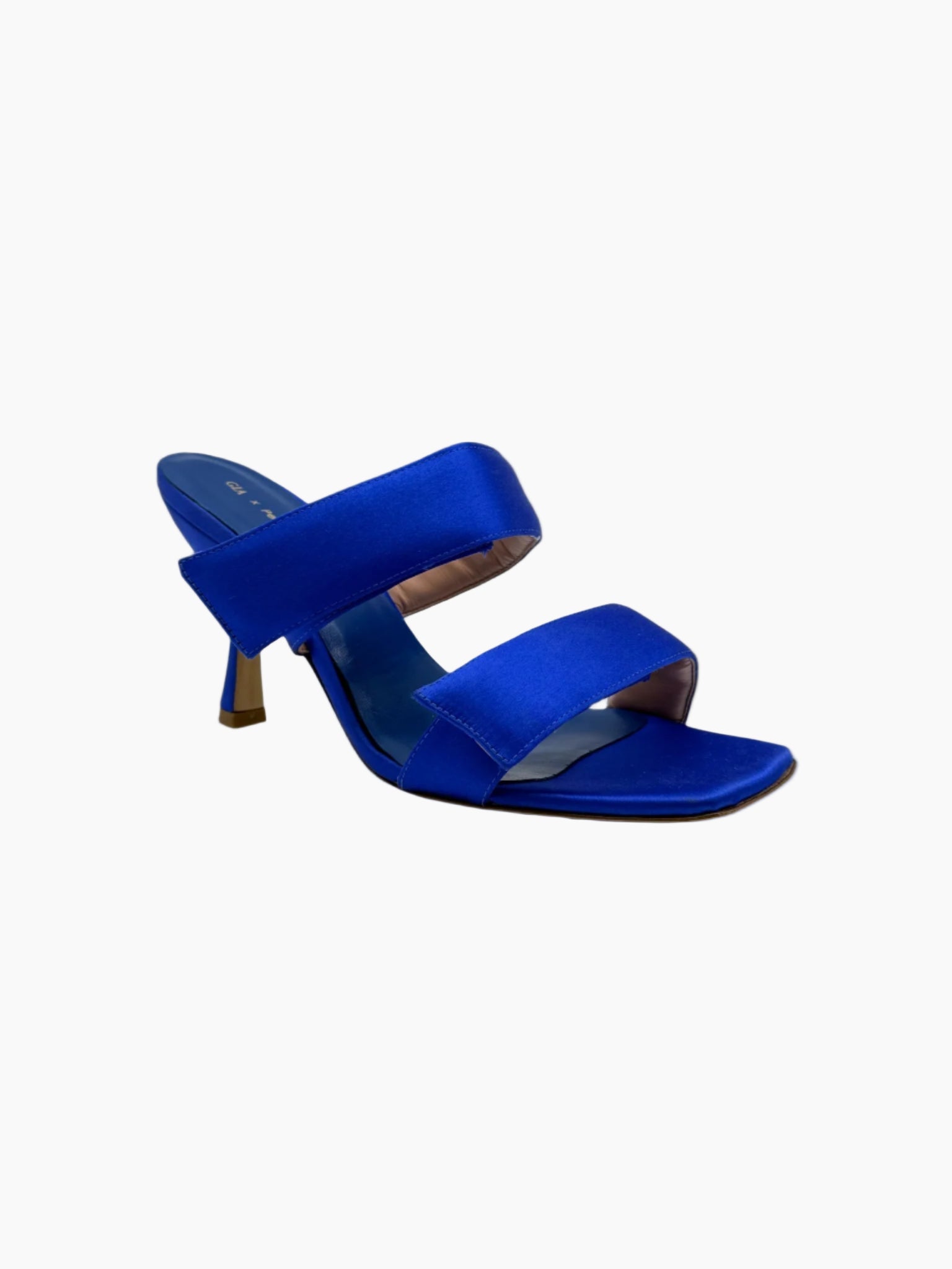 Elegant sandal by Gia Borghini, crafted from electric blue satin with a double strap and a modern silhouette. The spool heel and minimal detailing make it perfect for evening looks or special occasions with a refined and contemporary touch.