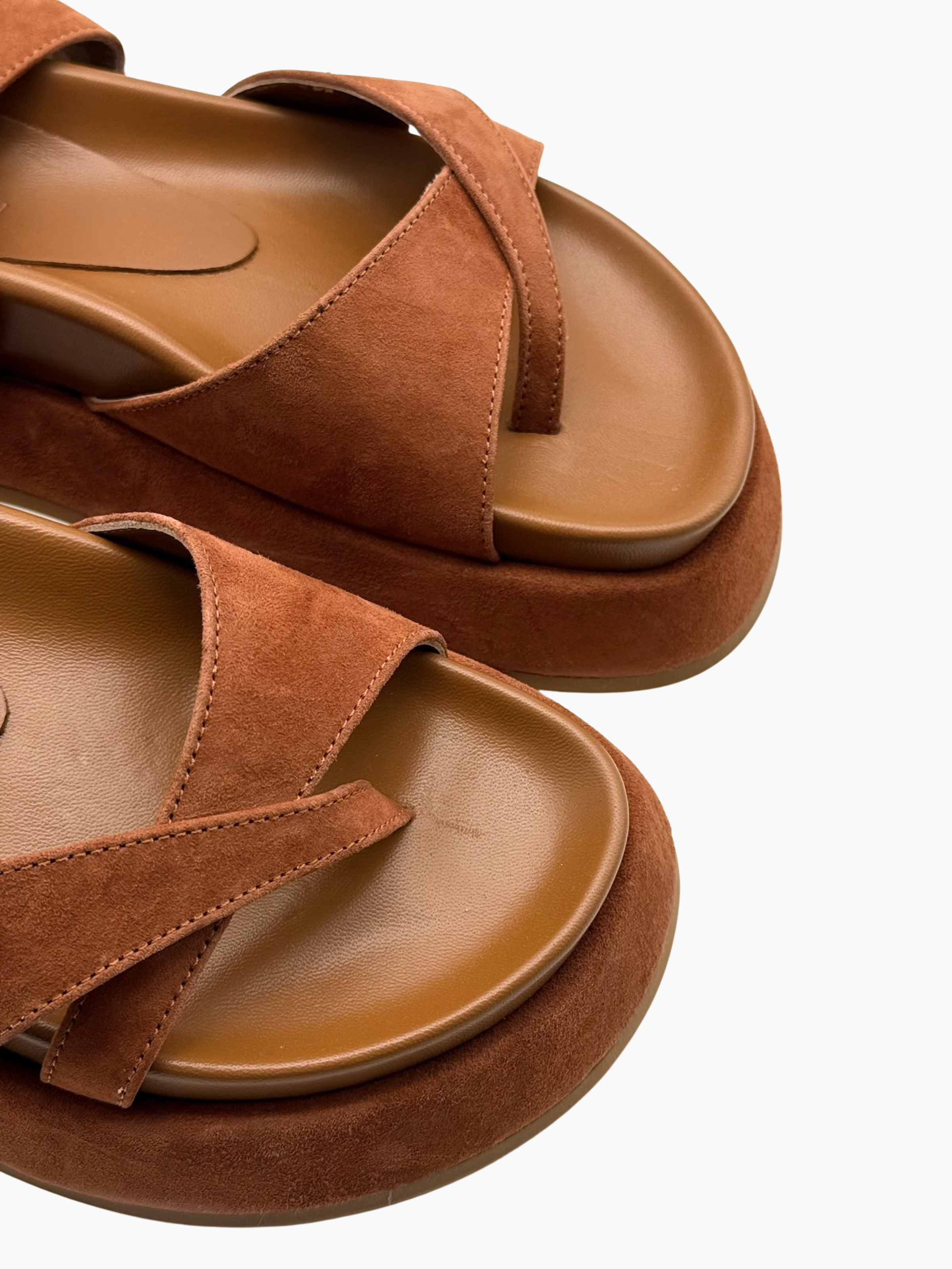 Sandalo firmato Gia Borghini realizzato in morbida pelle scamosciata marrone. Il design incrociato sul davanti e la chiusura con fibbia regolabile donano al modello un look raffinato ma rilassato. La suola piatta con leggera zeppa assicura comfort e stabilità, perfetta per la quotidianità estiva o per outfit casual chic.