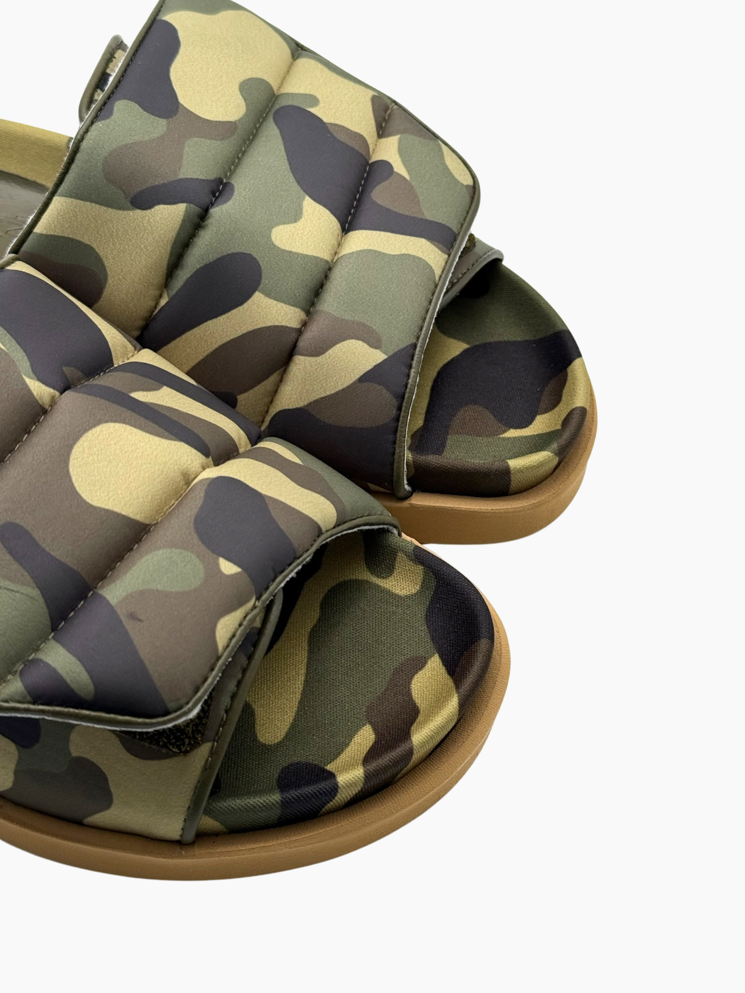 Slide firmata Gia Borghini con stampa camouflage e suola marrone in gomma. Il modello presenta una doppia fascia imbottita con chiusura regolabile a strappo e un design contemporaneo che unisce comfort e stile urbano. Perfetta per un look casual ma ricercato, ideale per la stagione estiva.