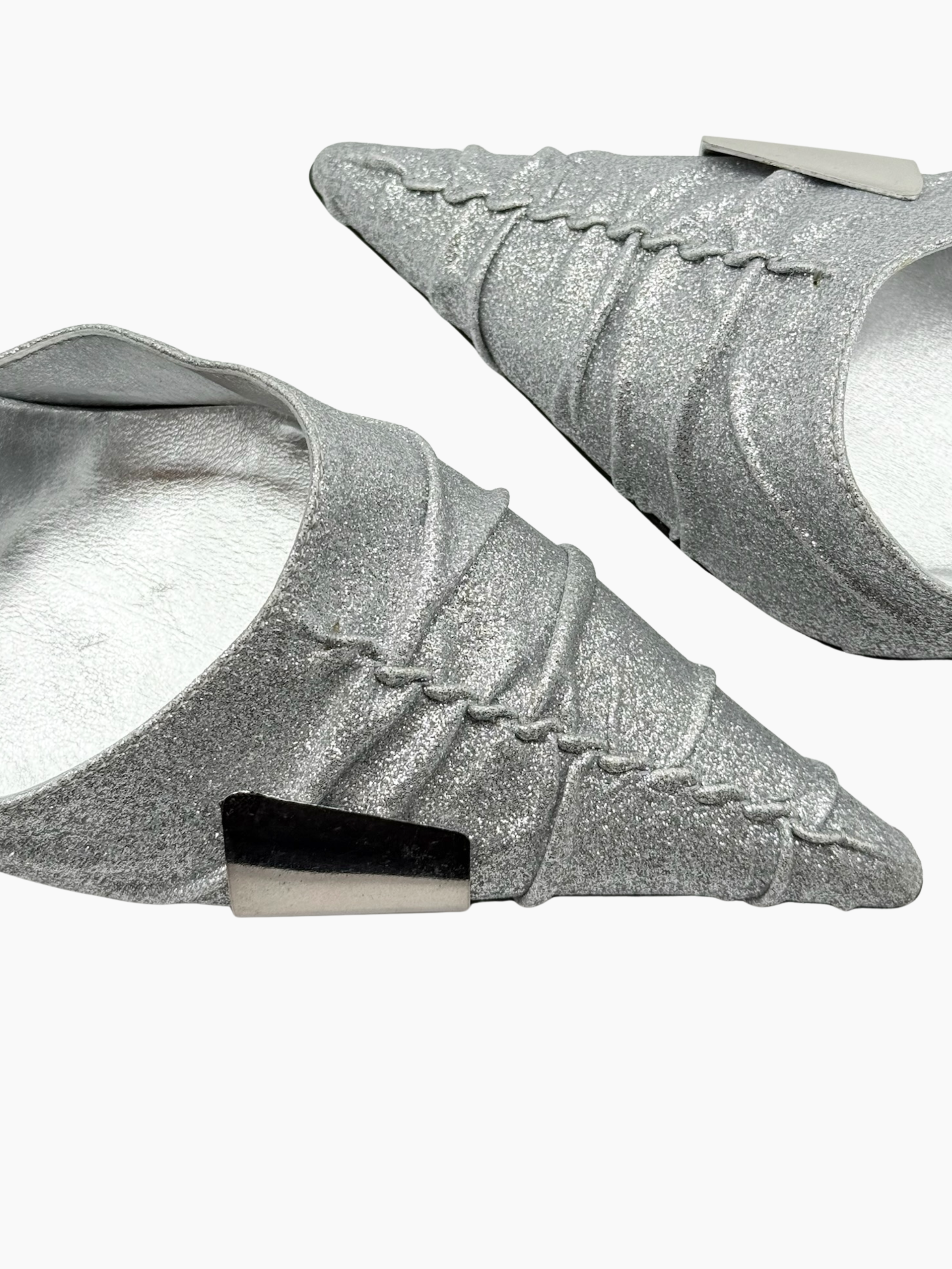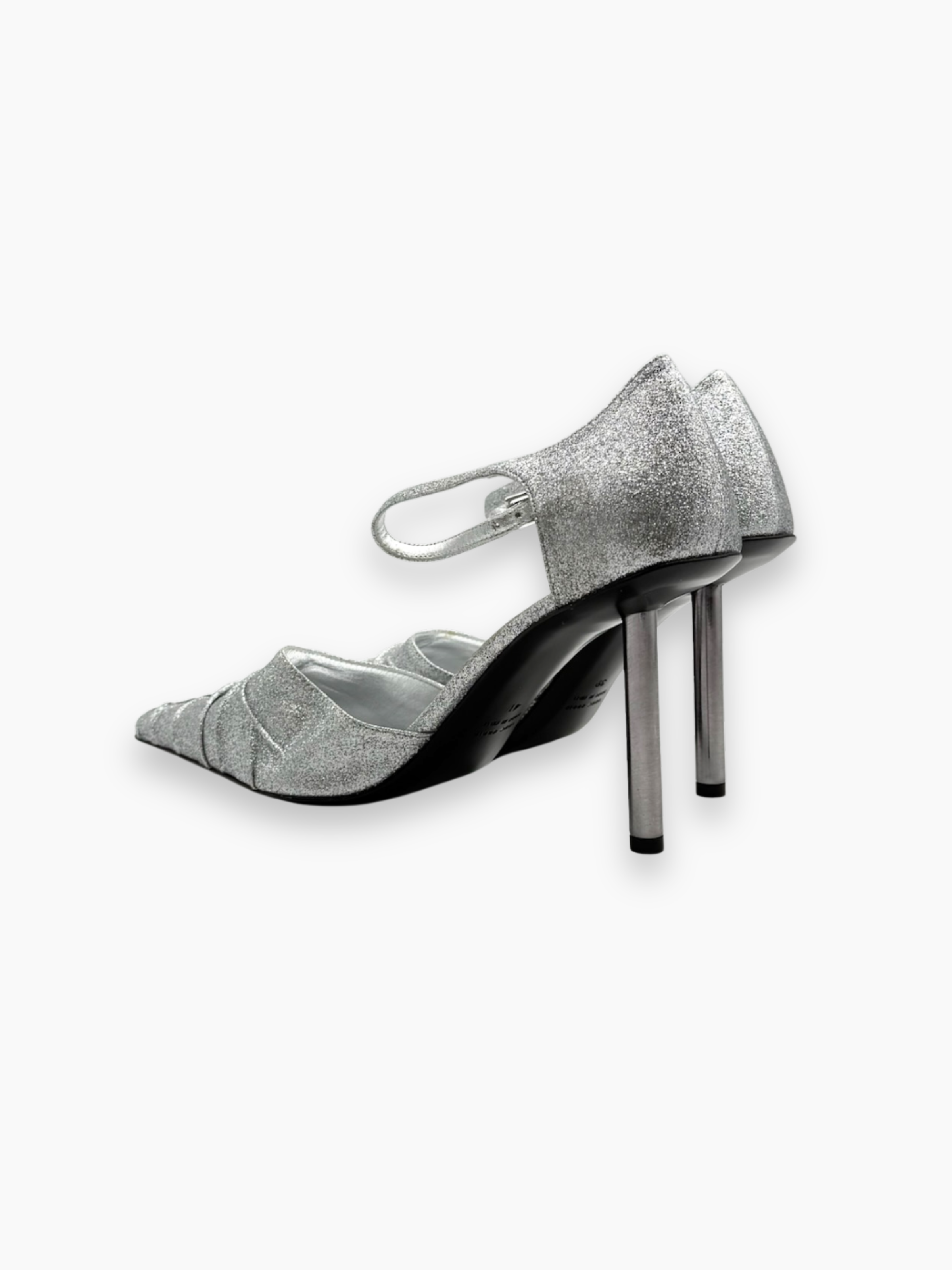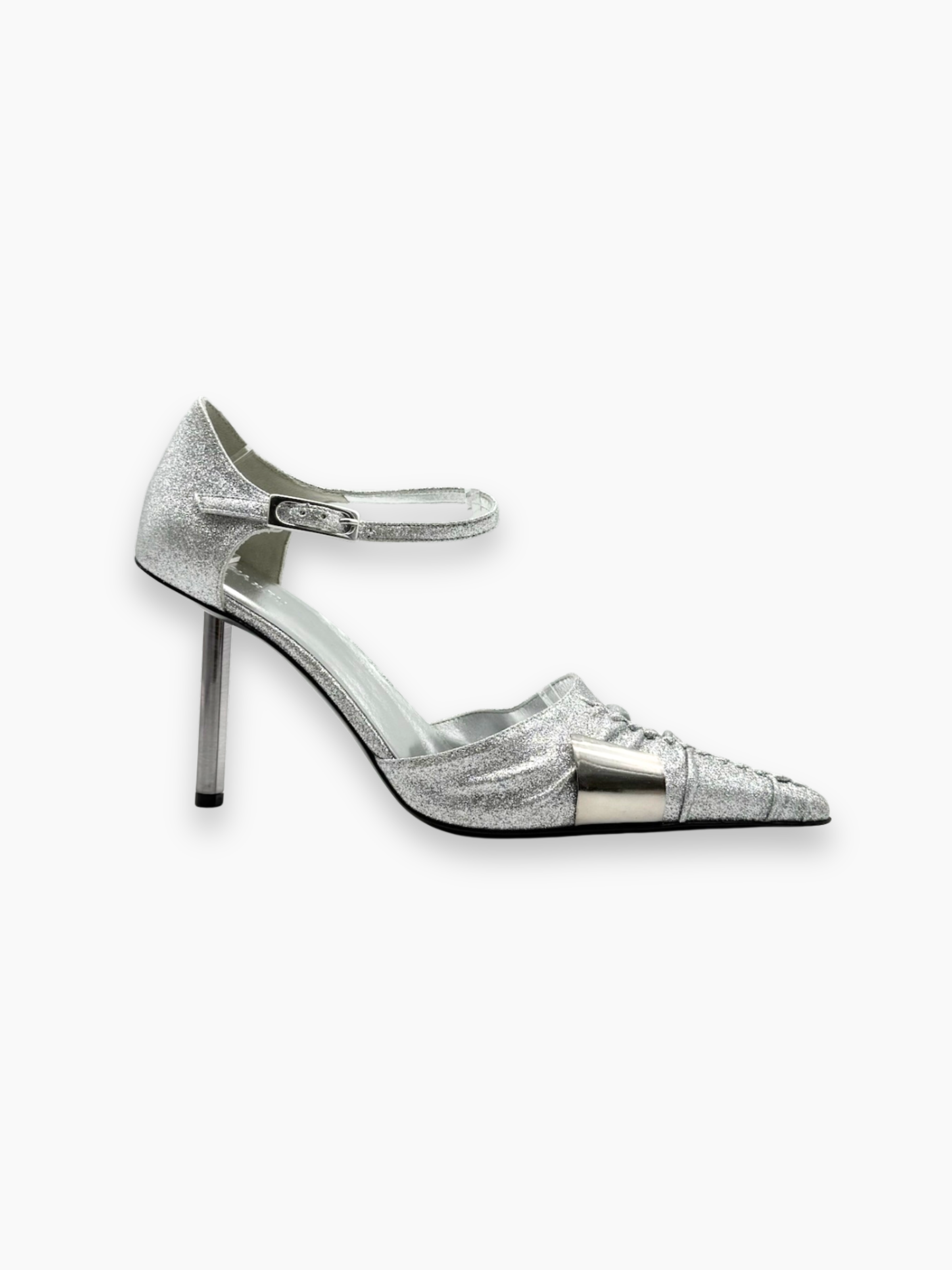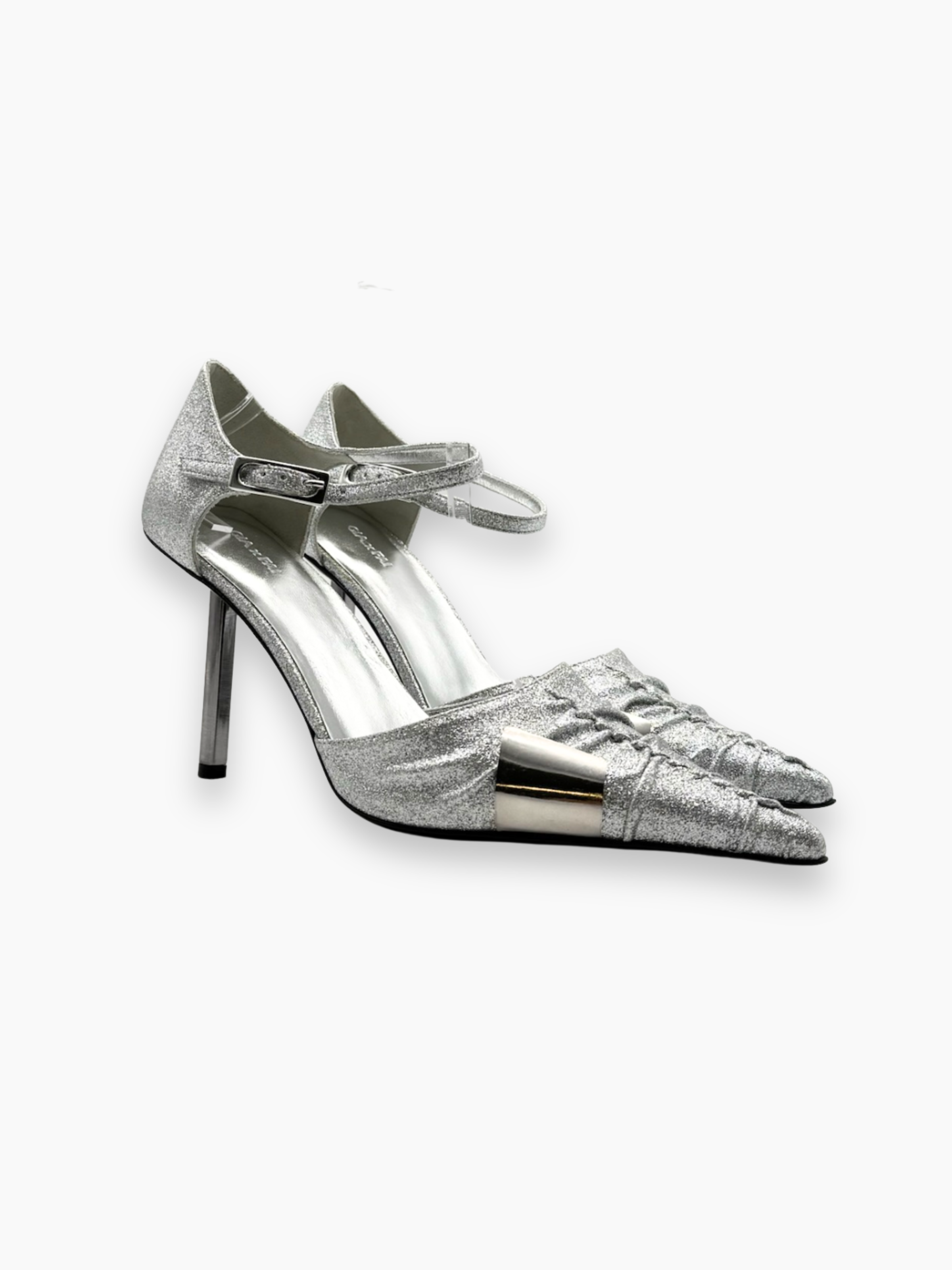Décolleté sofisticate e di carattere firmate Gia Borghini, realizzate in tessuto glitterato argento con punta affusolata e dettaglio metallico frontale. Il cinturino alla caviglia e il tacco a spillo lucido esaltano la silhouette, rendendole perfette per serate eleganti e occasioni speciali.