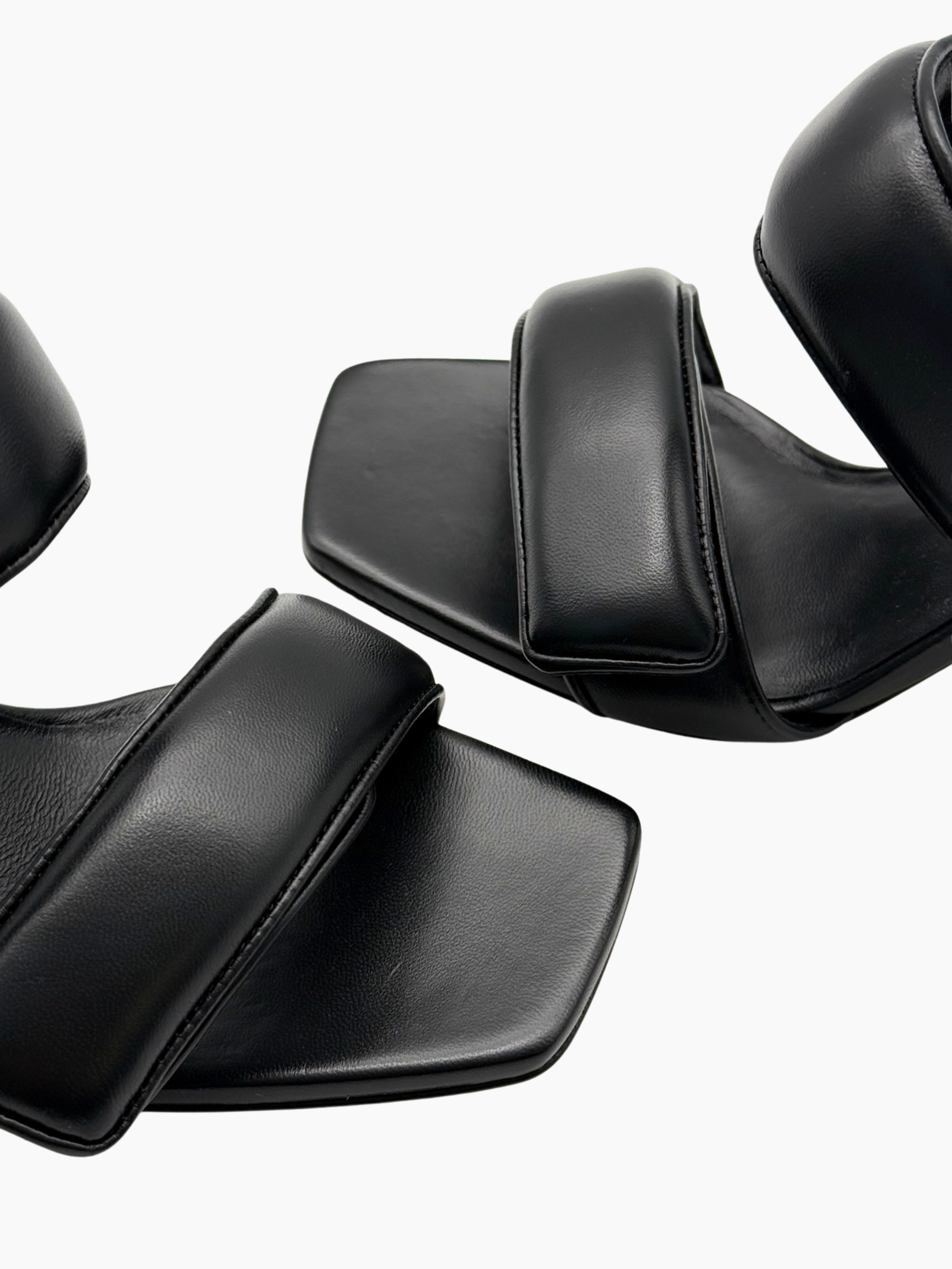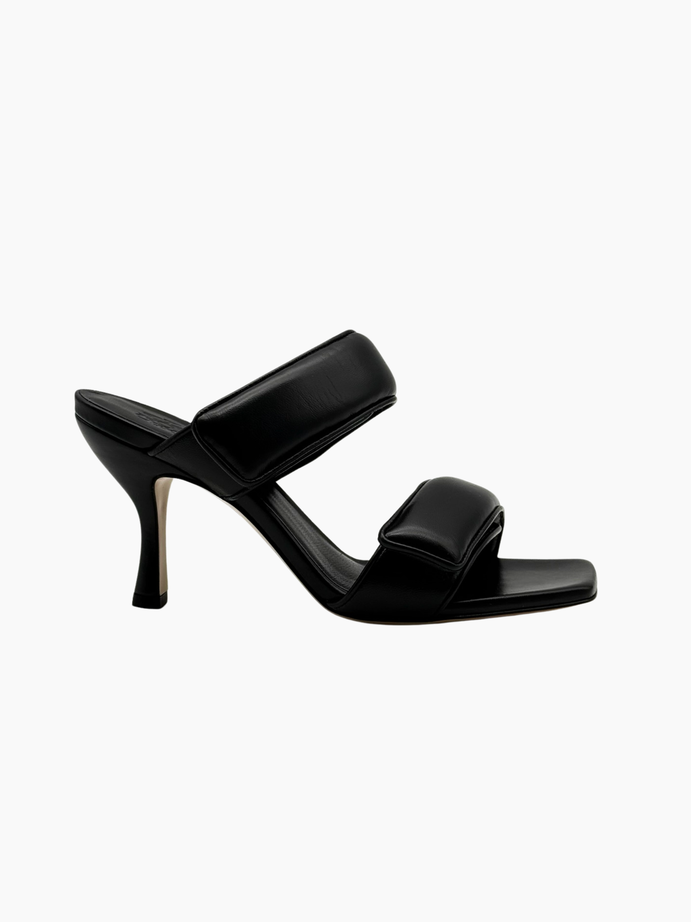 Mule nere firmate Gia Borghini, realizzate in pelle liscia con doppio strap imbottito e chiusura con velcro. Il design moderno e scultoreo del tacco medio dona equilibrio tra comfort e raffinatezza, rendendo questo modello perfetto per look serali e outfit da città.