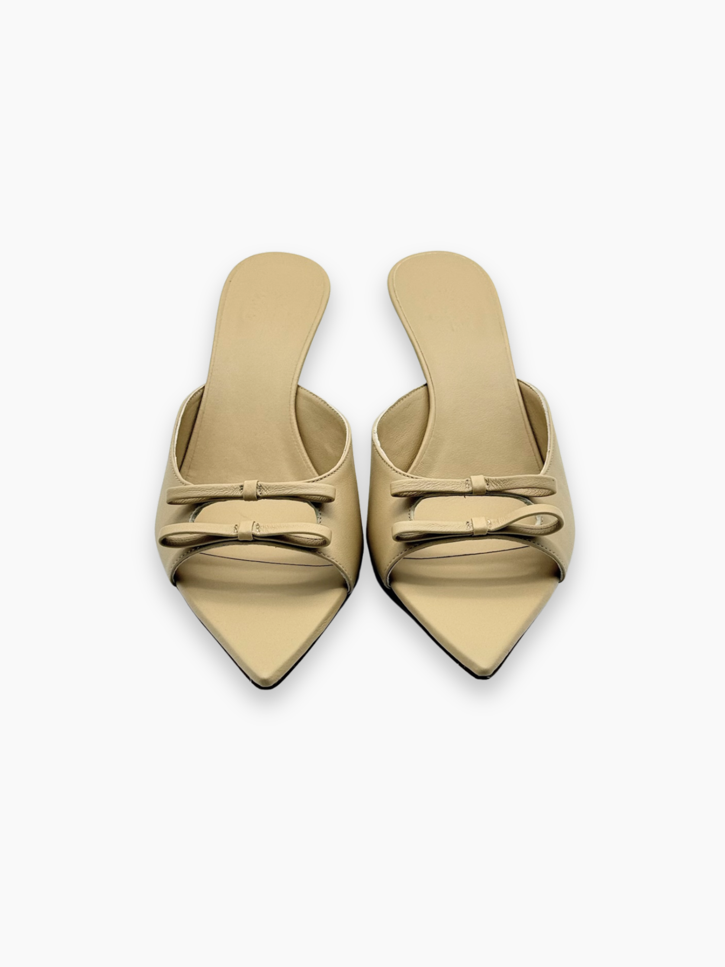 Gia Borghini mules with an elegant and minimalist style, crafted from soft beige leather. The pointed toe with a small decorative bow and kitten heel lends a discreet and feminine elegance, perfect for sophisticated looks both day and evening.