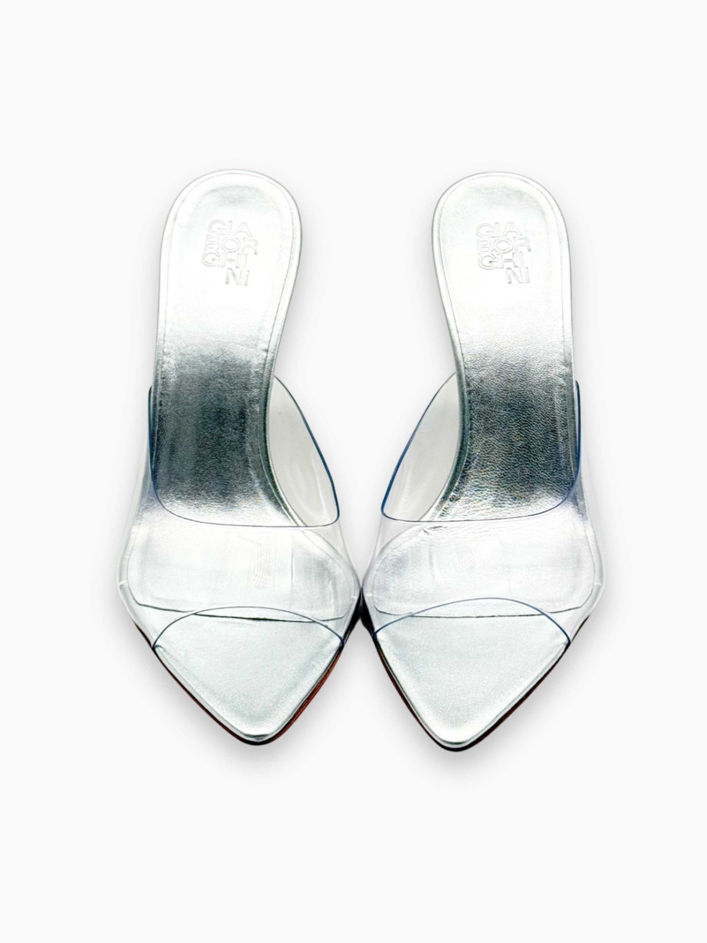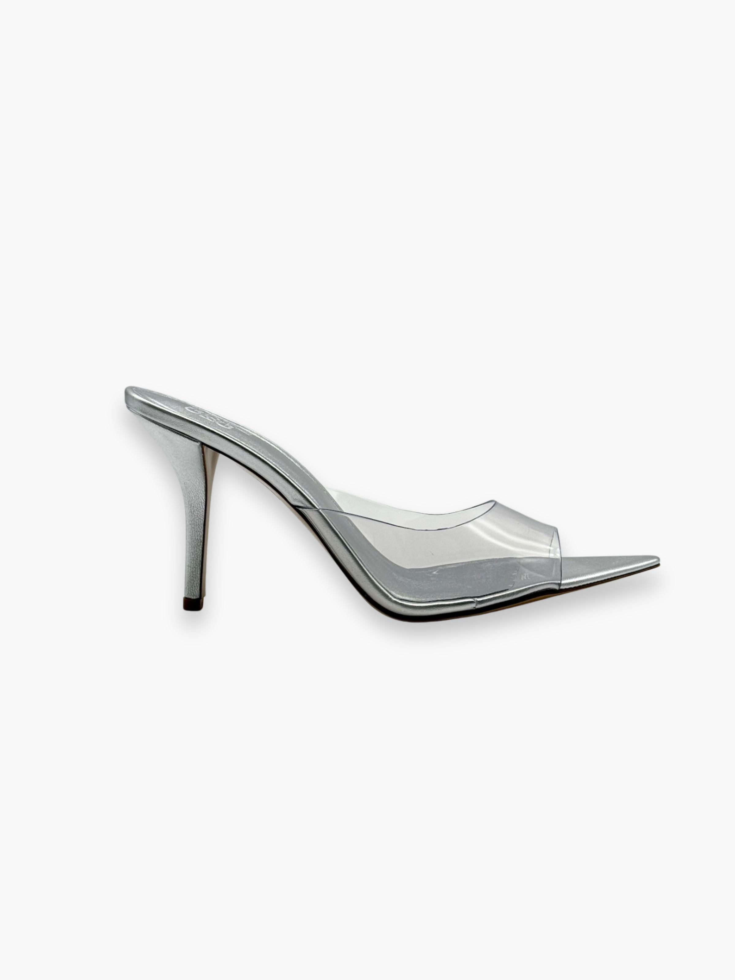 Gia Borghini sandals with a silver leather base and a transparent PVC band. The minimal, contemporary design accentuates the figure, while the slim heel elegantly slims the figure. Perfect for evening wear or special events.
