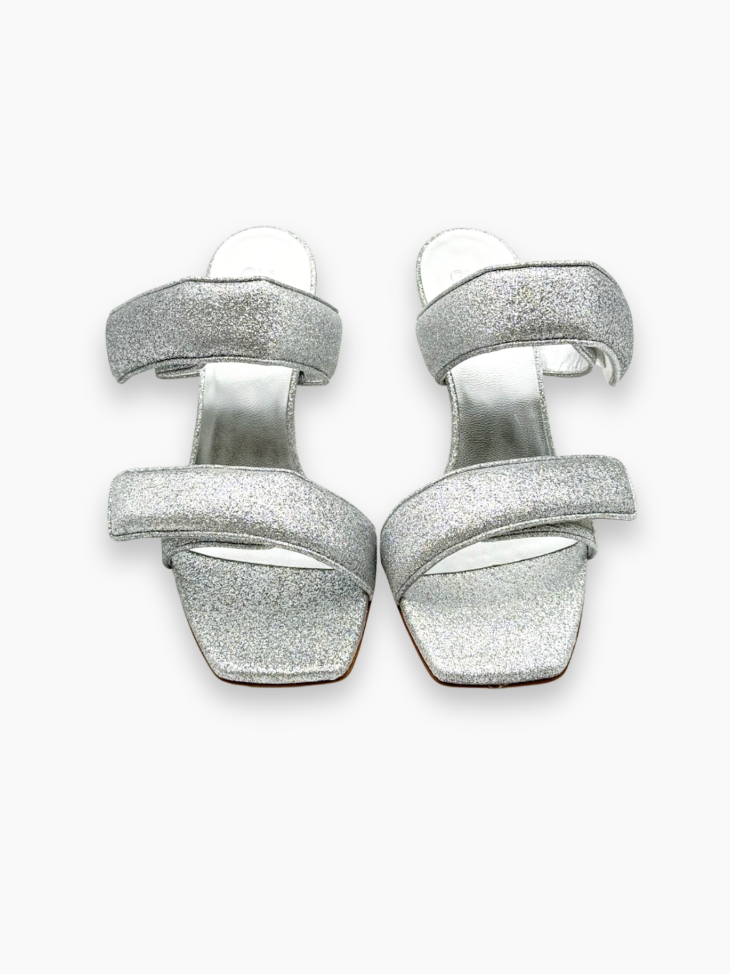 Gia Borghini sandals in silver glitter fabric with a double padded strap and a thin heel. A bright and sophisticated style that adds a touch of glamour to any outfit, perfect for evening looks or special occasions.