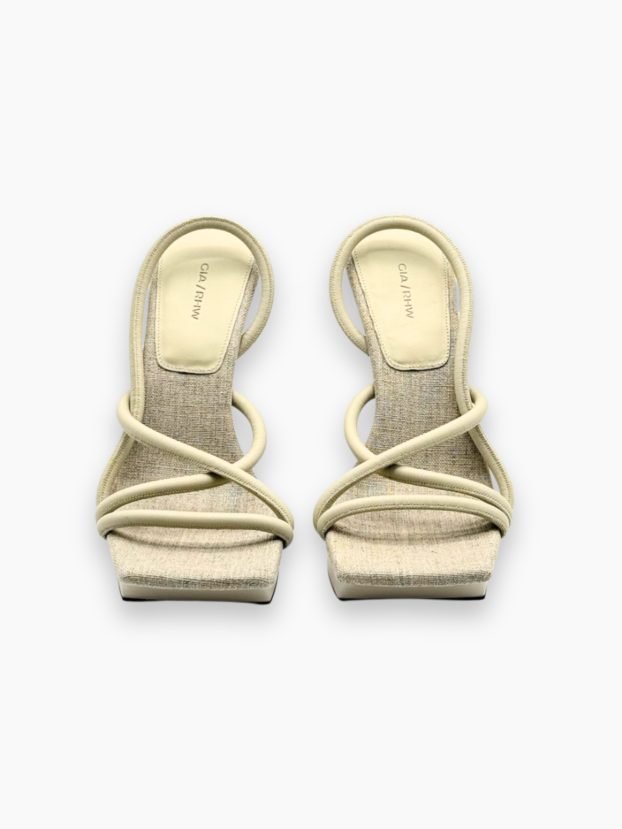 Sandali raffinati firmati Gia Borghini in collaborazione con Rosie Huntington-Whiteley. Realizzati in raso beige, presentano una struttura con zeppa affusolata e sottili listini intrecciati che donano un tocco sofisticato e contemporaneo. La punta squadrata completa il design minimal e moderno, perfetto per look estivi chic.