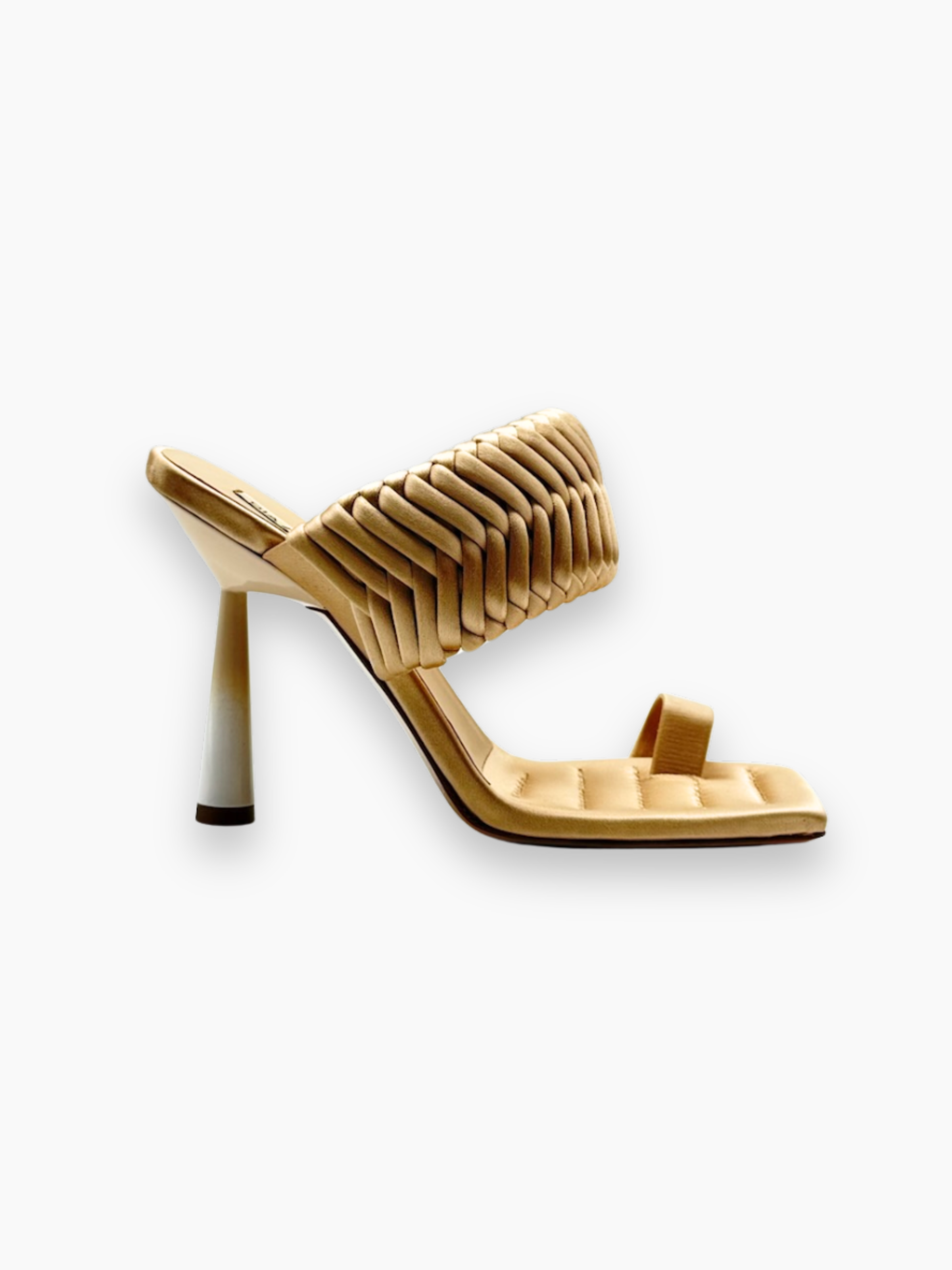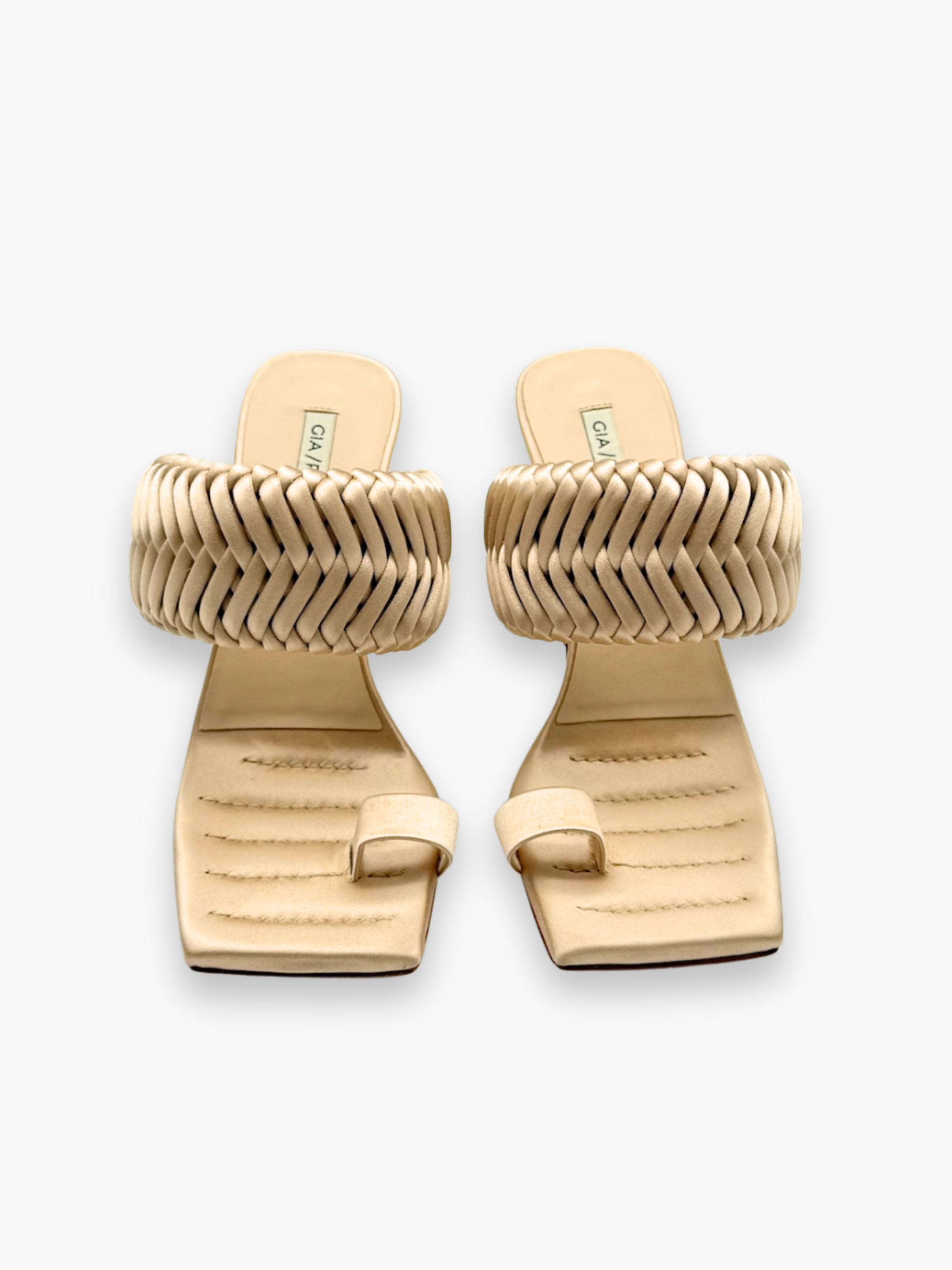 Gia Borghini x Rosie Huntington-Whiteley beige leather sandals with a wide quilted strap and square toe. The sculptural heel gives the style a distinctive, modern elegance, perfect for day or evening outfits.