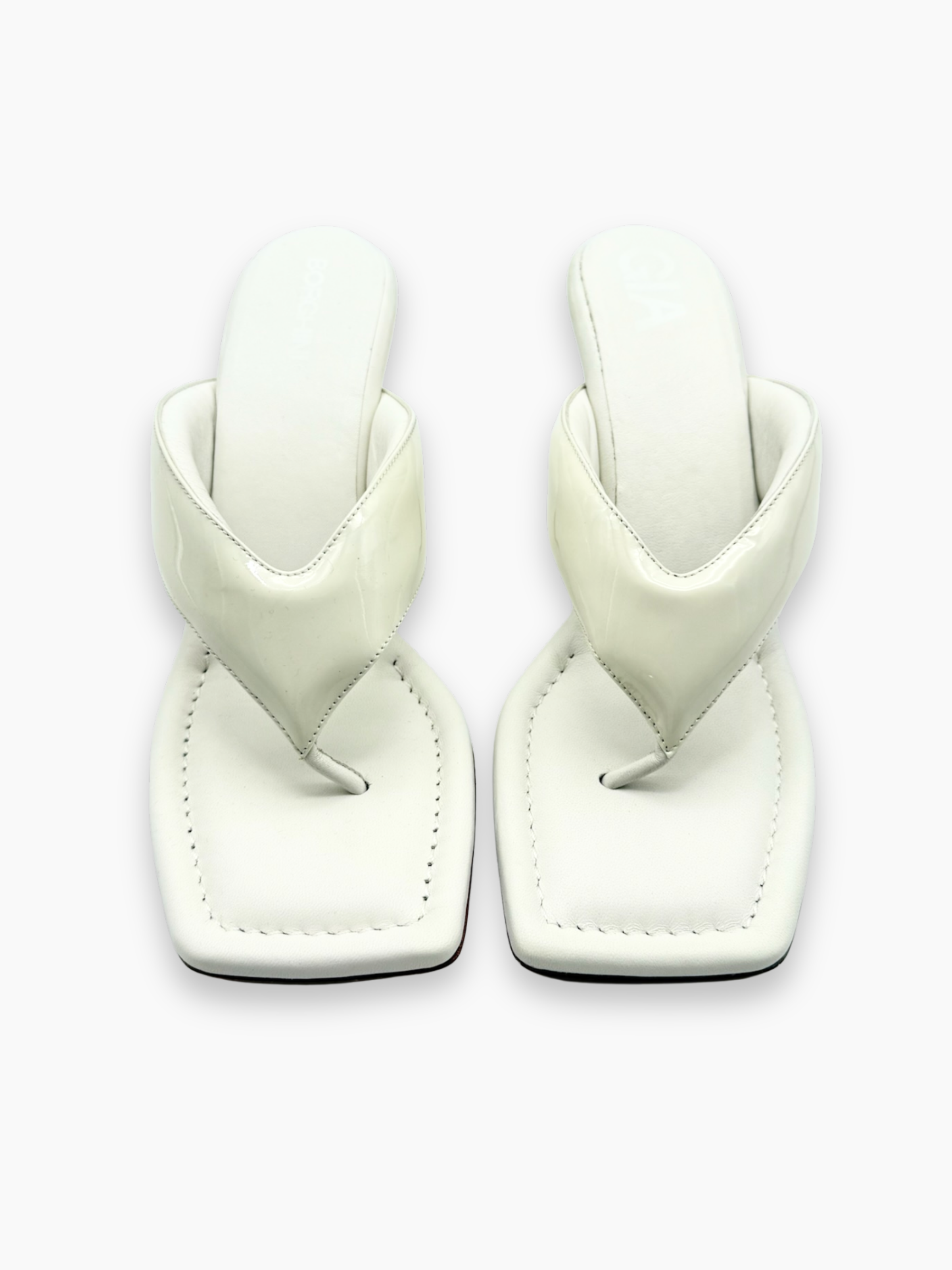 Gia Borghini sandals crafted from soft white leather, featuring a flip-flop design and a sculptural, sinuous wedge. A modern and refined shoe that combines comfort and style, ideal for adding a touch of sophistication to summer looks.