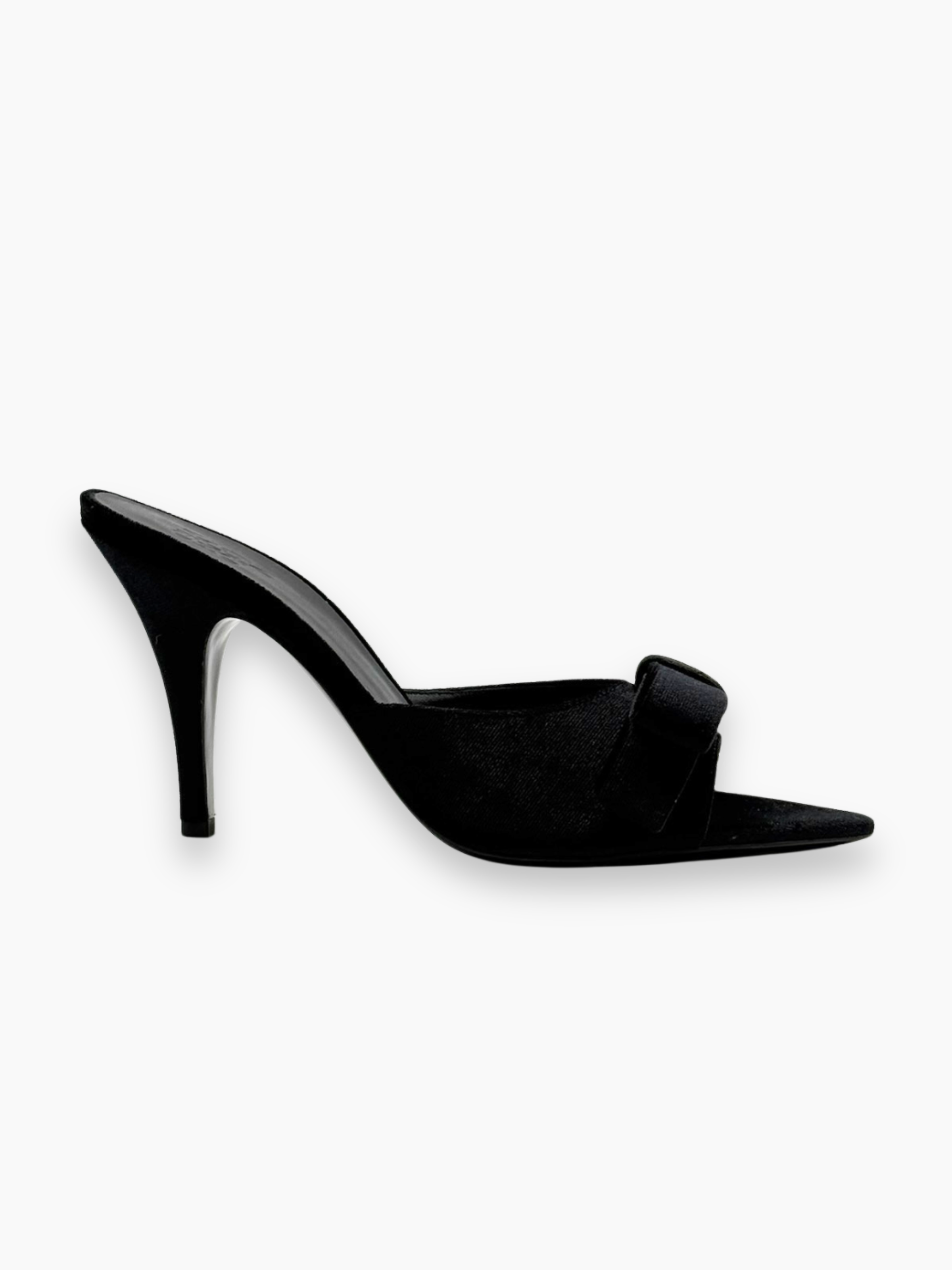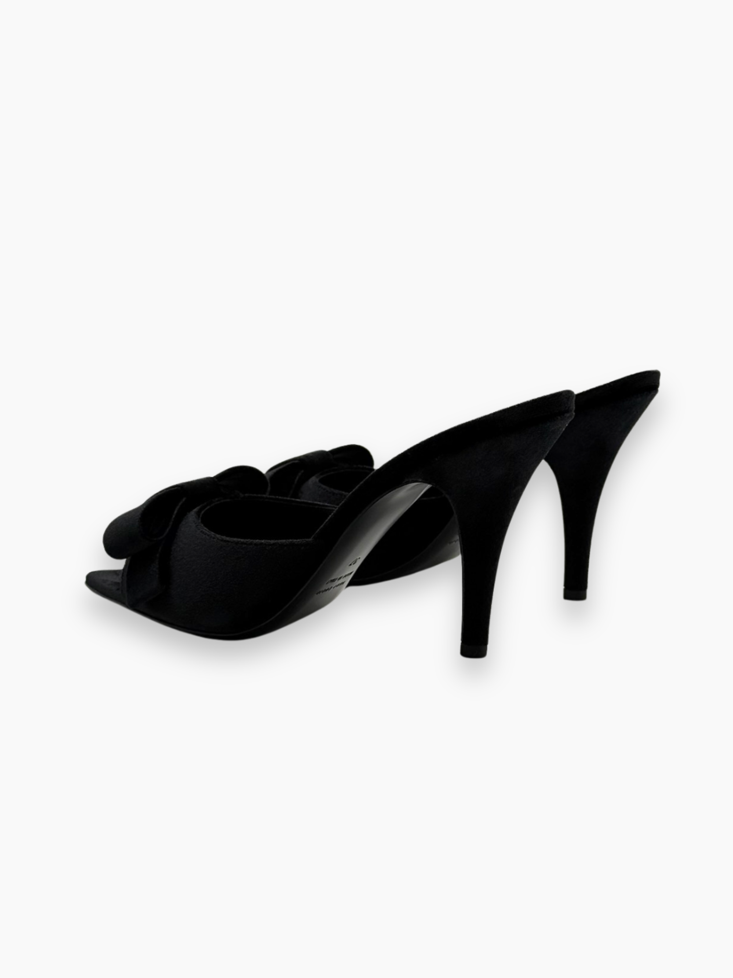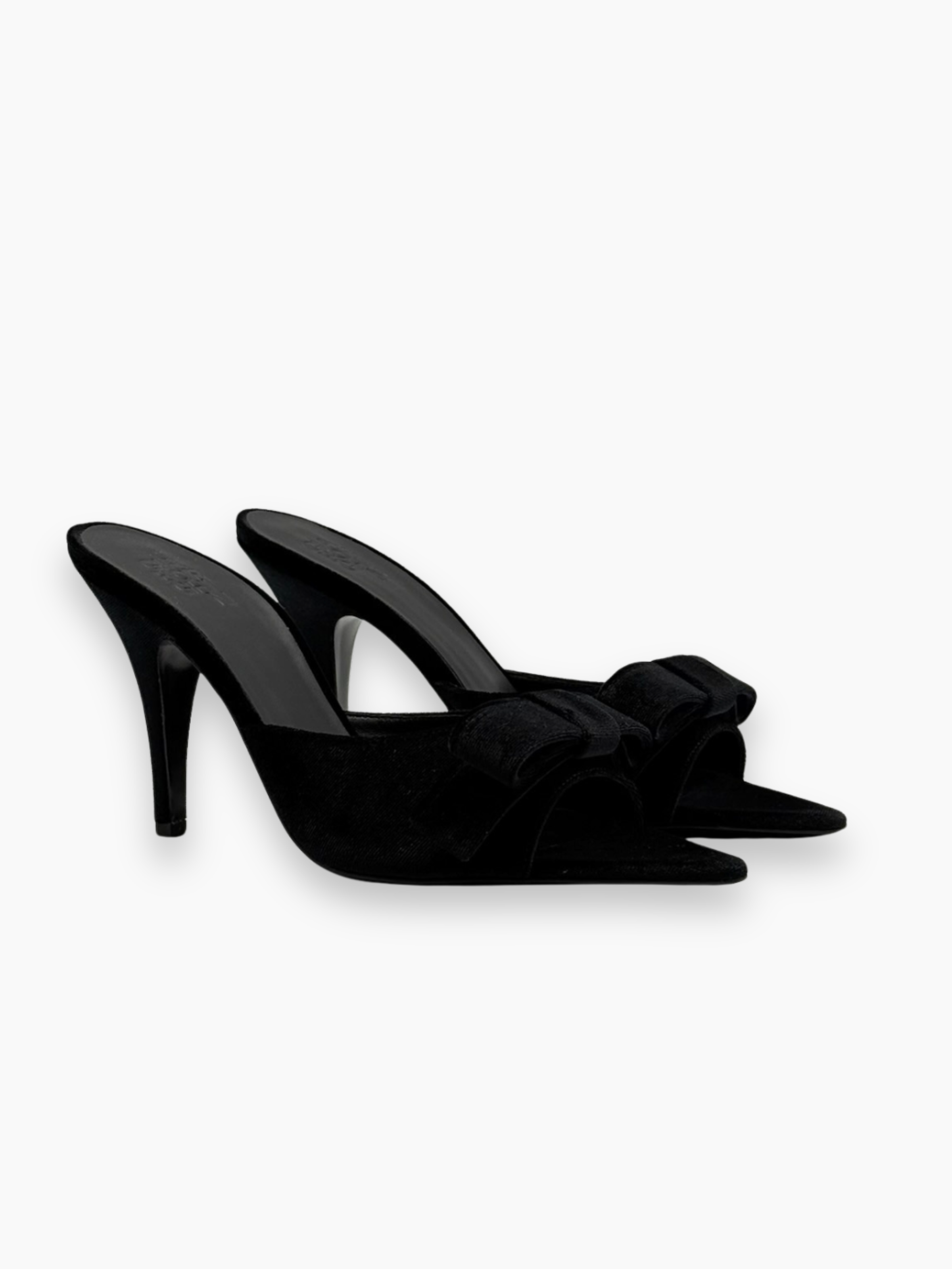 Refined black velvet mules with a bow, featuring an elegant silhouette with a pointed toe and a thin medium heel. The shiny velvet adds sparkle and character to the style, making them the ideal choice for evening looks, sophisticated outfits, or special events.