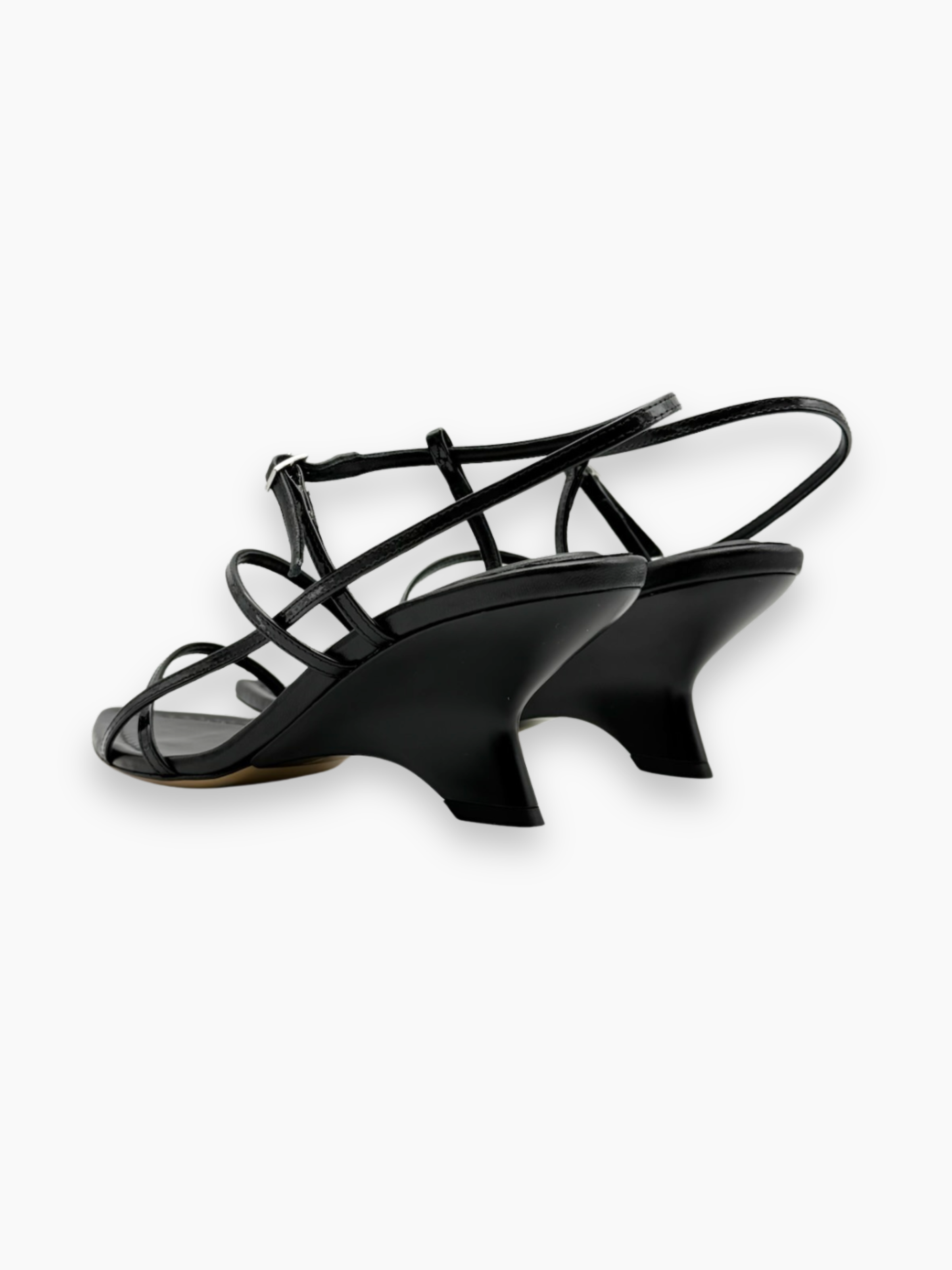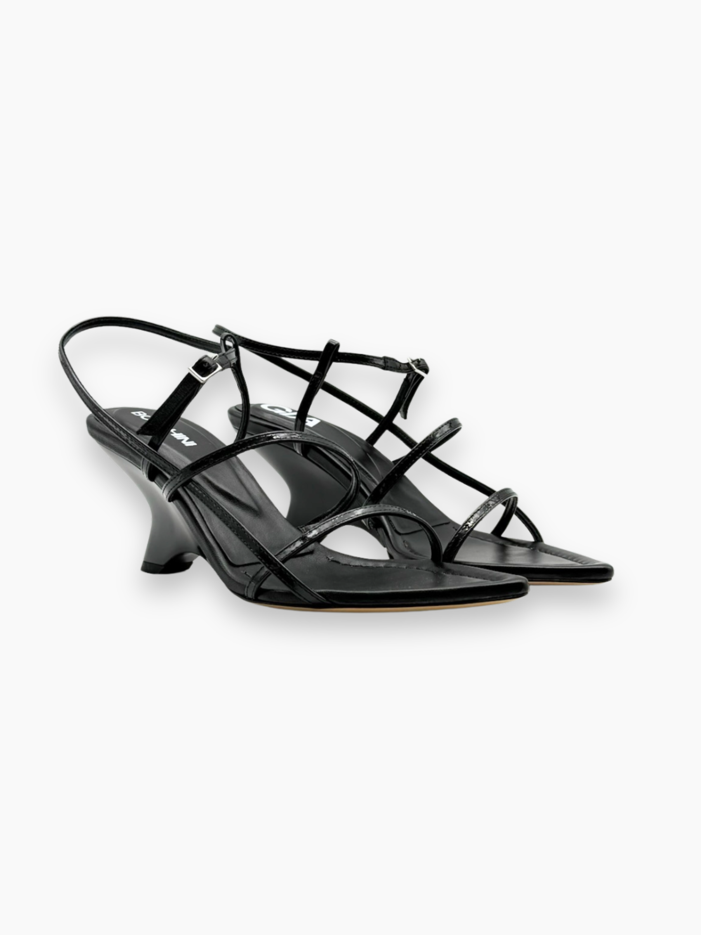 Gia Borghini sandals crafted from black leather, featuring thin crisscross straps and an elegant sculptural heel. A refined and contemporary style, perfect for adding a sophisticated touch to evening or special occasion looks.