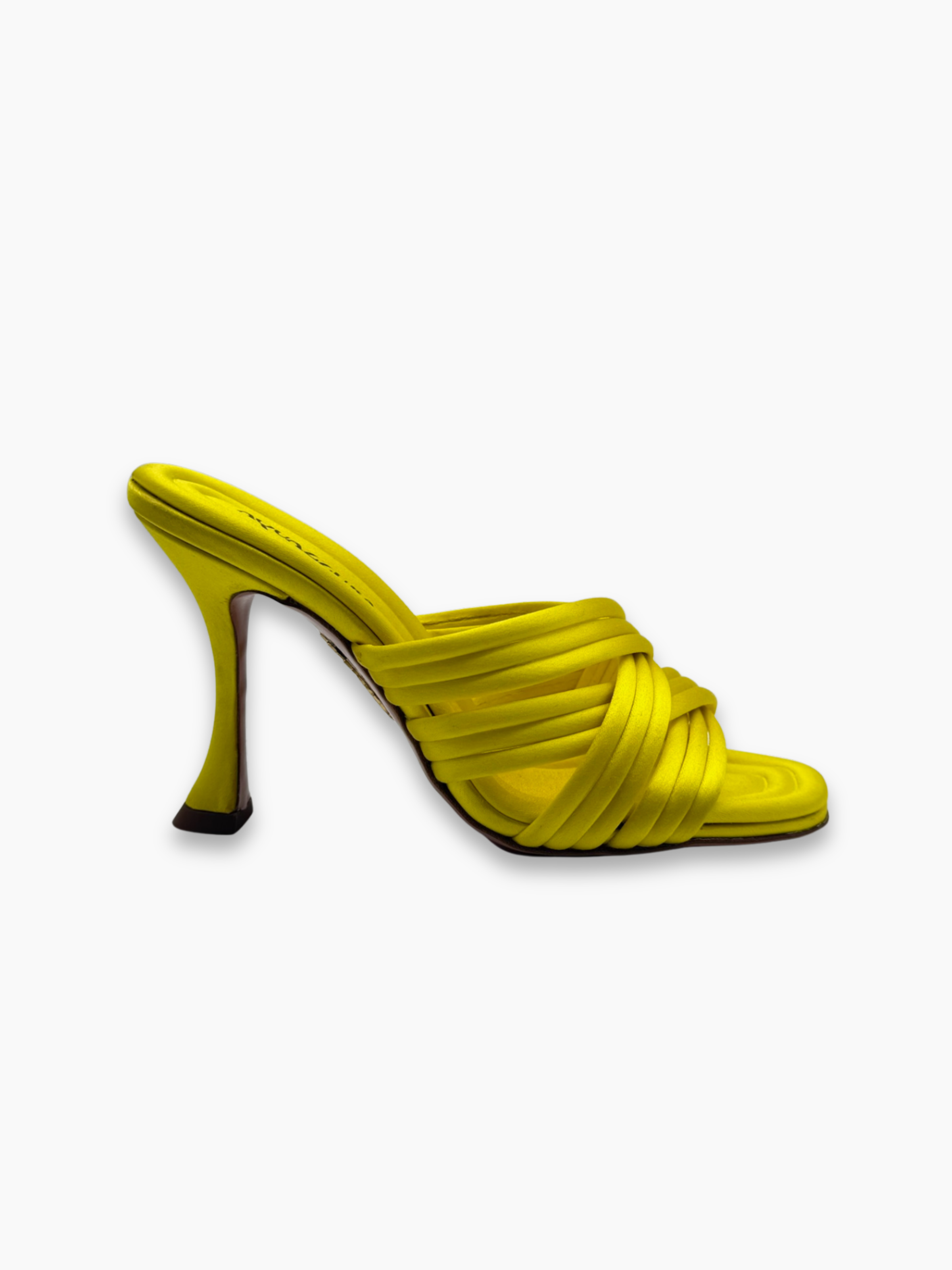 Yellow satin sandals with a woven strap design and high heel. The open-toe style, with its bright and modern style, combines femininity with bold character. Perfect for adding a pop of color and sophistication to evening looks and special events.
