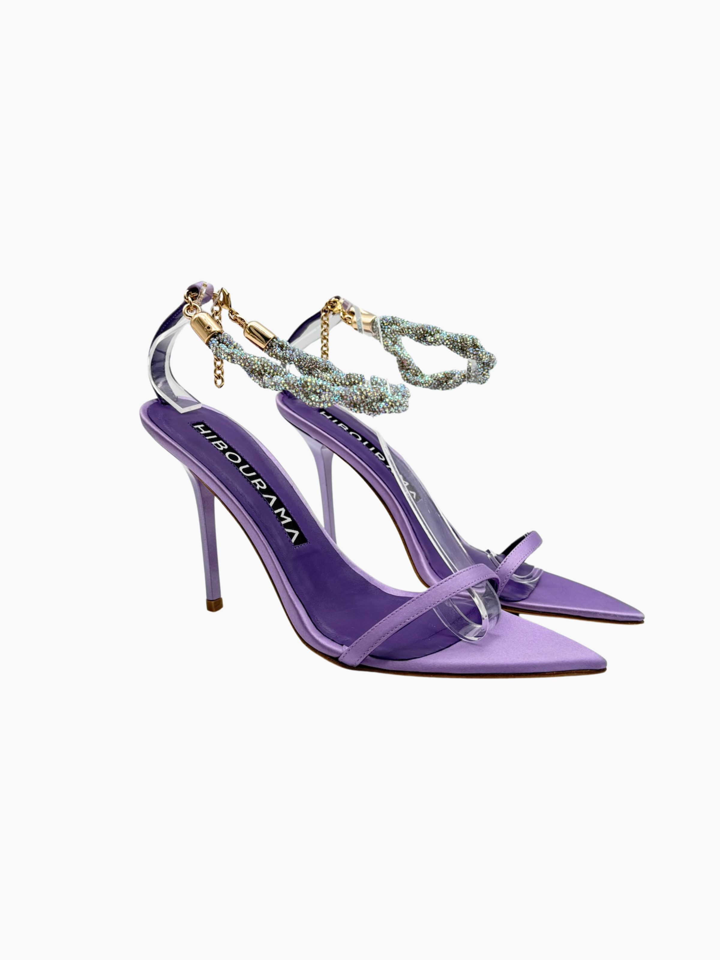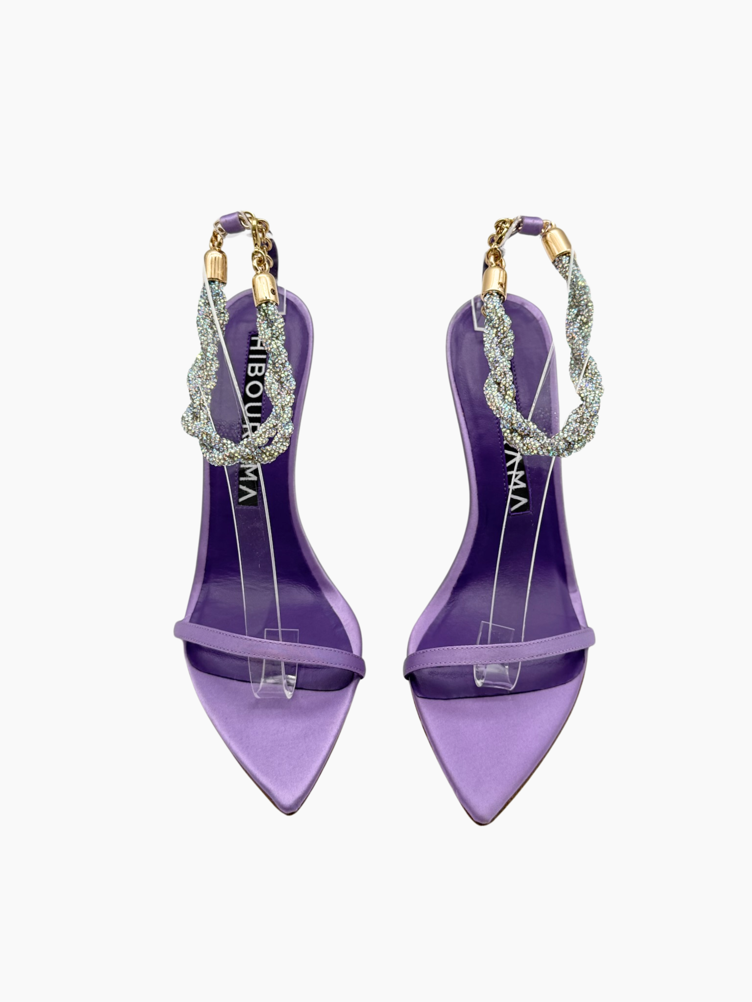 Enhance every look with a pop of color and sparkle thanks to the lilac satin Sandra sandals. The tapered silhouette with pointed toe and slim heel slims the figure, while the jeweled ankle strap lends a glamorous allure perfect for special occasions. The shimmering satin and lilac hue make this style a standout piece in your evening wardrobe.