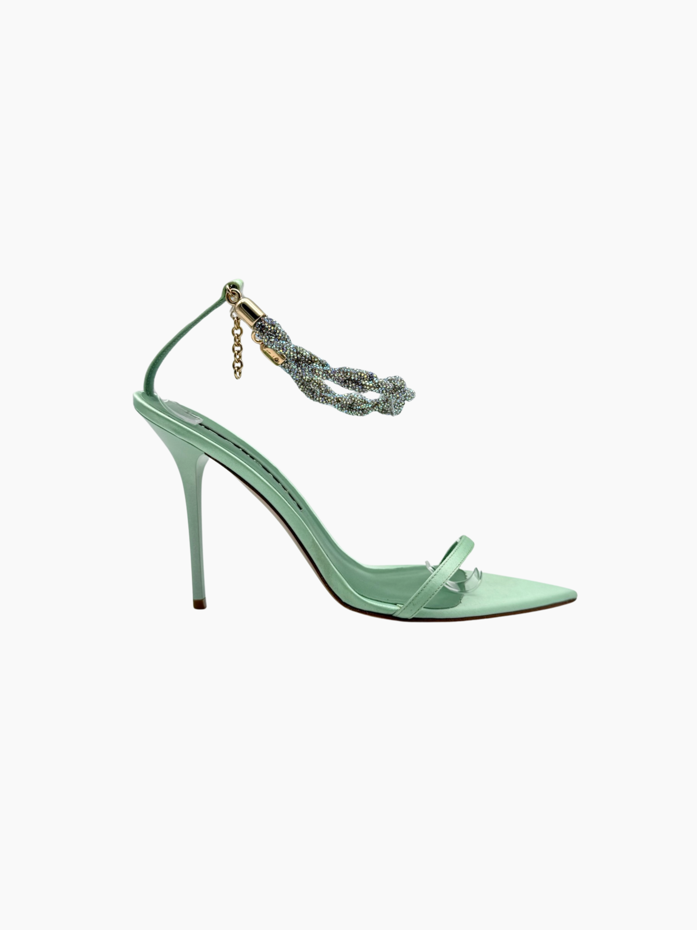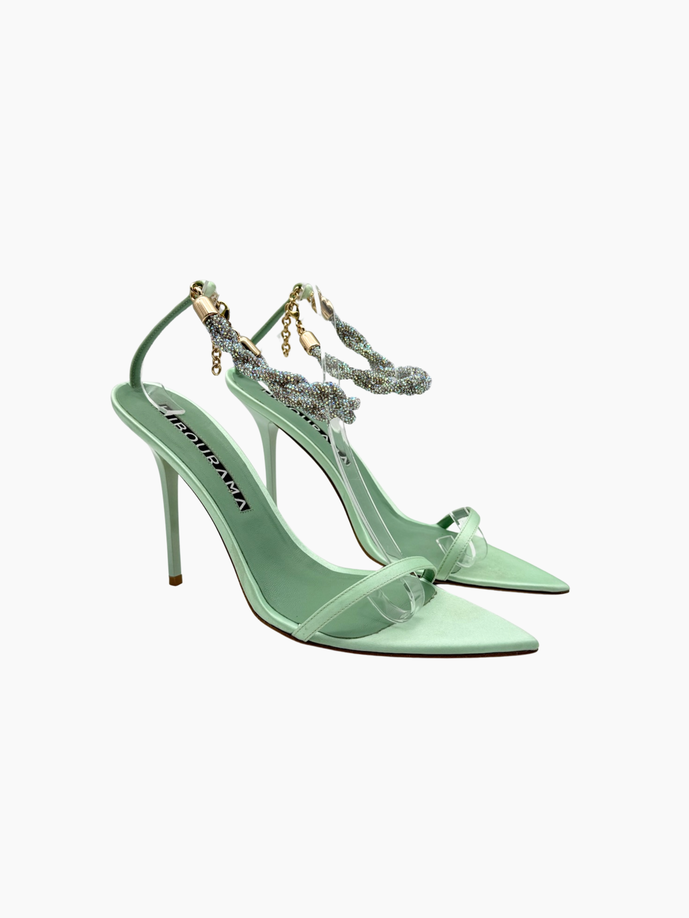 Crafted from elegant light green satin, these stiletto sandals from Hibourama stand out for their simple lines and jeweled ankle detail. The tapered silhouette with pointed toe and minimal strap gives the foot a refined and slender look, perfect for an evening look or a special occasion. The ideal accessory to shine in style.