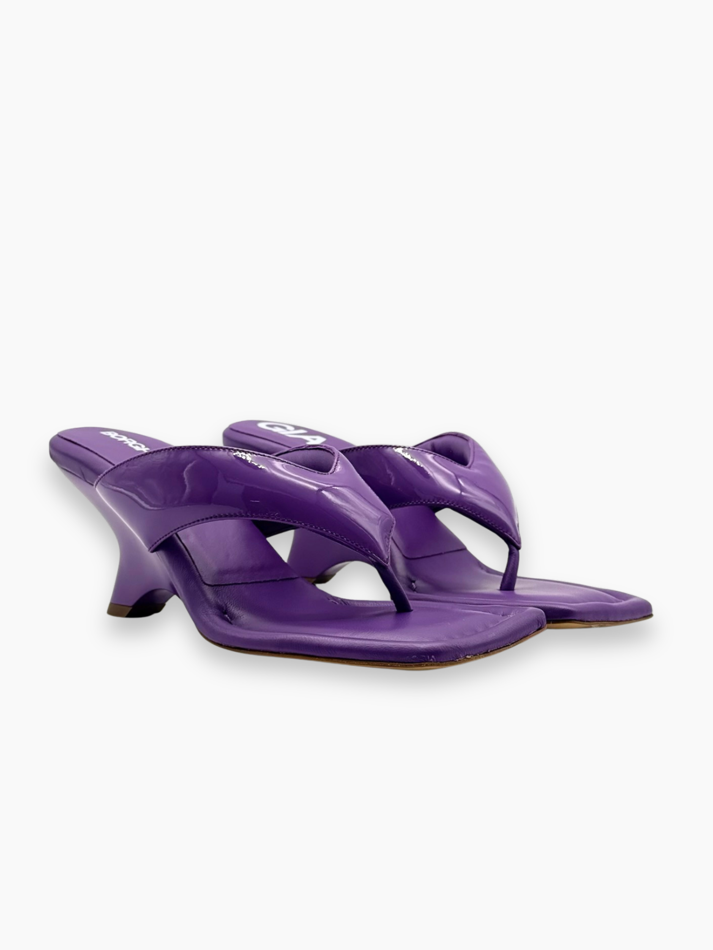 Sandali viola firmati Gia Borghini, caratterizzati da un design con infradito e tacco scultoreo di ispirazione architettonica. Realizzati in pelle verniciata, presentano una silhouette moderna con punta squadrata e un effetto lucido che dona luminosità al look. Perfetti per aggiungere un tocco di colore e stile ai tuoi outfit estivi.