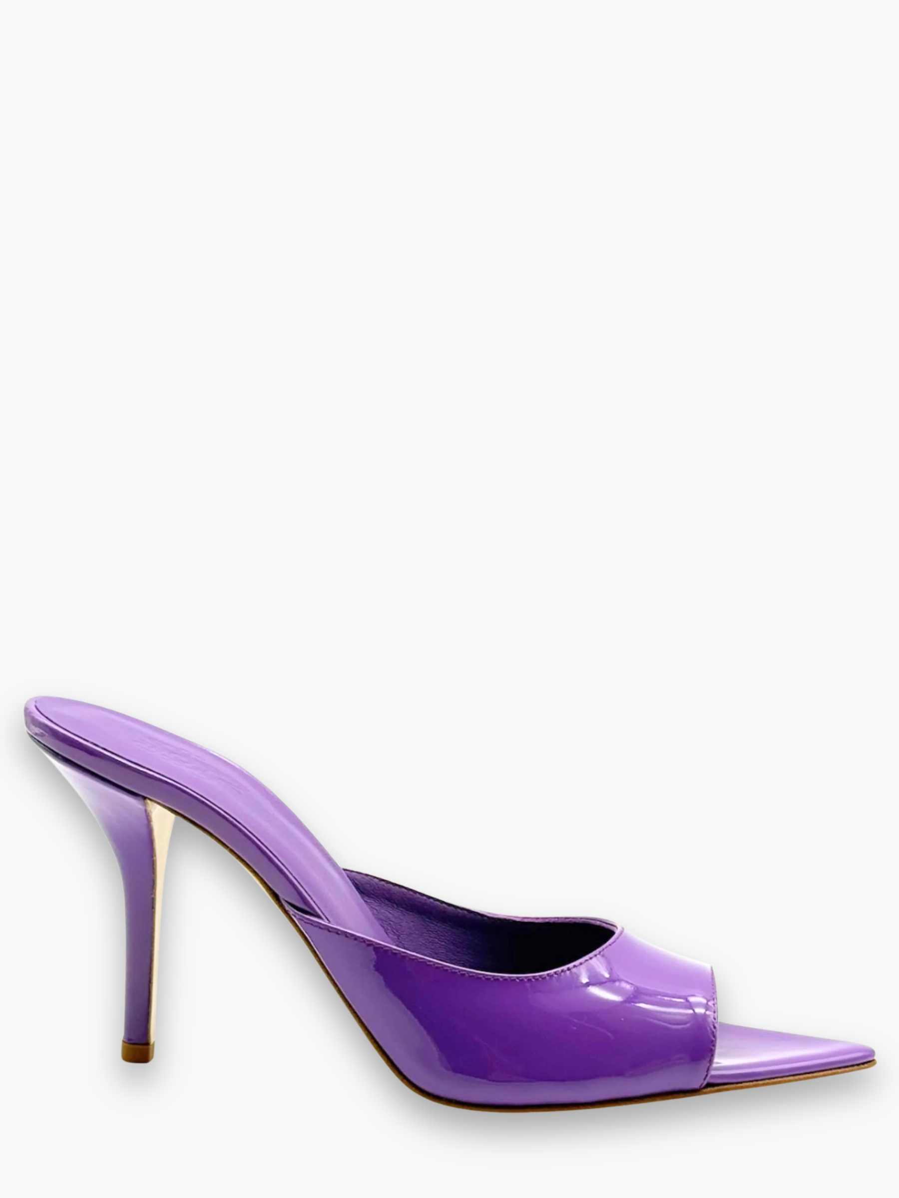 Elegant mules crafted from glossy purple patent leather, featuring a pointed toe and a slim stiletto heel that slims the silhouette. A sophisticated and colorful style, perfect for adding a touch of glamour to evening looks or more sophisticated outfits.