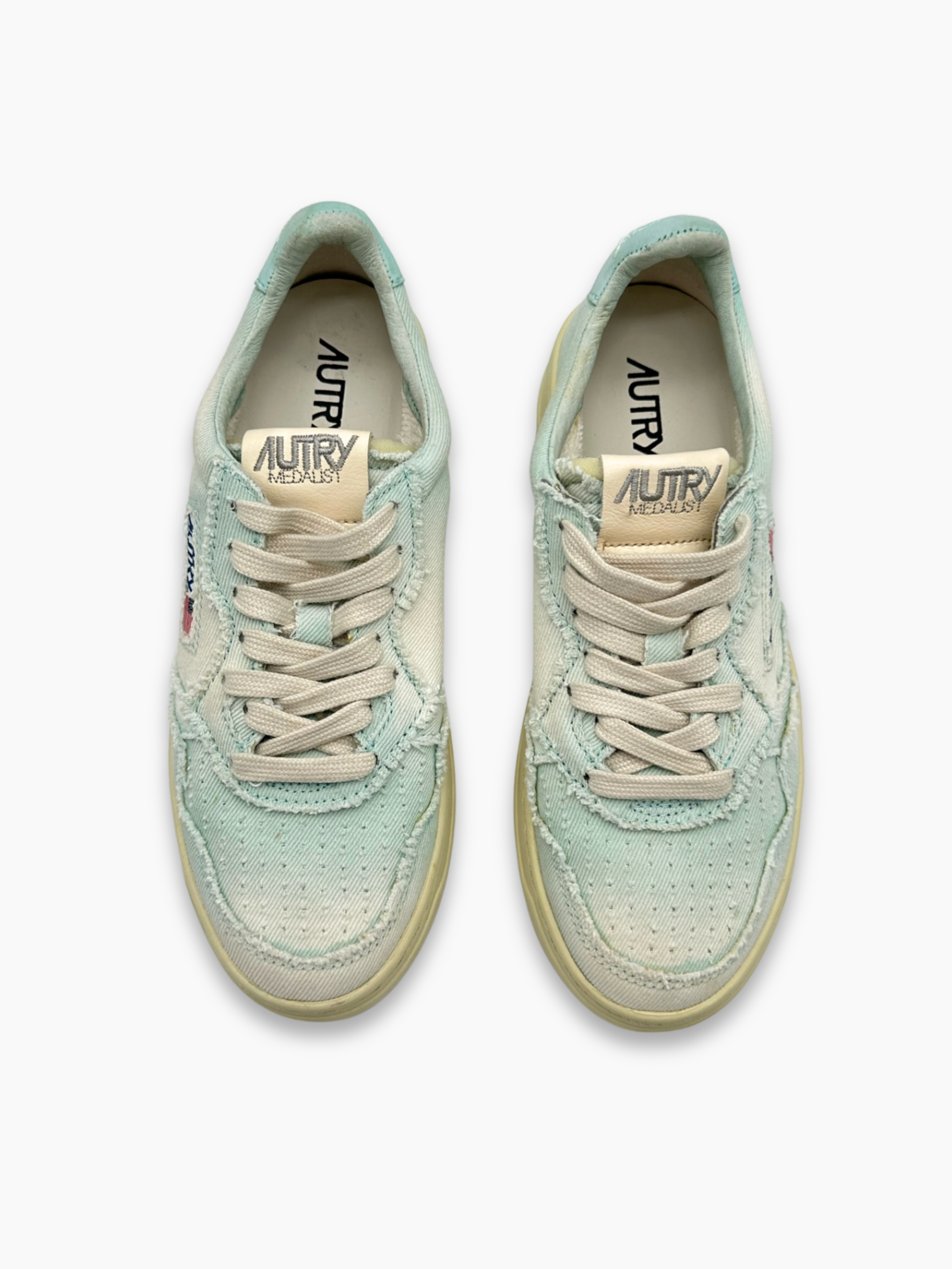 Autry Low 01 sneakers in washed-effect canvas with a light blue finish and frayed details for a lived-in, contemporary look. The Medalist's retro design is paired with a cream-colored sole and a sewn-on US flag logo on the side, for the perfect blend of sporty heritage and urban style.