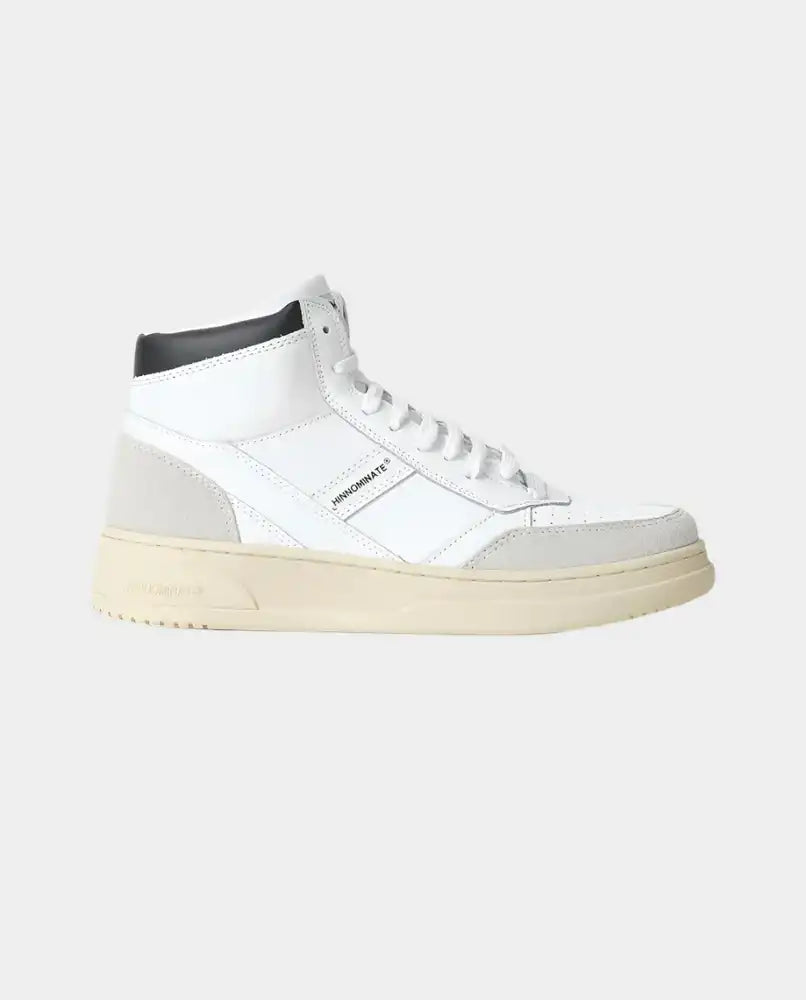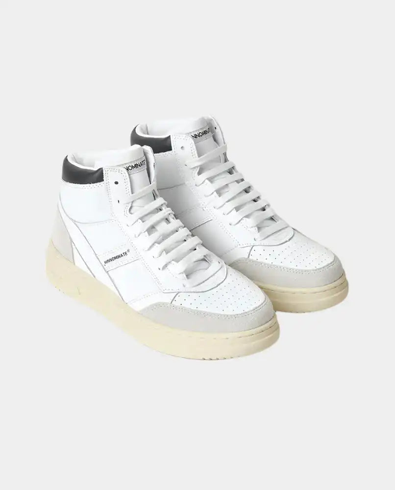 High-top sneakers by Hinnominate, made of action leather with suede inserts. The sporty design is enhanced by the black detail on the ankle collar and the side logo, for a bold and urban aesthetic.