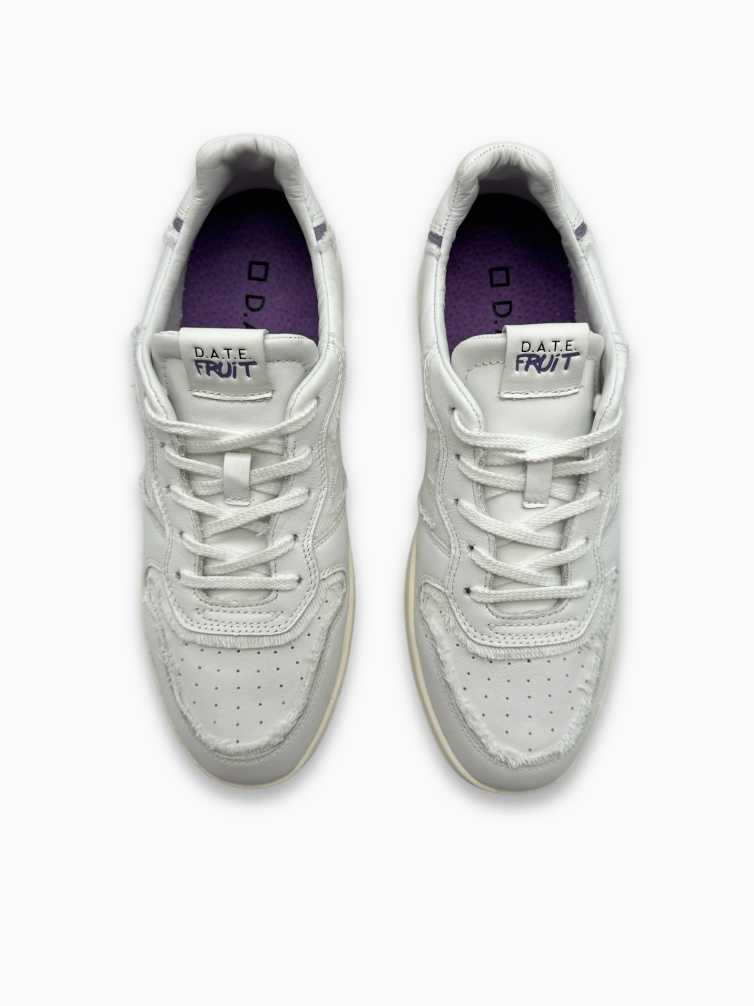 These white sneakers with purple soles are part of the DATE Fruit capsule collection, a fresh and playful edition that combines minimalism and colorful details. Crafted from leather with suede inserts, they stand out for the small grape print on the heel, a nod to the collection's theme. Ideal for a casual yet refined look, they're perfect for everyday wear with a touch of originality.