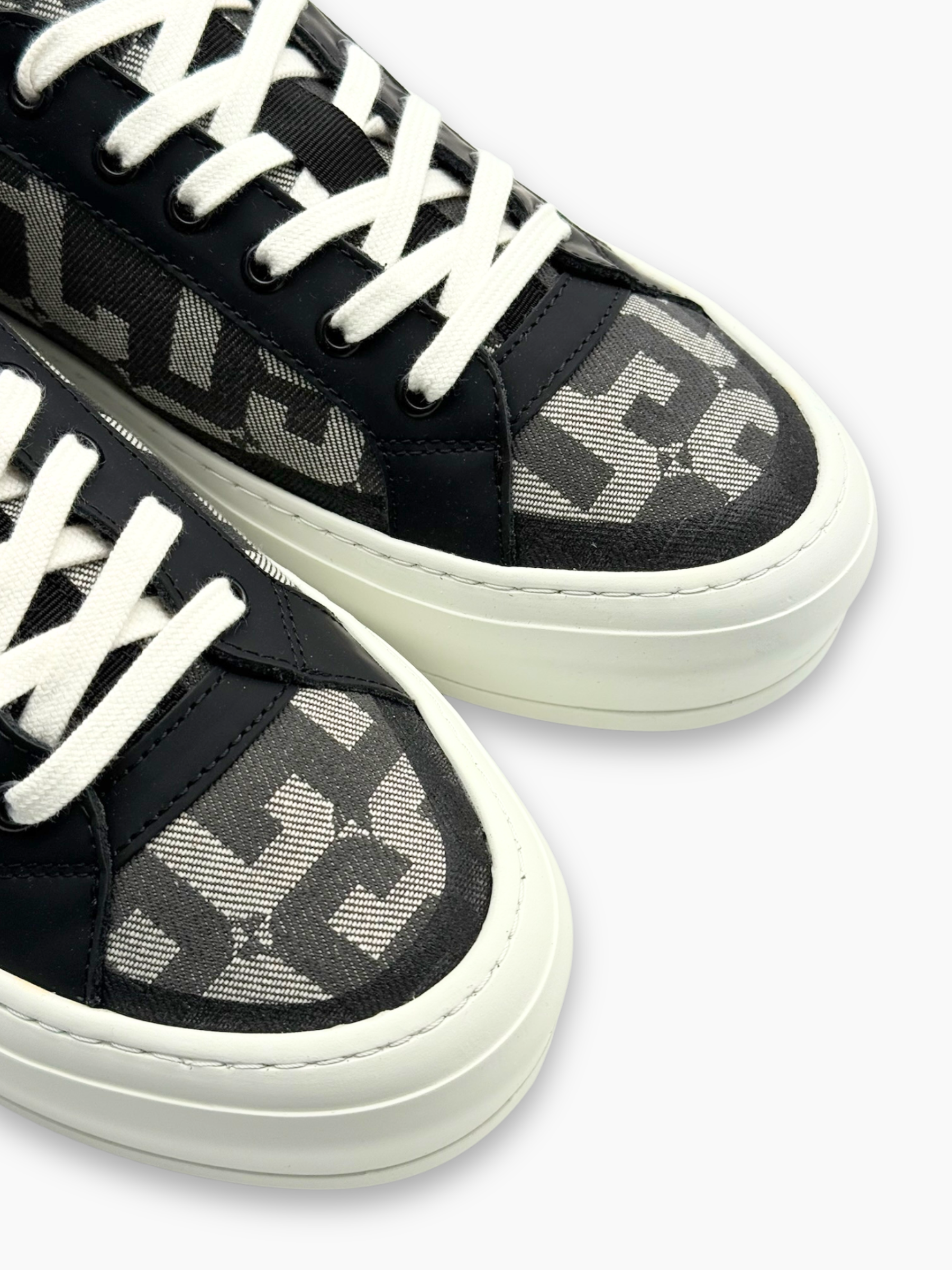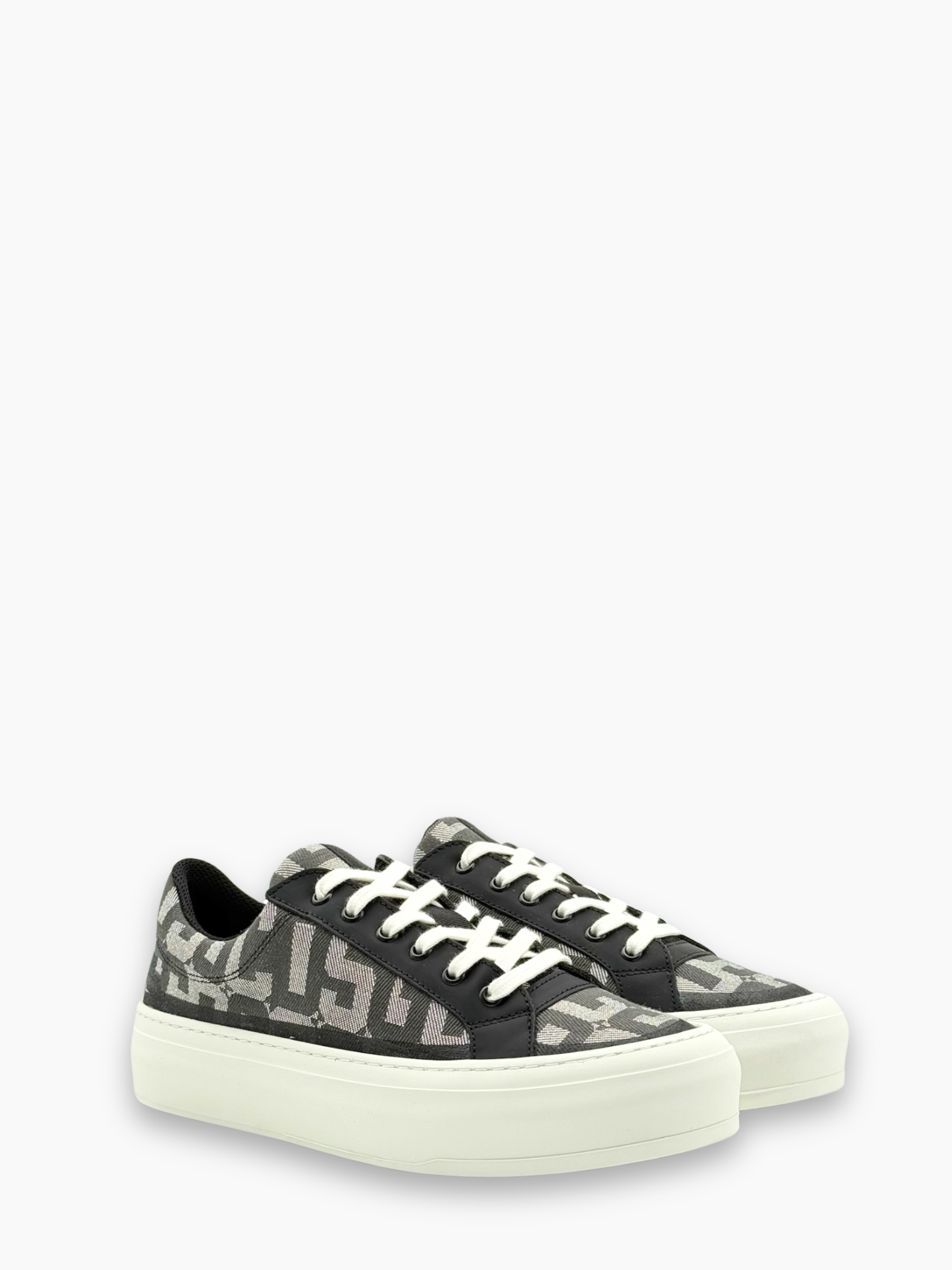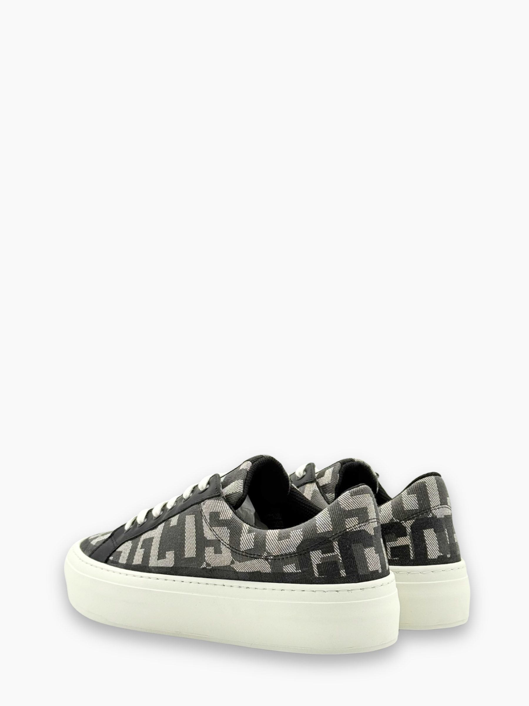 Sneakers in tela monogram GCDS dal look moderno e versatile, caratterizzate da una tomaia leggera con logo all-over in tonalità grigio e nero. I dettagli in pelle liscia aggiungono struttura e ricercatezza, mentre la suola platform in gomma bianca garantisce comfort quotidiano e un’estetica contemporanea. Perfette per completare outfit casual, streetwear e urban.