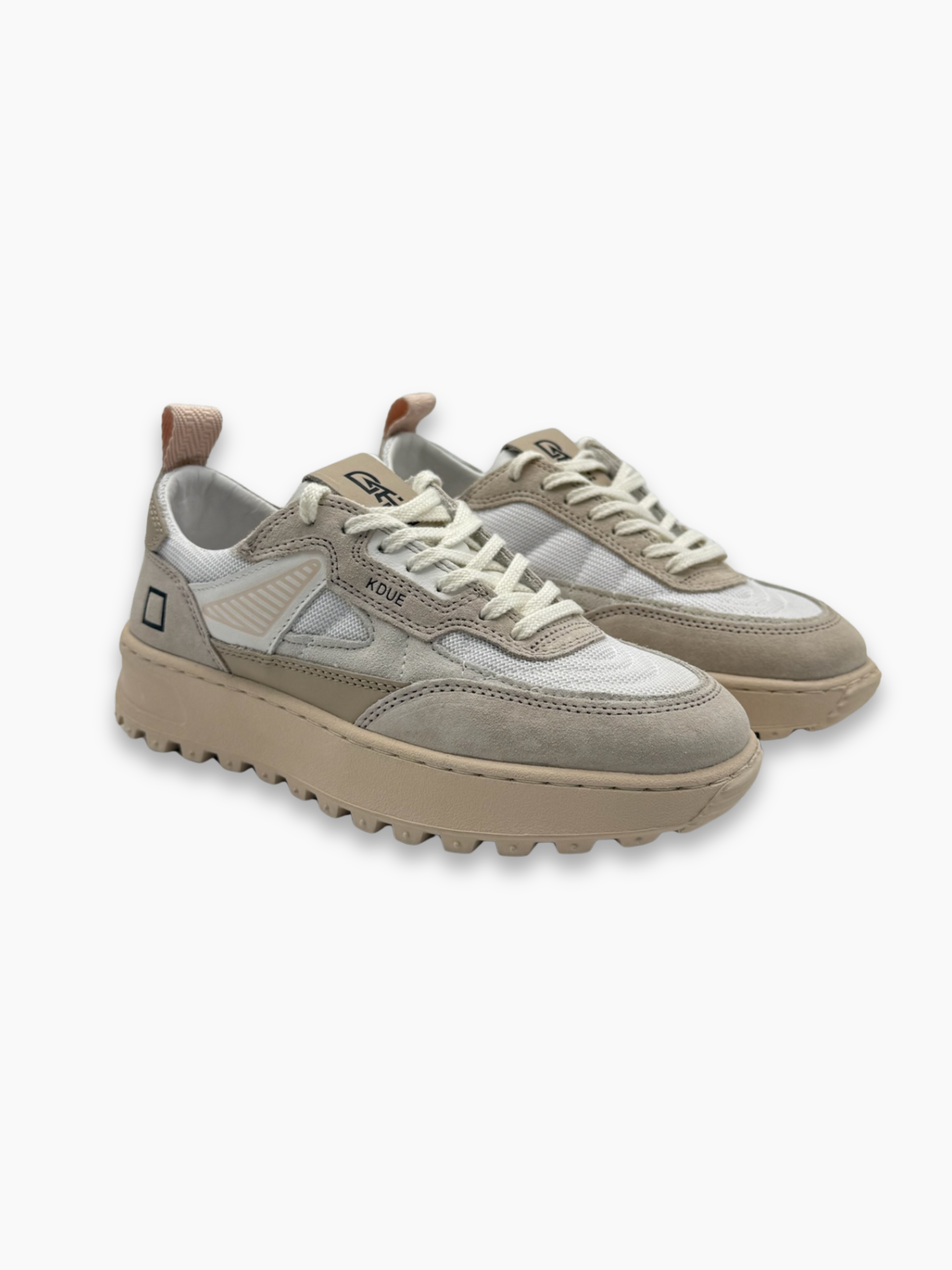 DATE sneakers in fabric and suede with a white base and beige inserts, embellished with pink details on the heel. A chunky model with a thick sole and a serrated tread, perfect for a modern and dynamic look without sacrificing comfort.