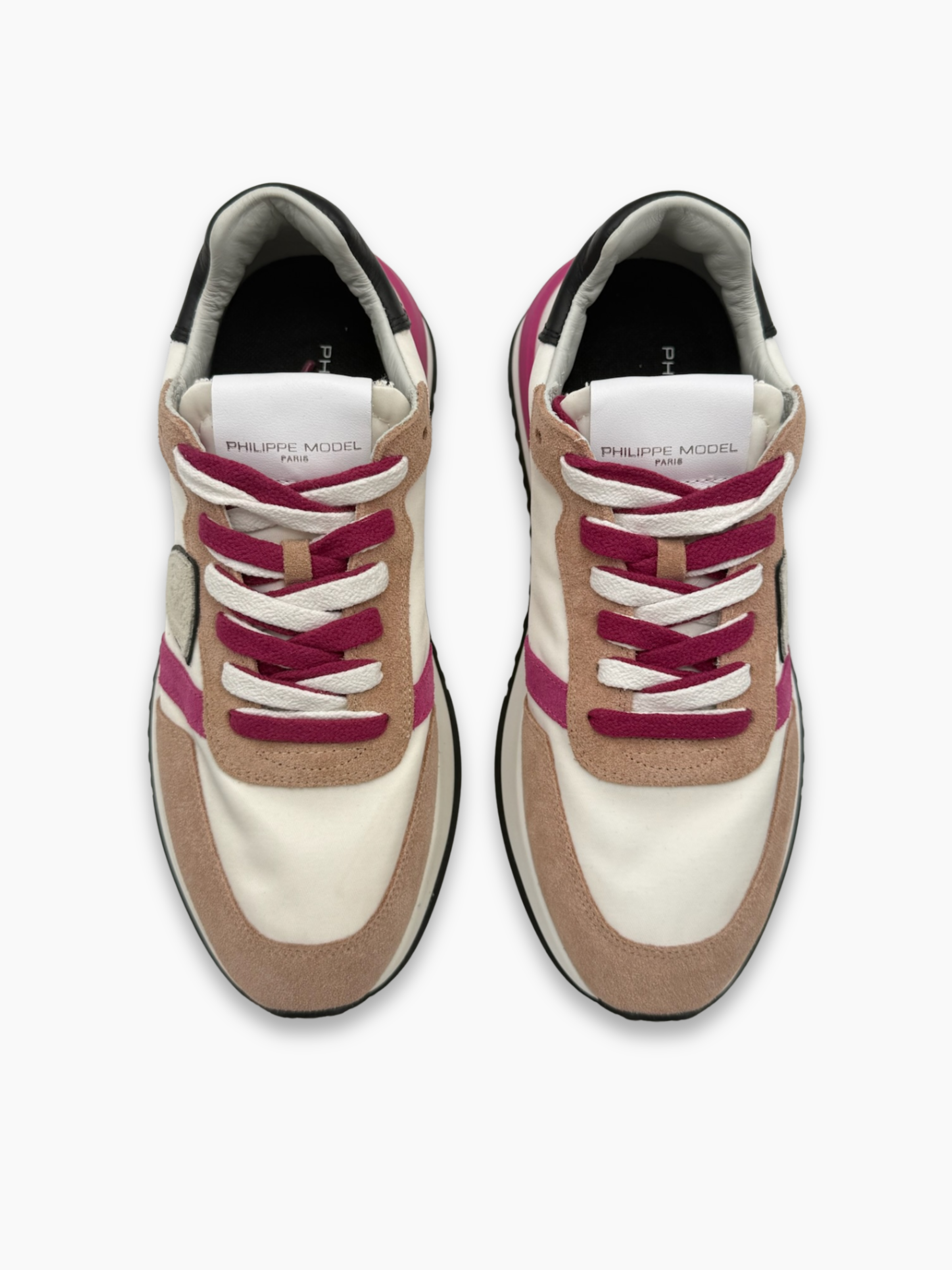 Philippe Model running-style sneakers in leather, suede, and technical fabric. The upper combines white, pink, and beige with contrasting details and a side logo. The lightweight rubber sole makes them perfect for everyday wear, combining comfort and sporty-luxury style.