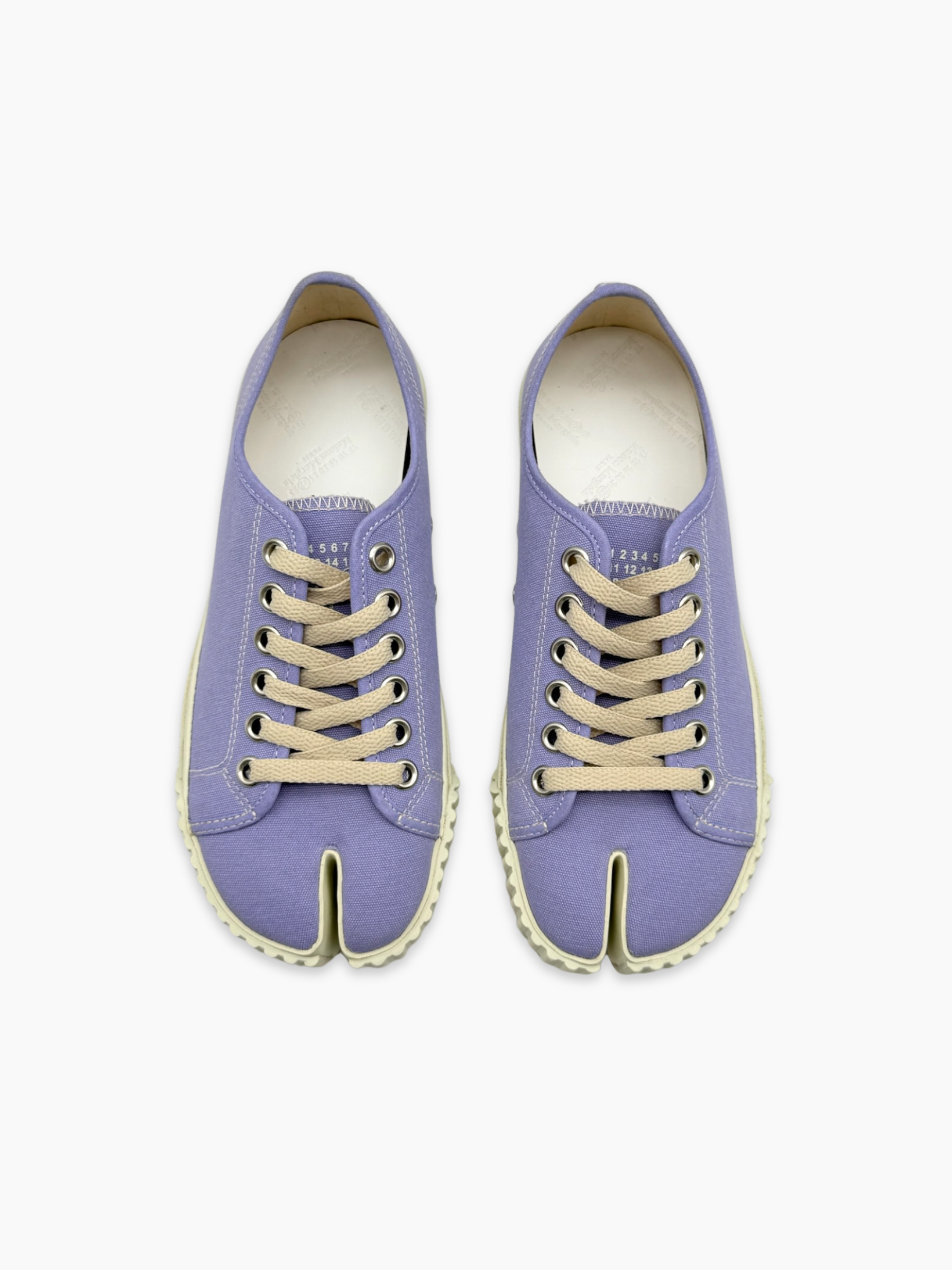 A deconstructed icon with a pop twist: Maison Margiela's Tabi sneakers are back in a lightweight and colorful version, perfect for the warmer months. Crafted from lilac canvas with exposed stitching and a light-colored rubber sole, they maintain the signature split-toe design that has made them a cult classic. Contrasting laces and a low-top silhouette create a casual yet sophisticated look.